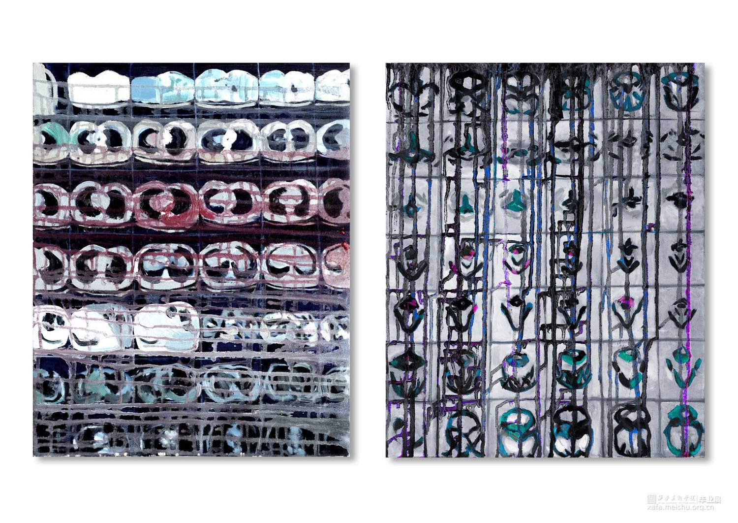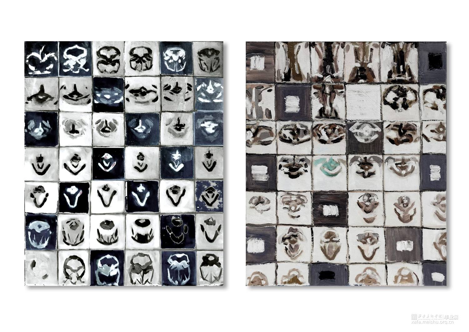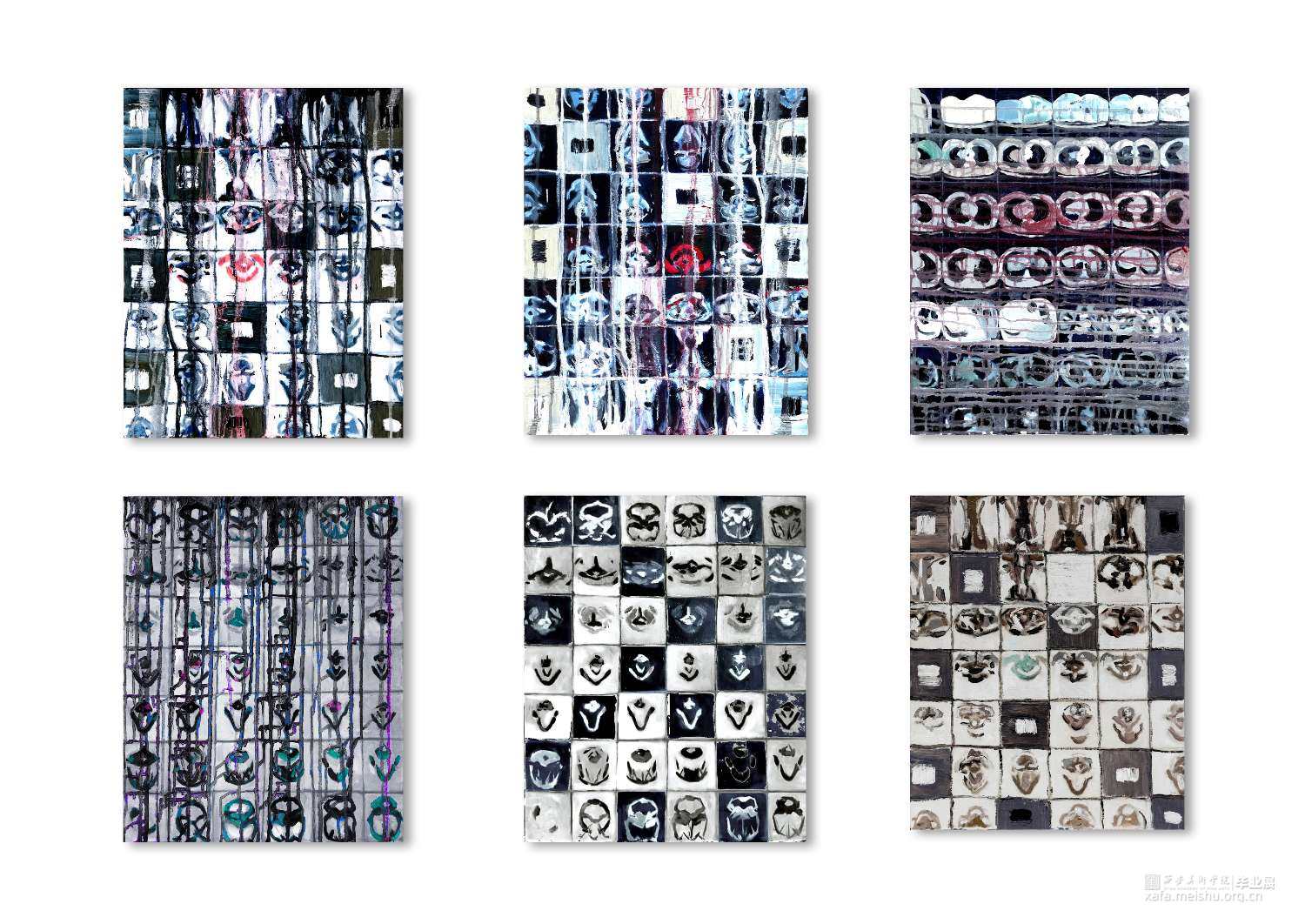 我的创作是以CT图为基本型,把其中的图案进行强化,把现实表象转化为画面上的图案,不是单纯的去临摹照抄。用方格的形式去绘制图案,在颜色上进行统一,并在一些图案上加上一些颜色进行点缀并做几张了不同颜色的各式效果。先是几张基础的图画,而后在其基础进行二次创作,强化CT图中的图案,对图案进行大胆的整理,对底片颜色的进行整合,其中几张参照CT图的基础上用松节油和调色油调制的颜料在画面制作了一些流淌的肌理效果,意为表达内心的加剧的伤痛与无奈。大体的颜色选用灰蓝为底色,图样颜色选择白和一点点的红绿色,在肌理效果上选用灰色和红色的交替,使得画面更加饱满丰富。