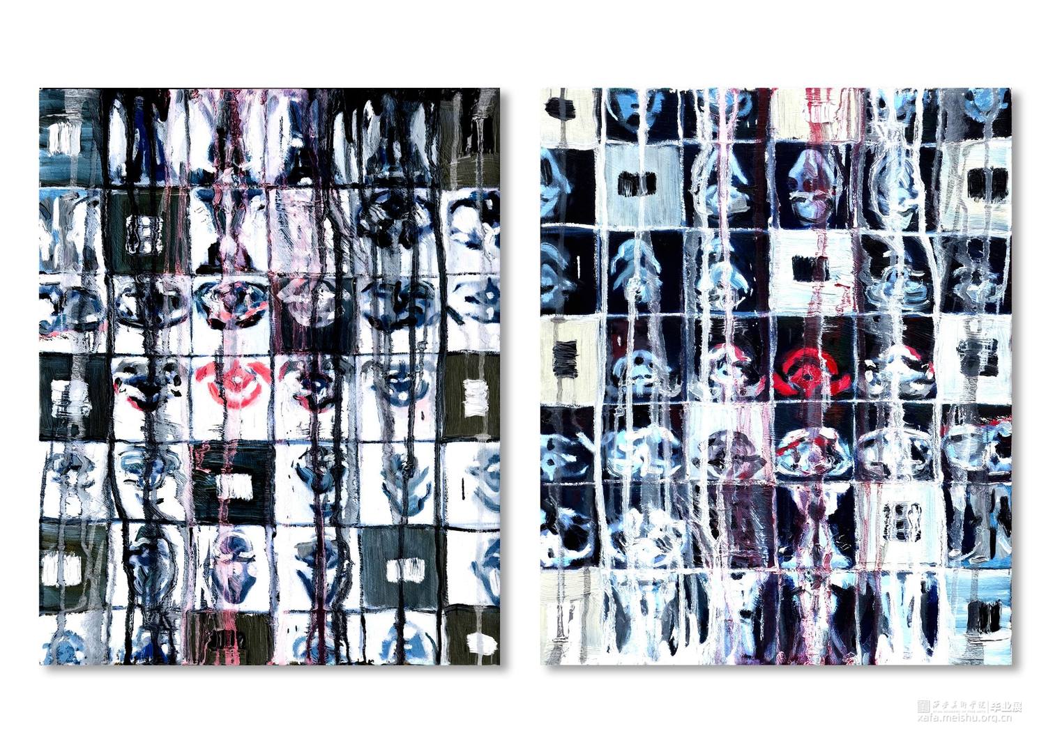作品是根据家人的螺旋CT图为基础进行的创作。材料为油画颜料。其中的几张为参照CT图进行绘制,强化了其中的图案,表达了在当代绘画中图像与绘画之间的转换。强化CT图中的图案,对图案进行大胆的整理,对底片颜色的进行整合,其中几张参照CT图的基础上用松节油和调色油调制的颜料在画面制作了一些流淌的肌理效果,意为表达内心的加剧的伤痛与无奈。大体的颜色选用灰蓝为底色,图样颜色选择白和一点点的红绿色,在肌理效果上选用灰色和红色的交替,来表达对病痛的忧伤和无奈的感觉。