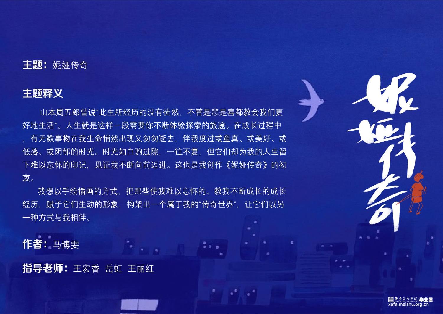 山本周五郎曾说“此生所经历的没有徒然,不管是悲是喜都教会我们更好地生活”。人生就是这样一段需要你不断体验探索的旅途。在成长过程中,有无数事物在我生命悄然出现又匆匆逝去,伴我度过或童真、或美好、或低落、或阴郁的时光。时光如白驹过隙,一往不复,但它们却为我的人生留下难以忘怀的印记,见证我不断向前迈进。这也是我创作《妮娅传奇》的初衷。