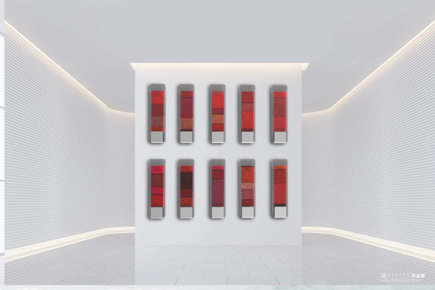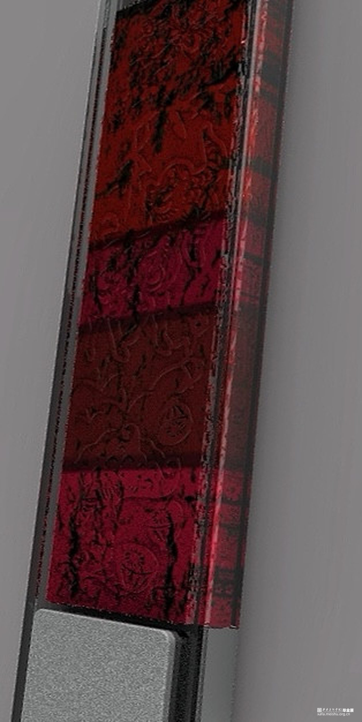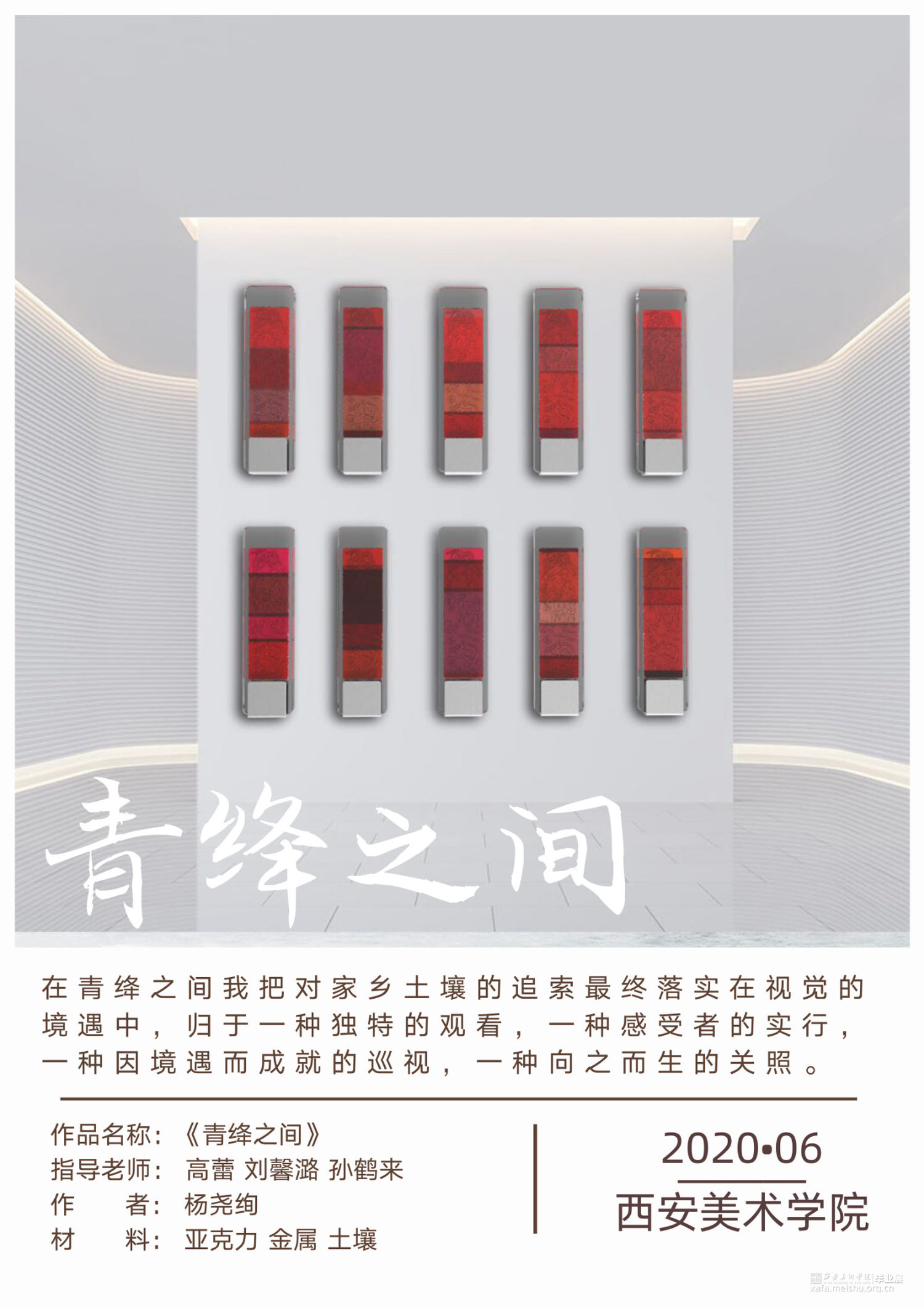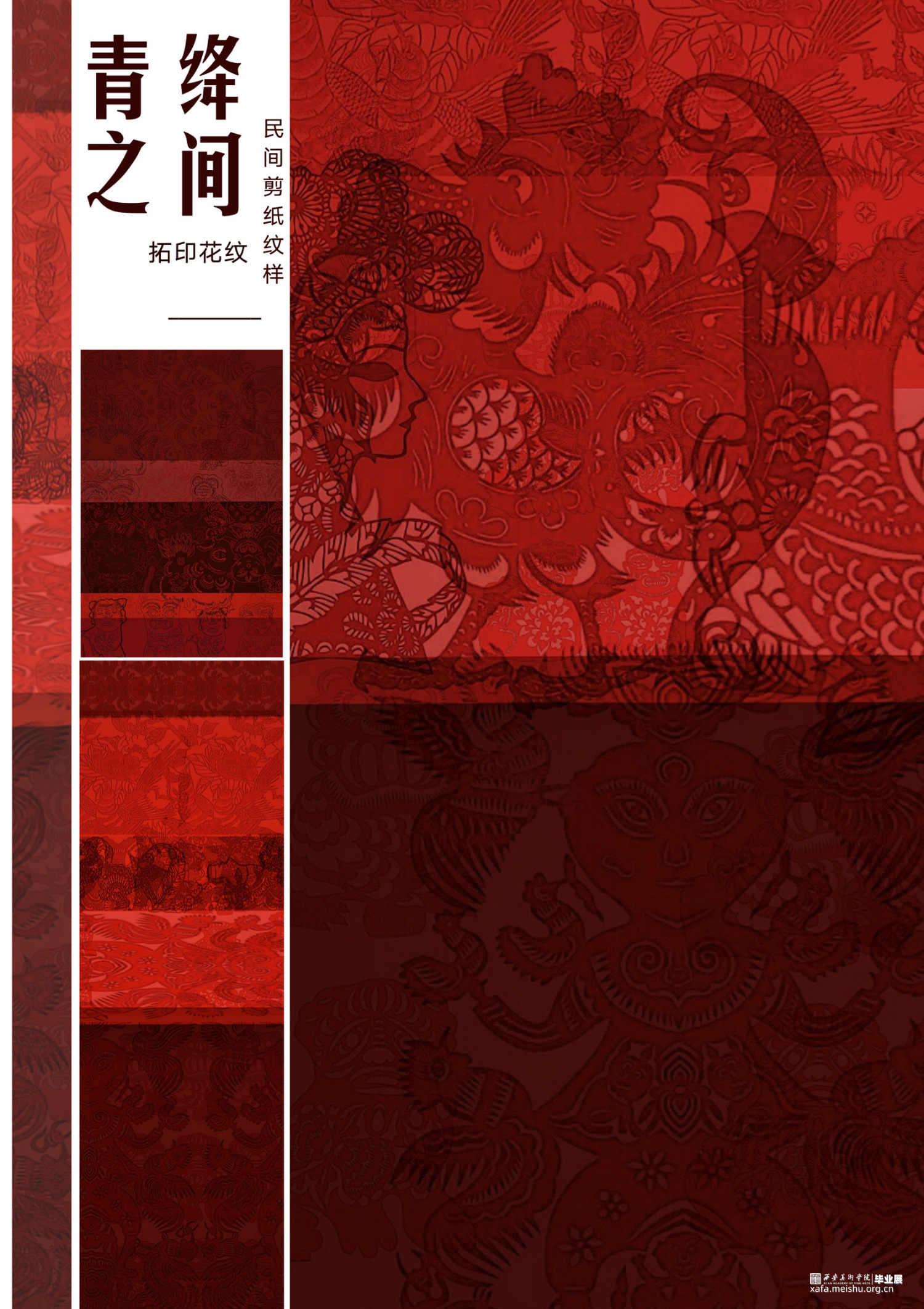 在青绛之间我把对家乡土壤的追索最终落实在视觉的境遇中,归于一种独特的观看,一种感受者的实行,一种因境遇而成就的巡视,一种向之而生的关照。赋予不同饱和度和倾向的红色,在其红色土壤拓印出经过艺术化处理的,流行于陕北民间但又在现代生活中渐渐被遗忘的传统纹样,蕴含着青绛下孕育出来的人生百味、反应这片土地上所承载的人间万象、去找寻慢慢消失在这片土地上值得被看见的东西。因为我们所生活的这片土地有着太多过去、现在、将来的回忆、把握与期许。从家乡陕北出发,去探寻、把握养育我的这片土壤上那些平凡而伟大的美好。