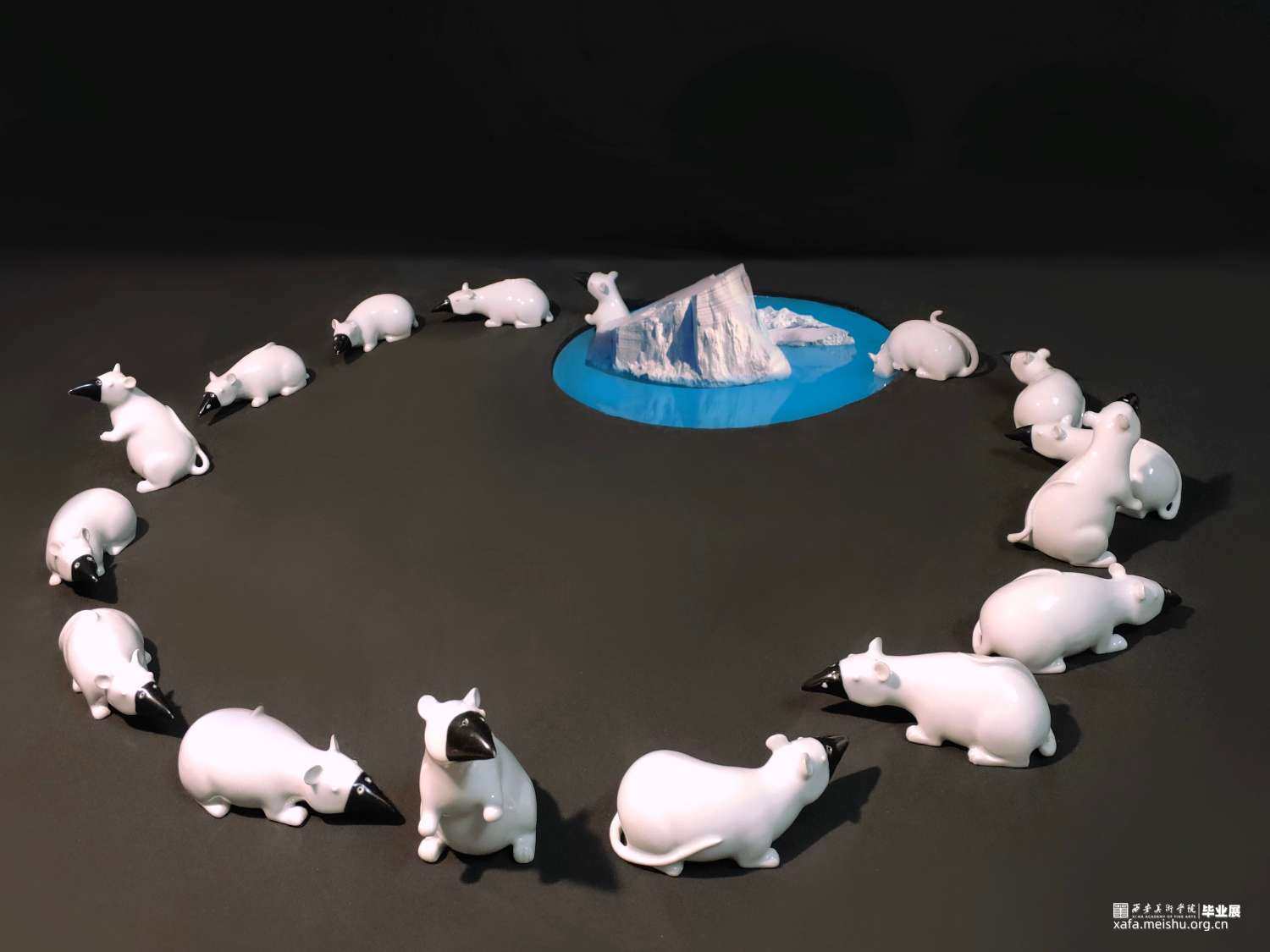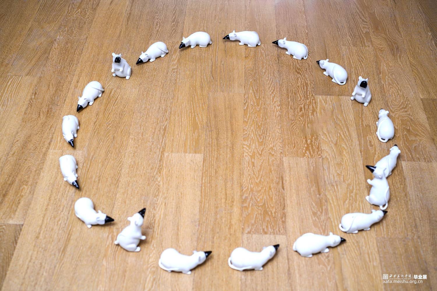 另外黑色背景下的老鼠一共有20只,今年是2020年,更富有纪念意义。还有很重要的一点是名字仅用一个符号的意图,这个符号足以揭示我作品更深层次的内涵,作品的陈列也是有很多圈的元素,譬如老鼠围成的形状,水池的形状,视频里老鼠的运动轨迹。○更是一种循环,周而复始的象征。