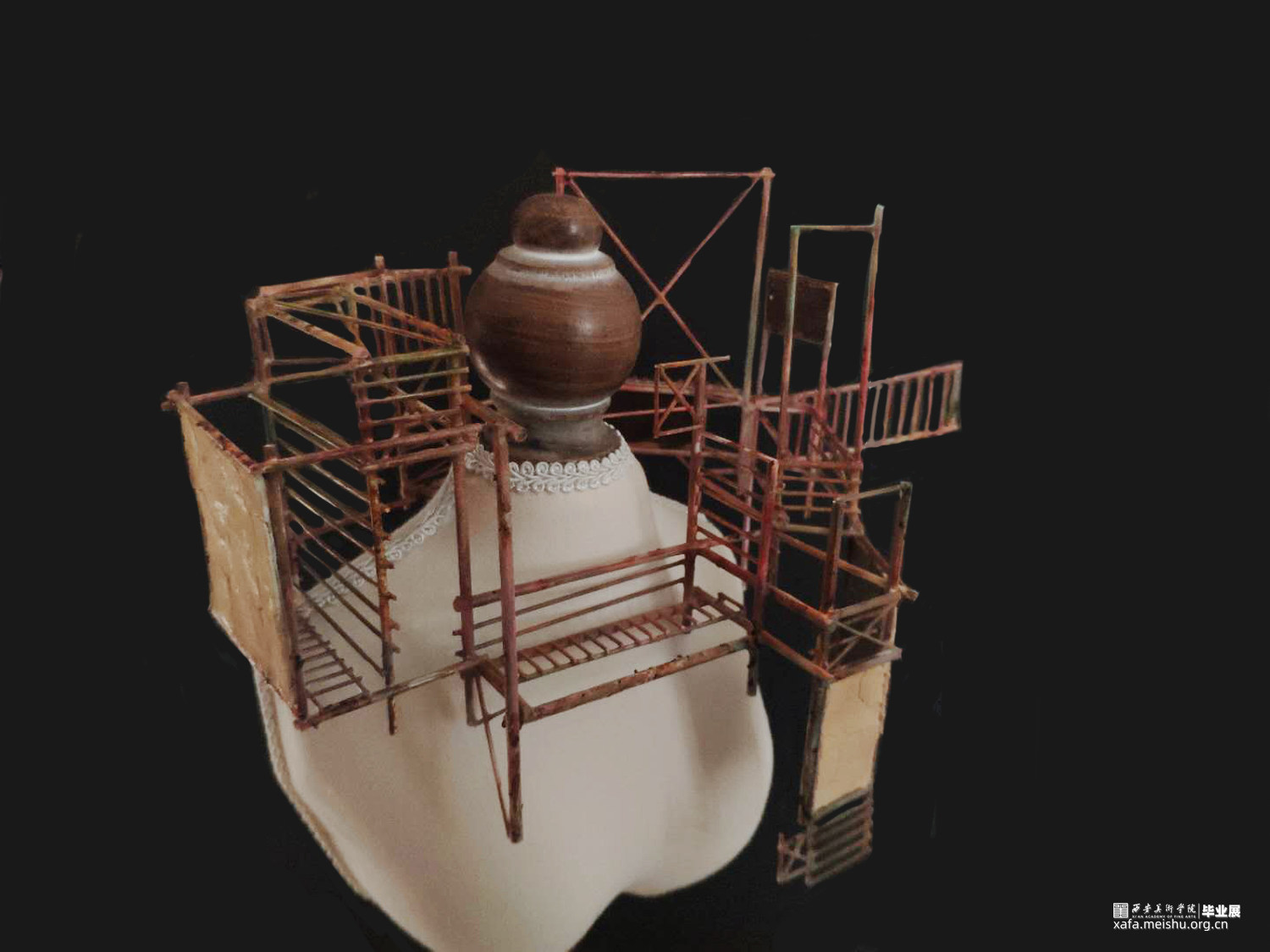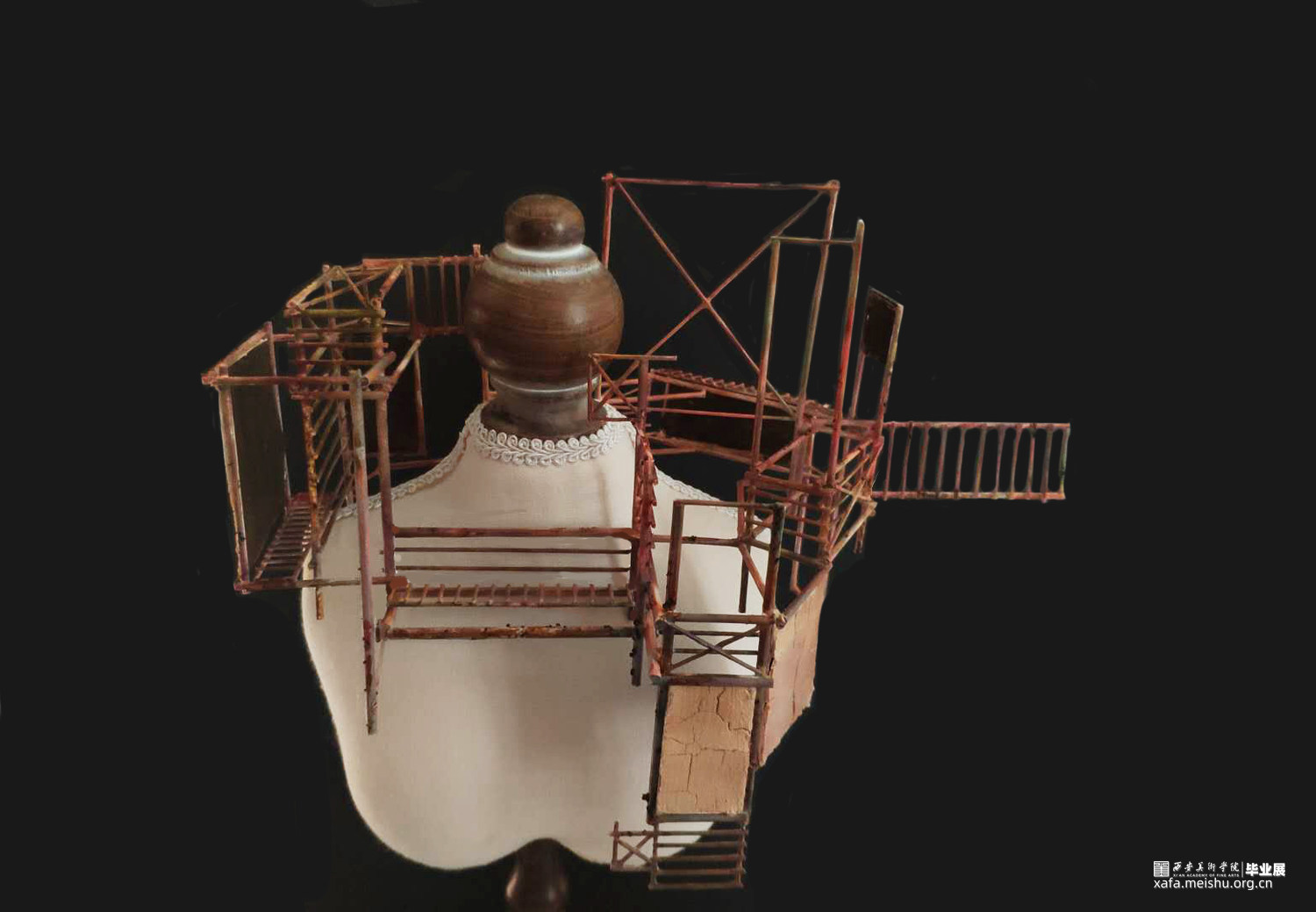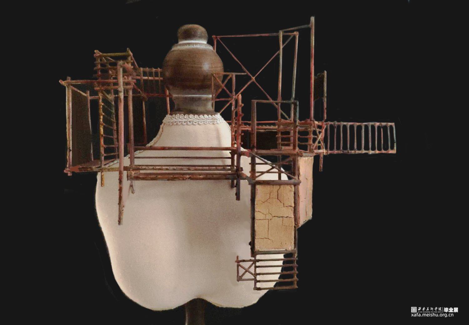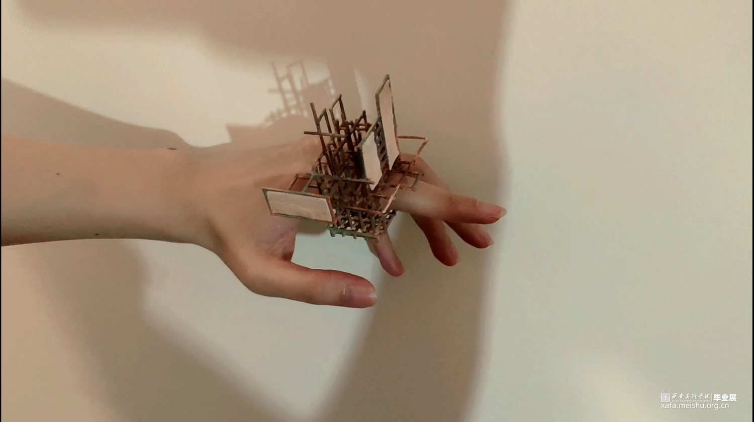 我的作品将建筑作为身体视觉秩序的元素,把观察到的建筑的密集和频繁,还有很多建筑工地使用的锈迹斑斑的脚手架和被拆除的老建筑的残垣断瓦之中冉冉升起了洁白的新墙,进行重新的设计和组合,完成由身体承纳的新建筑丛林美学。
