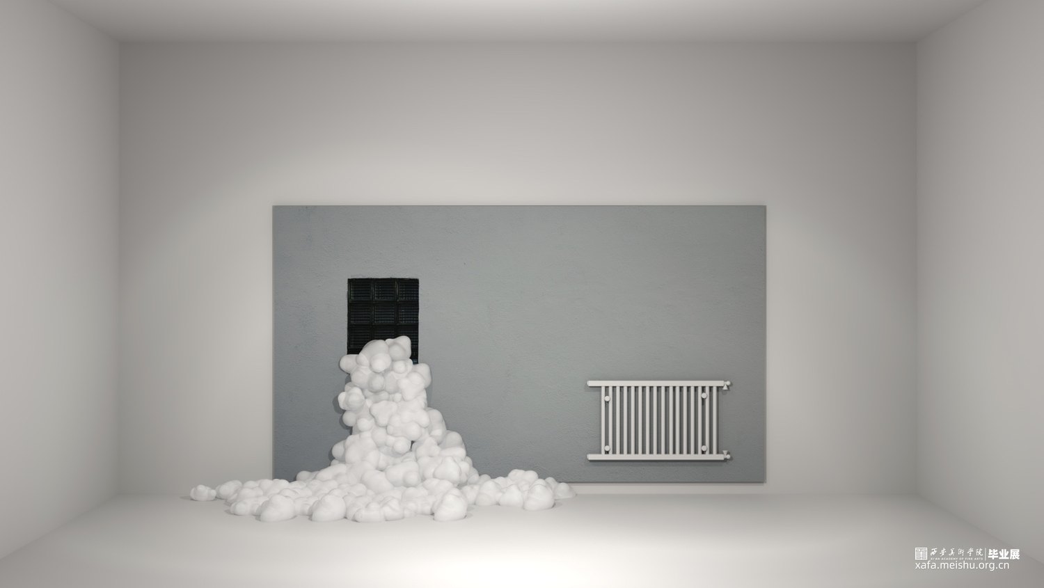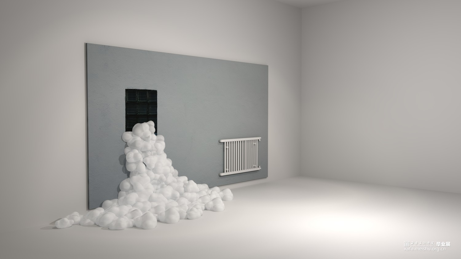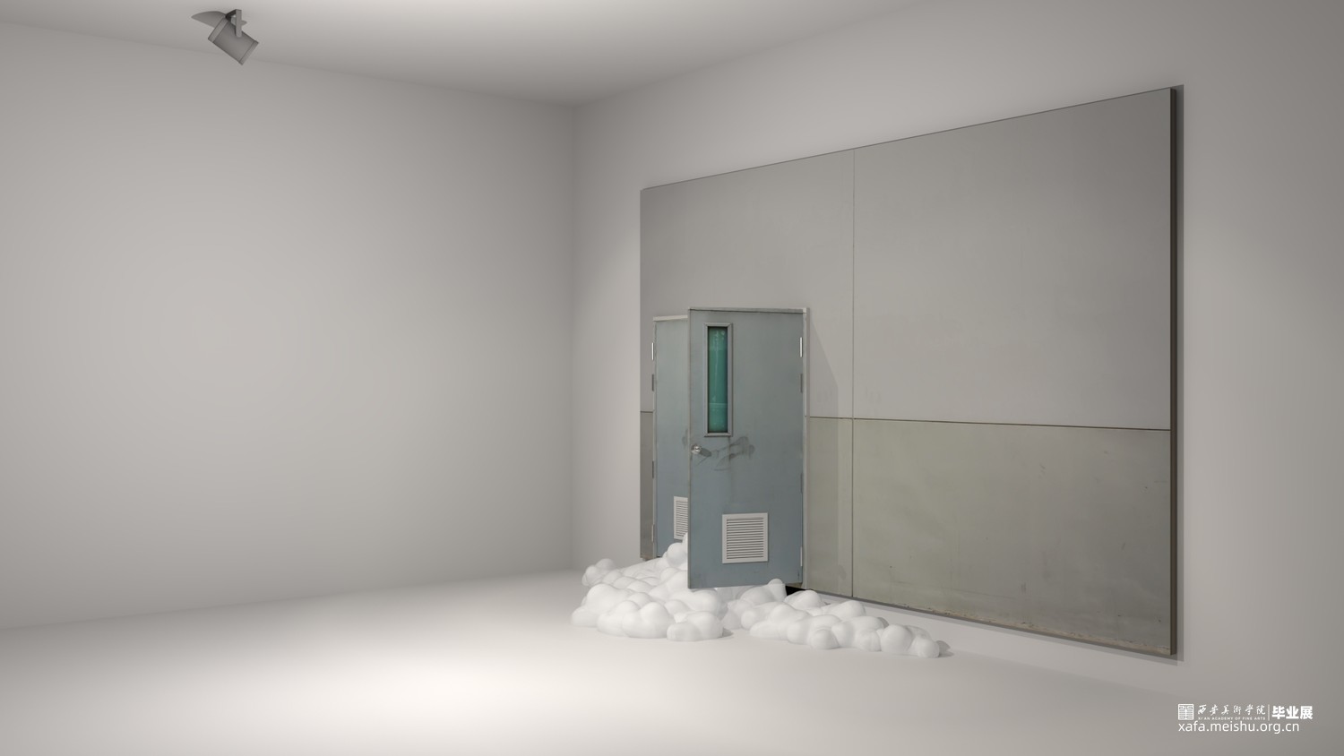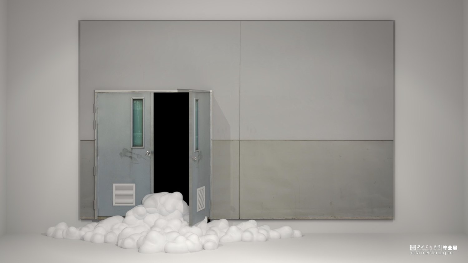 经过一系列的材料试验,确定了最终的展示效果,将门框、窗户、楼梯等现成品直接附着在图片上,发泡胶从门内、窗内及楼梯涌出至地面,基于发泡胶膨胀的随机性和不确定性,表现其蔓延感与侵蚀感。