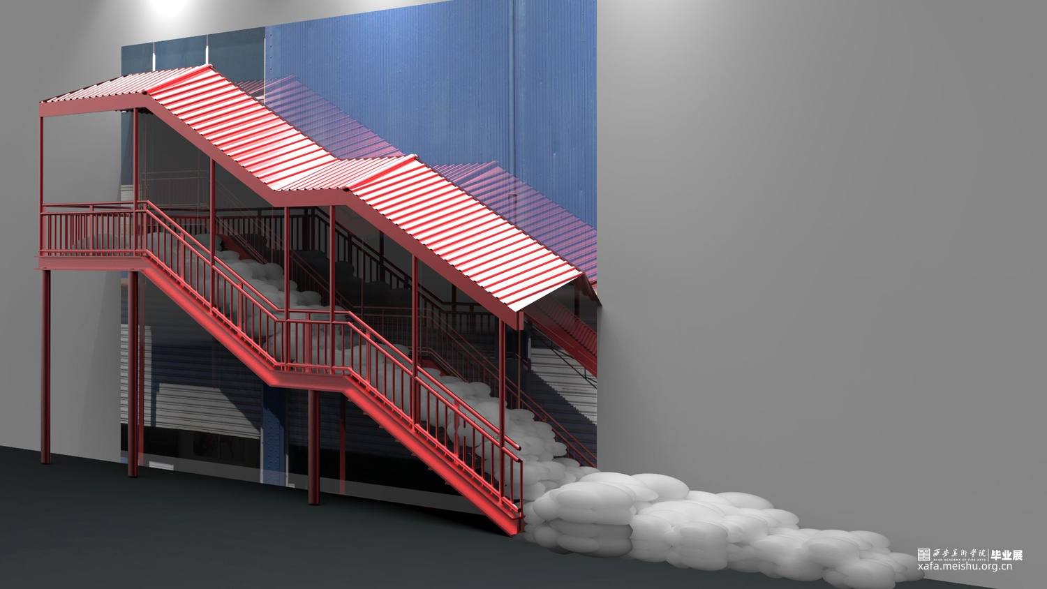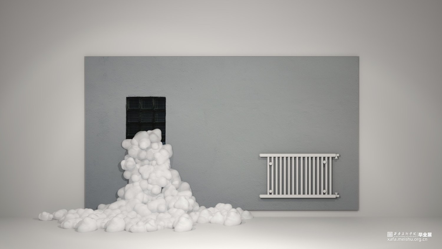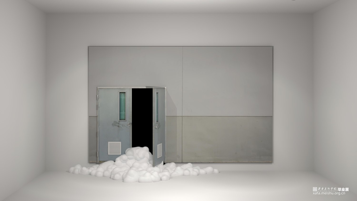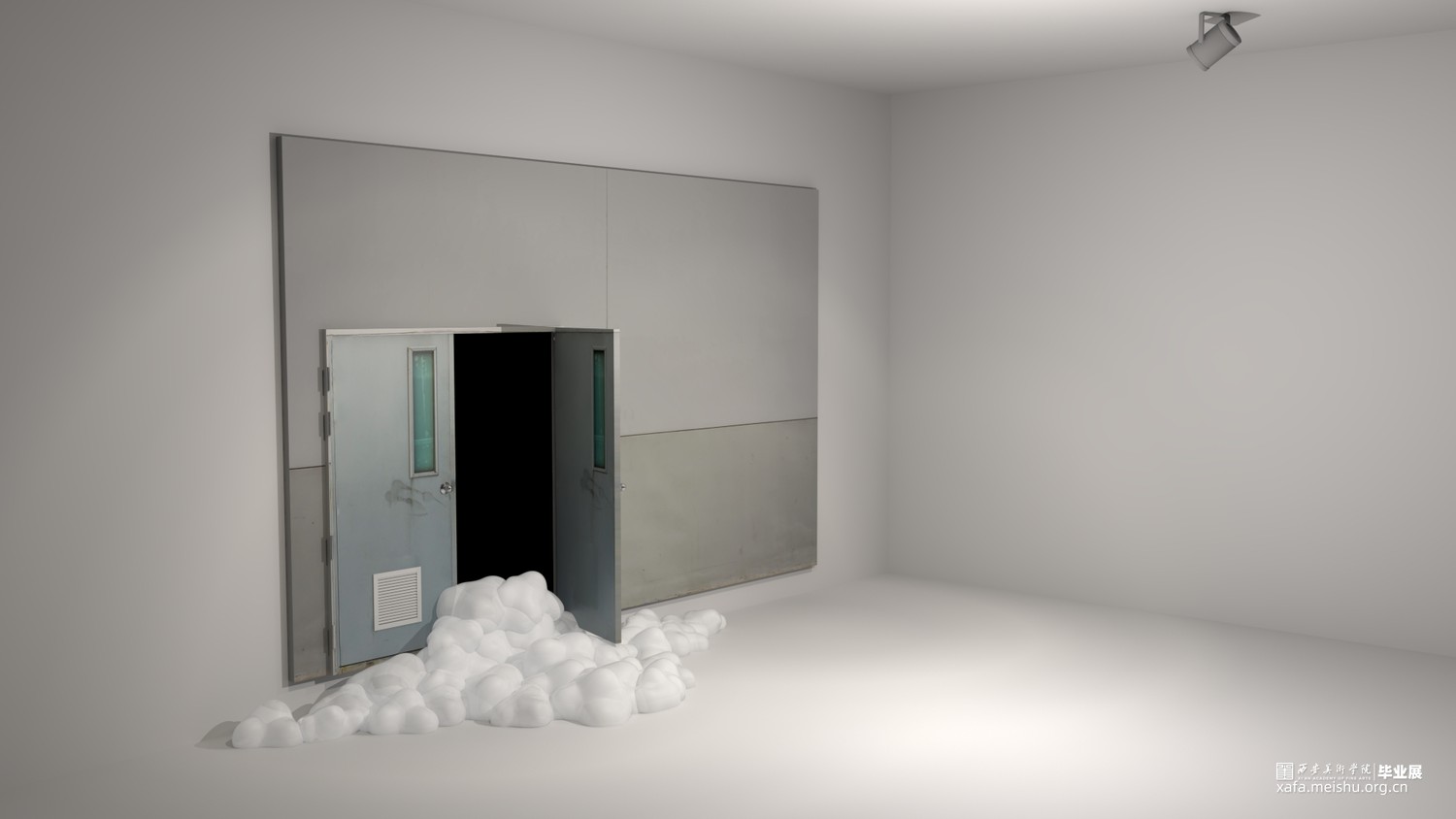 经过一系列的材料试验,确定了最终的展示效果,将门框、窗户、楼梯等现成品直接附着在图片上,发泡胶从门内、窗内及楼梯涌出至地面,基于发泡胶膨胀的随机性和不确定性,表现其蔓延感与侵蚀感。