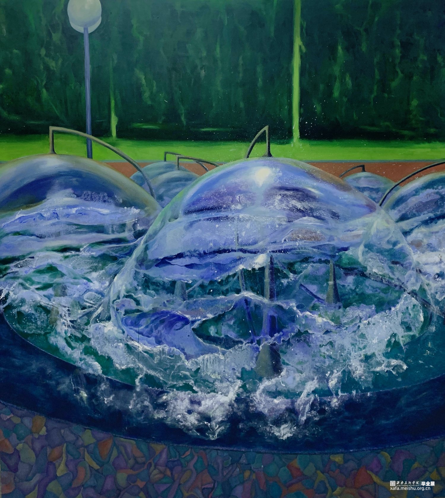 动与静的结合,来体现出流动性的时间感。自己本次的创作围绕时间、空间为主要线索依据,选取自己感兴趣的喷泉、圆形等主要构成元素来进行创作。我想通过画面中描绘的动态元素和静止下的空间中的物象结合,和线性的切割,把不同空间中的物象融合在同一个空间中进行呈现,形成一种新的秩序,来以此突出时间性在画面中的痕迹。画面中承载的不同空间中运动与静止的元素,最终通过新秩序的统一,形成自己独特的绘画研究方向。