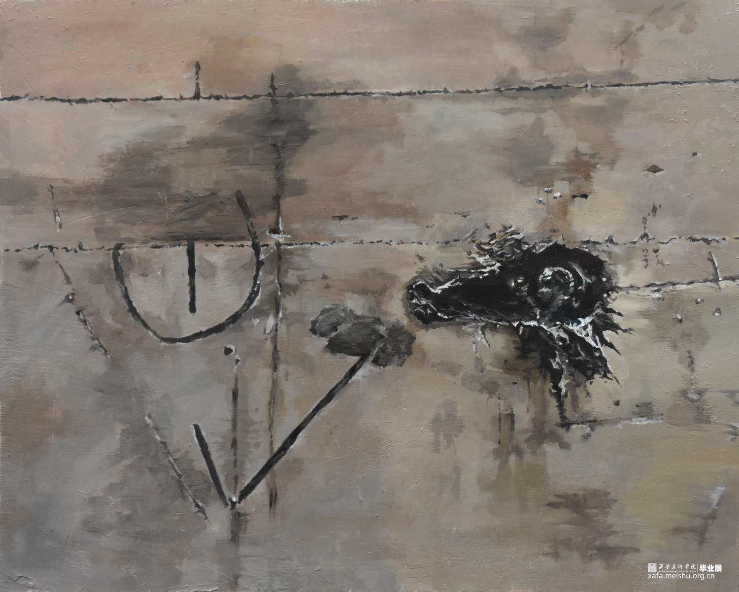 在本次创作中,为了表达疤痕最原本的形象,我运用写实的绘画手法,最细的狼毫勾线笔和罩染媒介剂与调色油的混合油尽可能的减少我在画作中的痕迹,将疤痕原本的形象呈现出来,并且通过过度放大和具有不确定性的构图方式以及灰暗单一的色彩,营造出一种破碎的伤感,而这种伤感又产生于人们自己的内心。