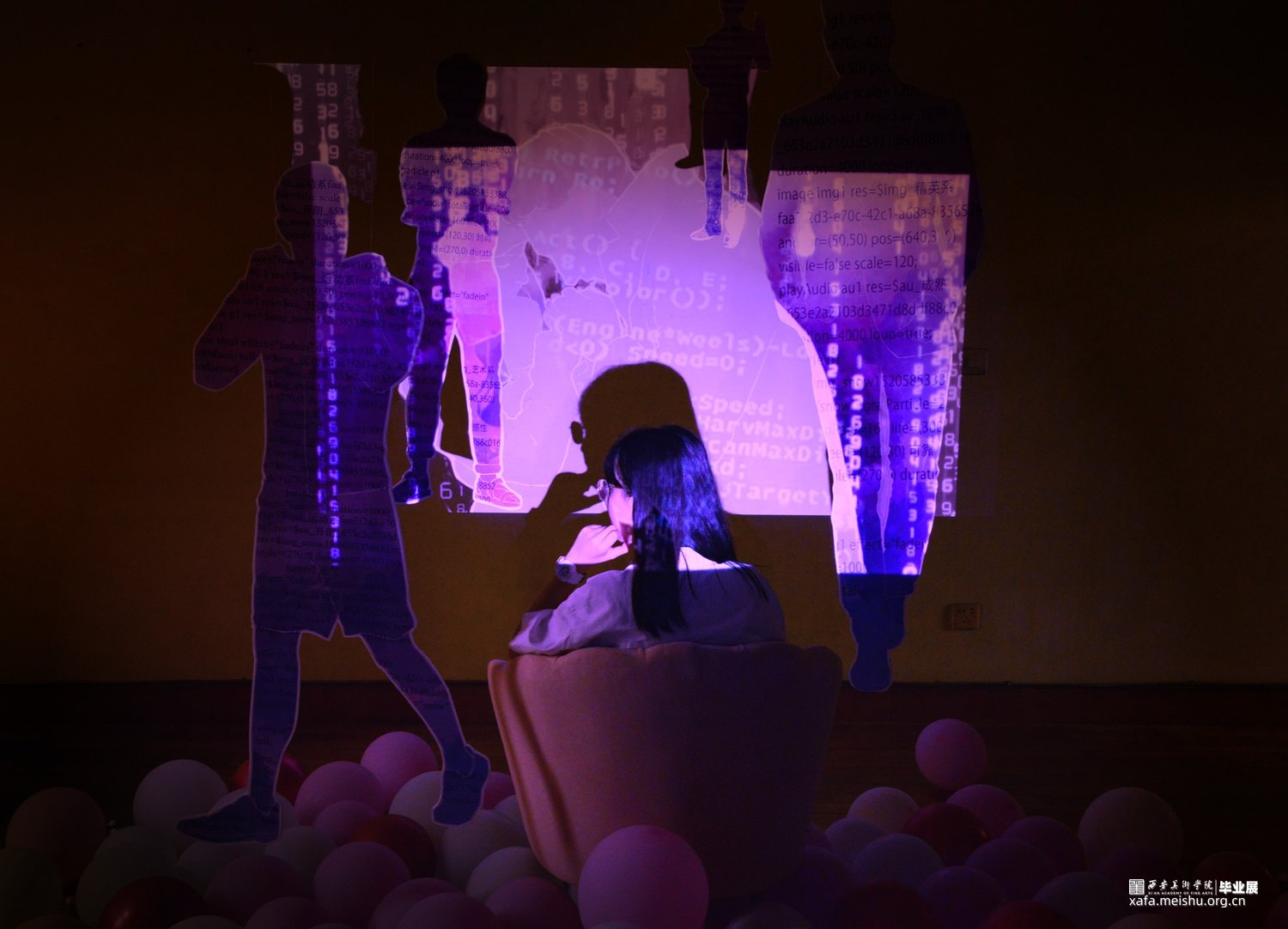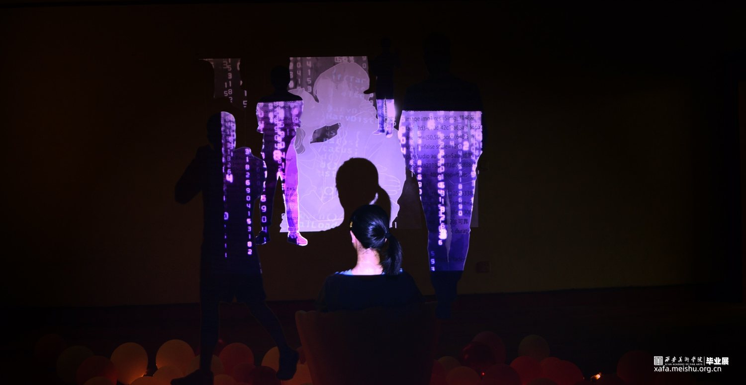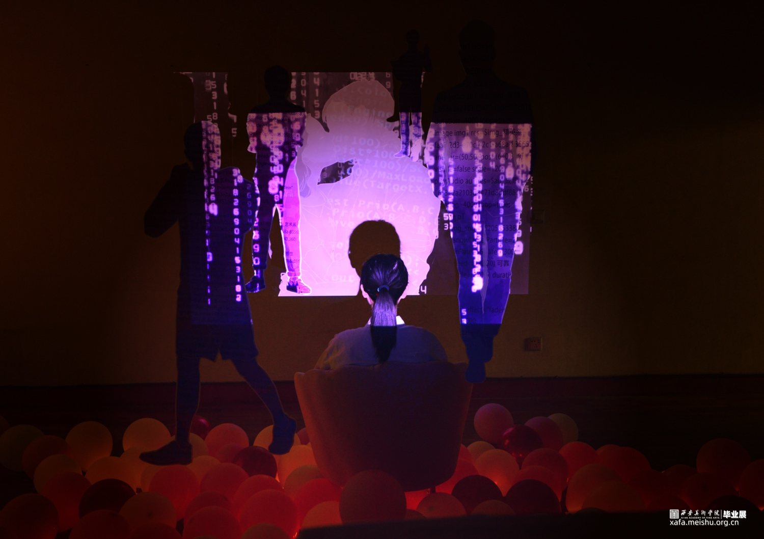 虚拟是美好的,但始终是虚拟的事物,我想揭示这个客观事实,于是画了一个女孩躺在旋转的代码中,她的身边并没有与她相爱的恋人,一切都是她沉溺于虚拟恋爱的幻想。旋转的代码是我朋友制作虚拟恋人游戏的一段编程,背景音是低沉悠远的风声,我用风声来传达一种安逸的舒适感。