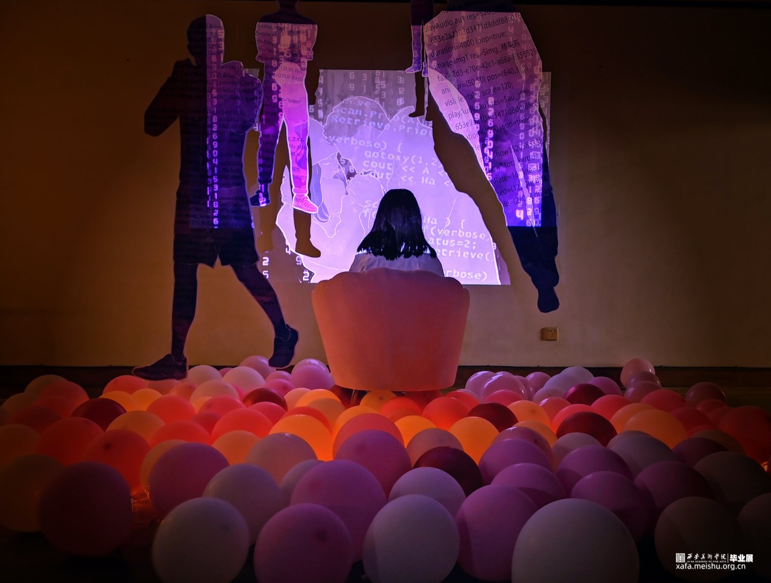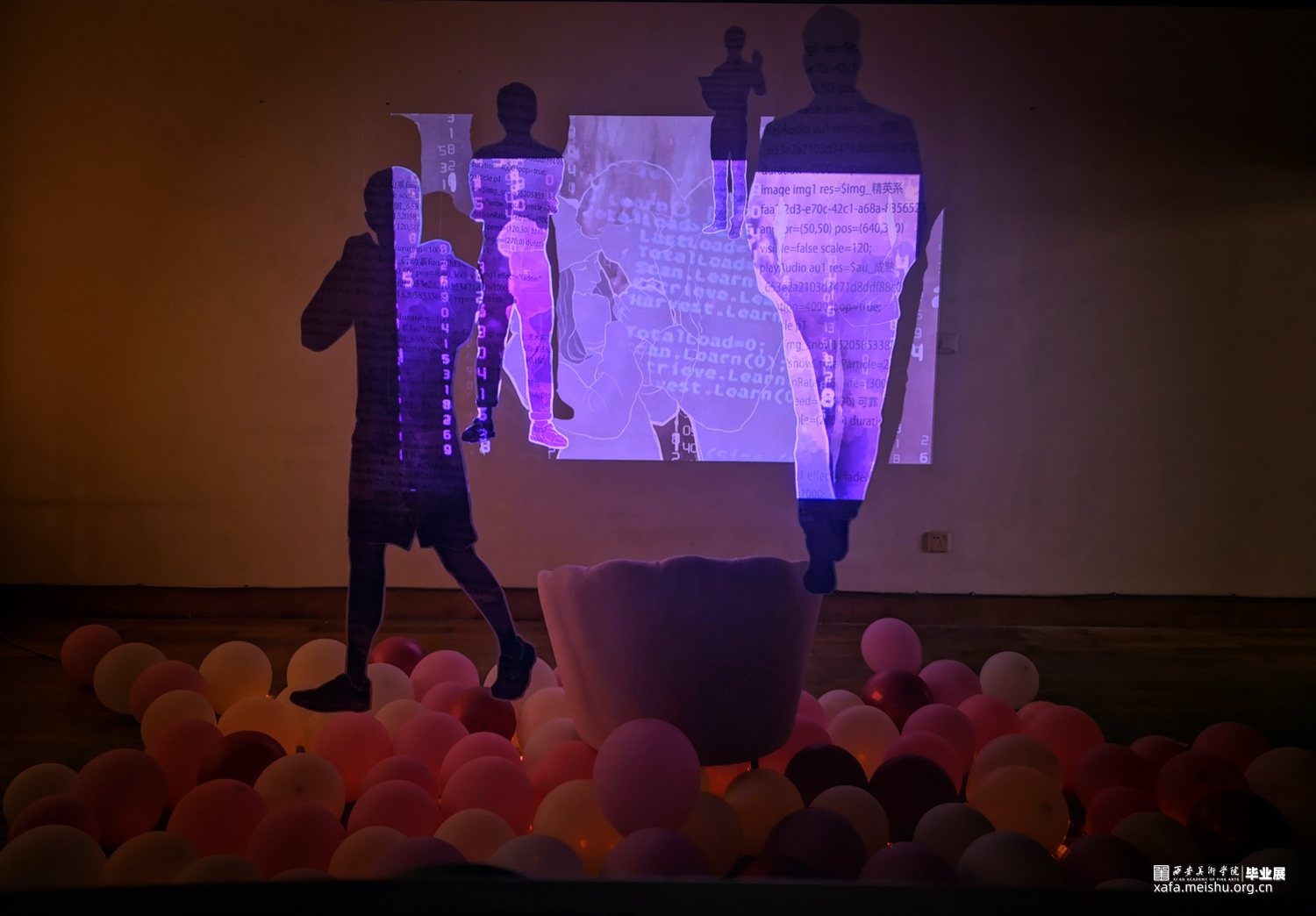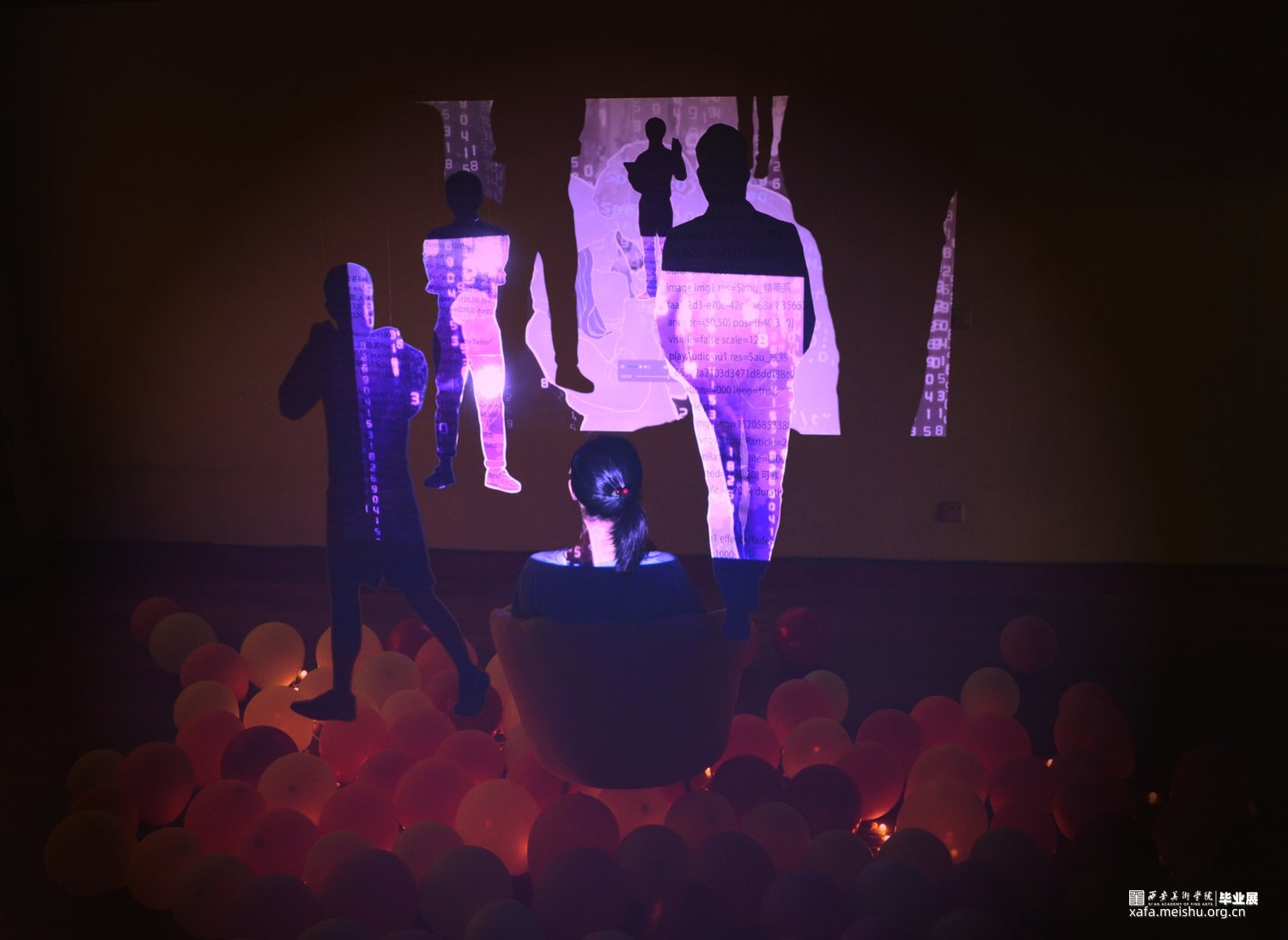 虚拟是美好的,但始终是虚拟的事物,我想揭示这个客观事实,于是画了一个女孩躺在旋转的代码中,她的身边并没有与她相爱的恋人,一切都是她沉溺于虚拟恋爱的幻想。旋转的代码是我朋友制作虚拟恋人游戏的一段编程,背景音是低沉悠远的风声,我用风声来传达一种安逸的舒适感。