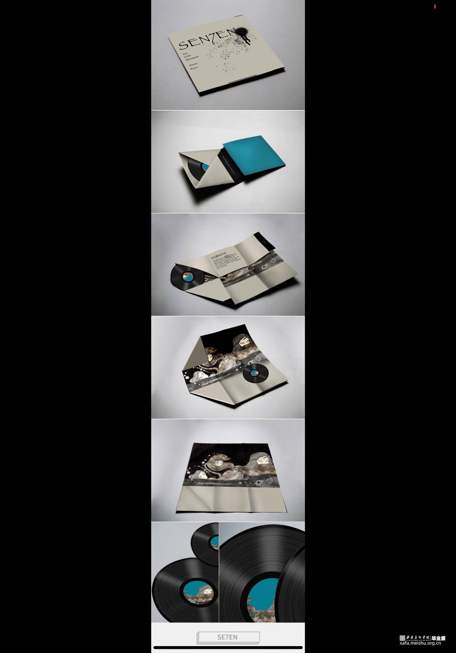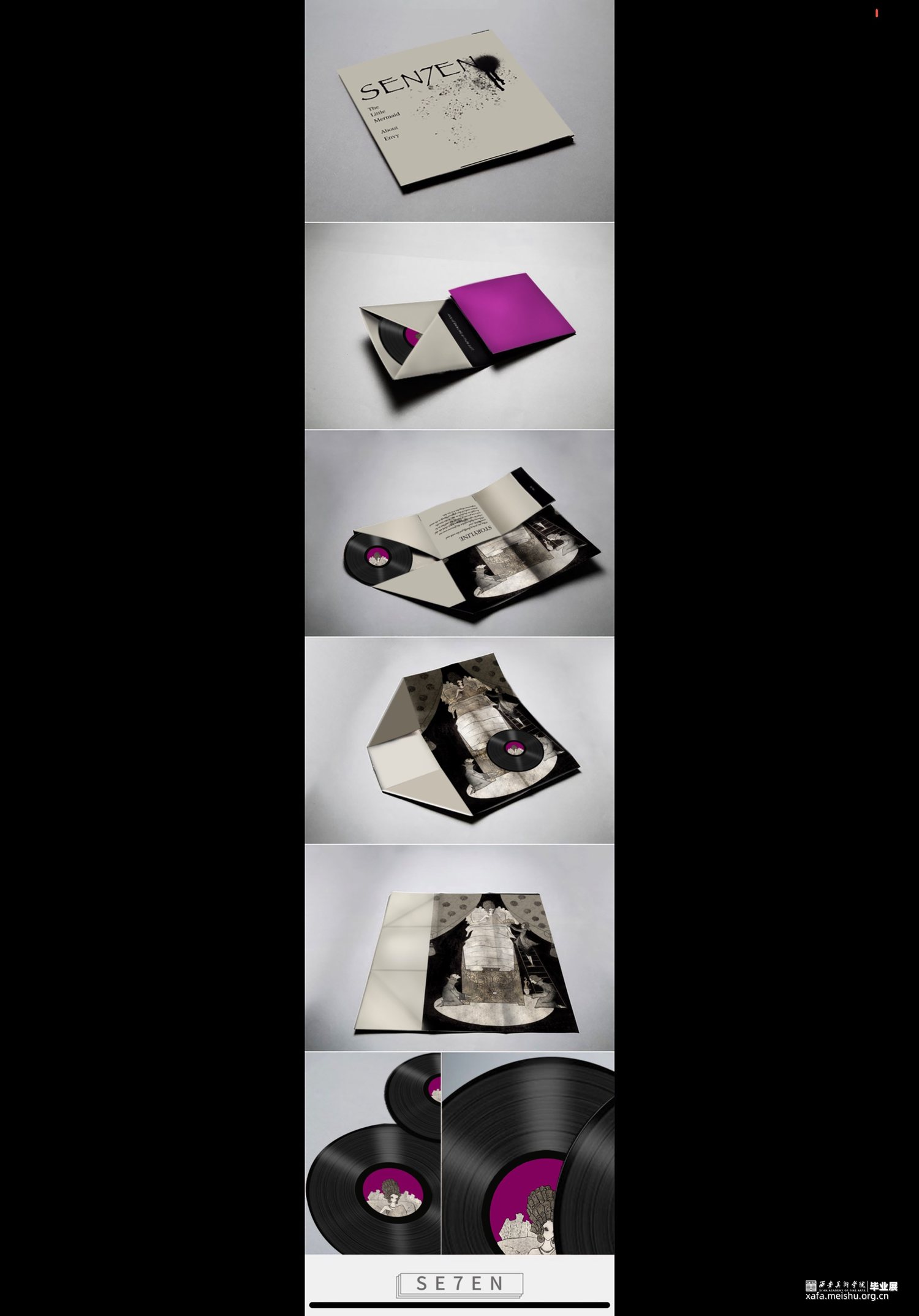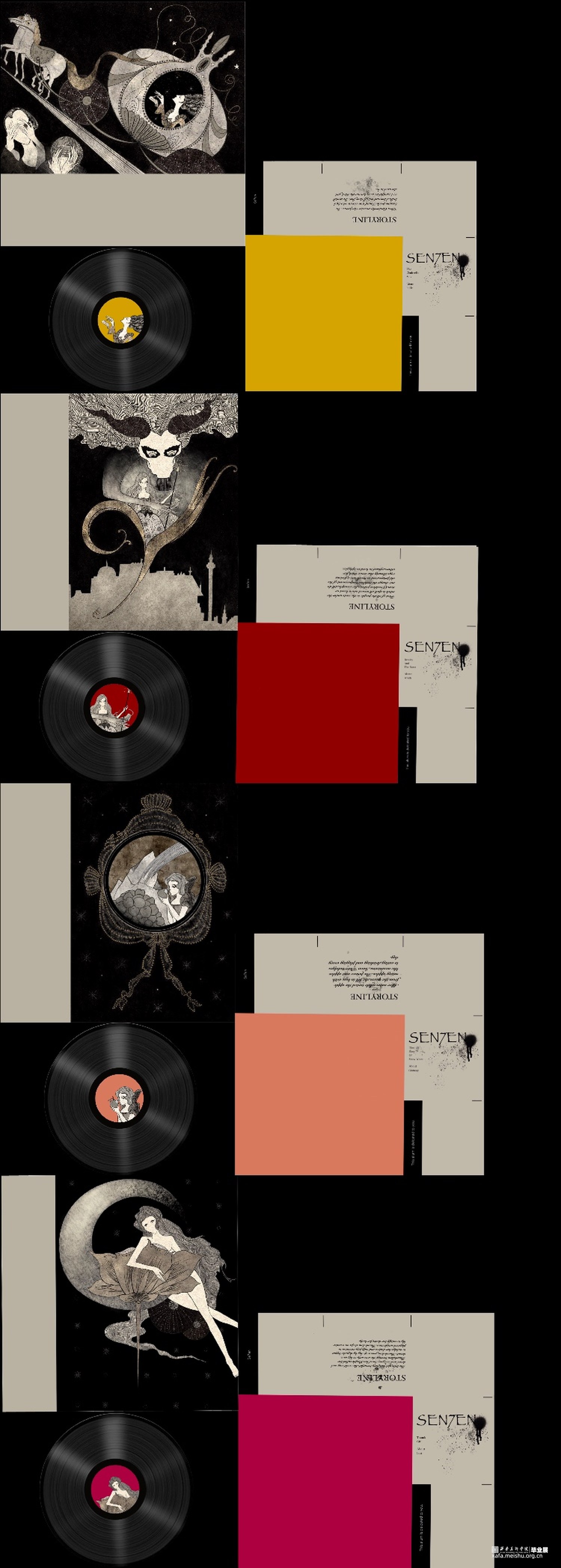 拇指姑娘的故事与色欲对应,白雪公主对应暴食,阿拉丁神灯对应贪婪,豌豆公主对应懒惰,海的女儿对应嫉妒,美女与野兽对应暴怒,灰姑娘对应傲慢。设计项目包括主题插画,黑胶唱片包装设计系列,动态视频,定制瓷盘和拼图。插画作品画风暗黑贴合主题,以黑白金三色为主的做旧色调,古典的装饰性线条展现中世纪背景下发生的七个故事。并制作成动图视频,让故事更为生动的呈现给观众。黑胶唱片包装在原有插画的基础上,结合当下流行的撞色元素增添时尚感。