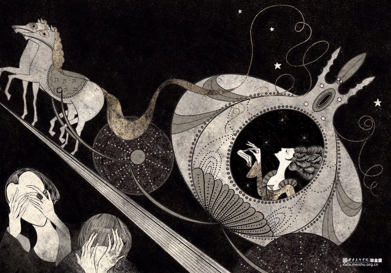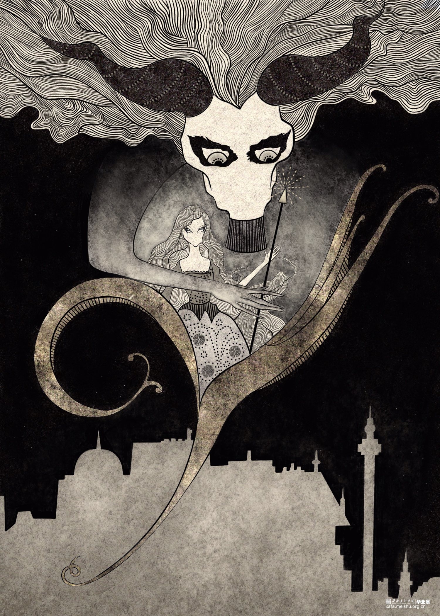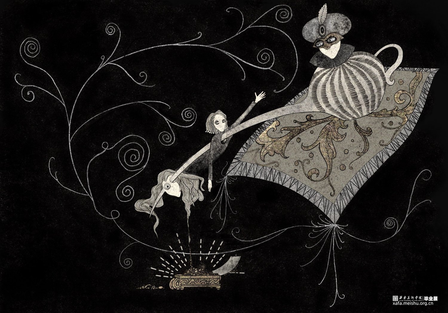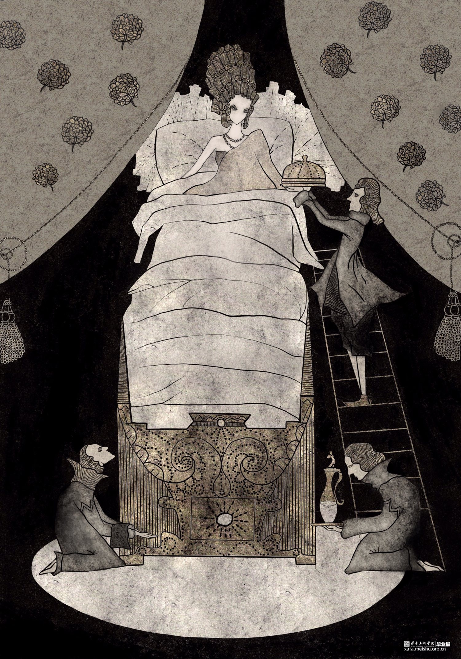 拇指姑娘的故事与色欲对应,白雪公主对应暴食,阿拉丁神灯对应贪婪,豌豆公主对应懒惰,海的女儿对应嫉妒,美女与野兽对应暴怒,灰姑娘对应傲慢。设计项目包括主题插画,黑胶唱片包装设计系列,动态视频,定制瓷盘和拼图。插画作品画风暗黑贴合主题,以黑白金三色为主的做旧色调,古典的装饰性线条展现中世纪背景下发生的七个故事。并制作成动图视频,让故事更为生动的呈现给观众。黑胶唱片包装在原有插画的基础上,结合当下流行的撞色元素增添时尚感。