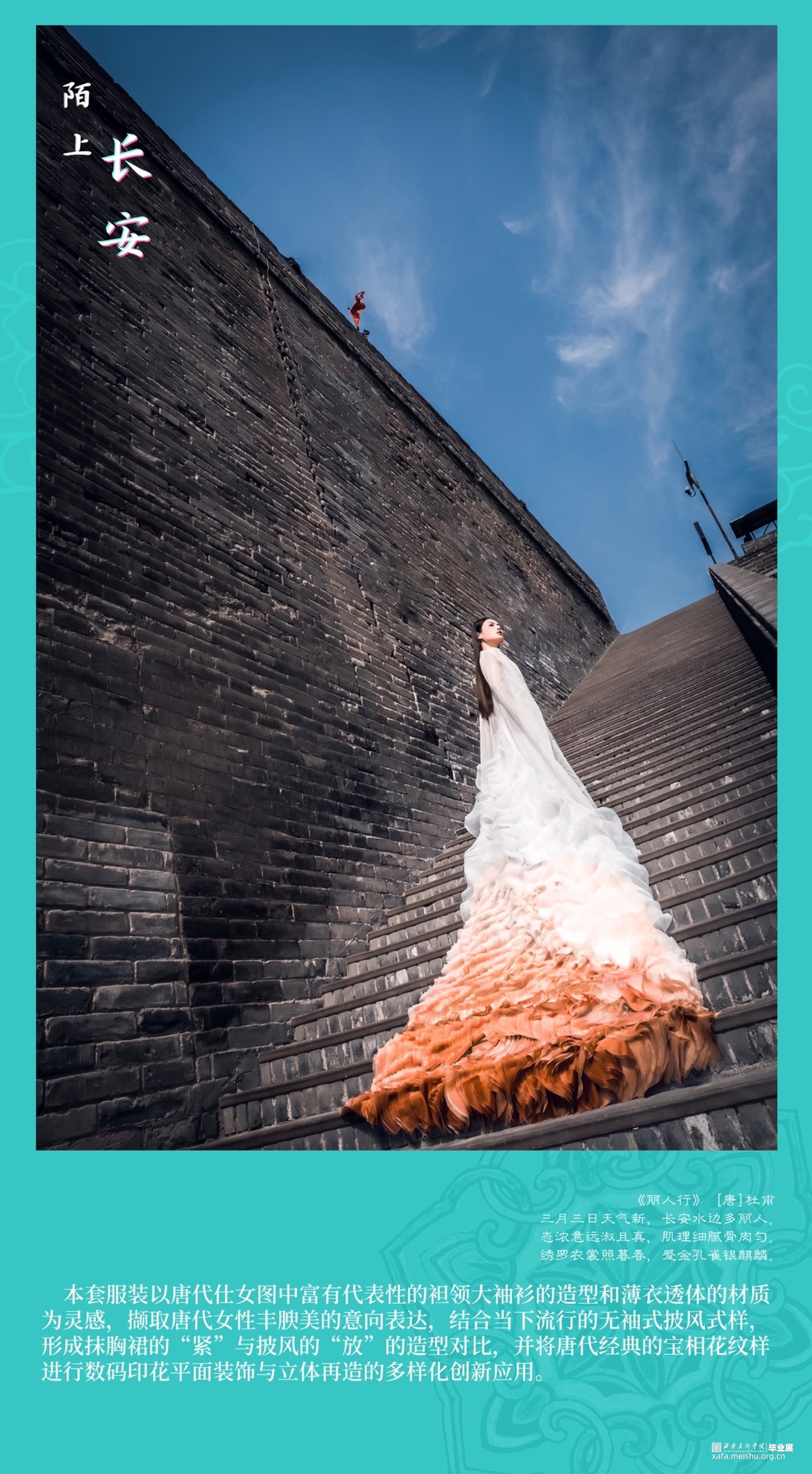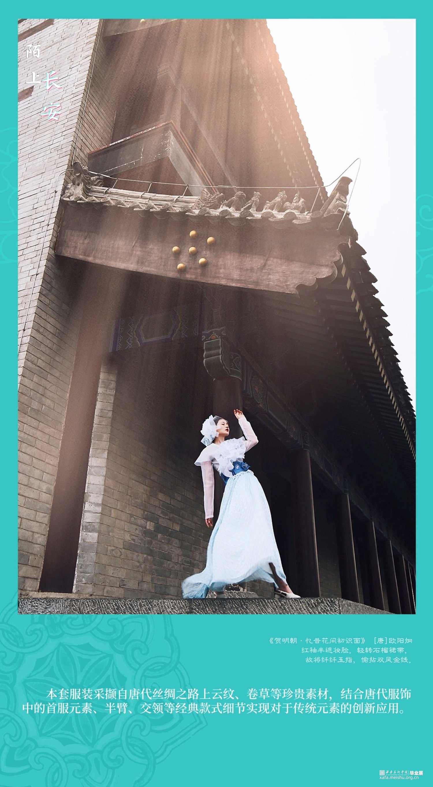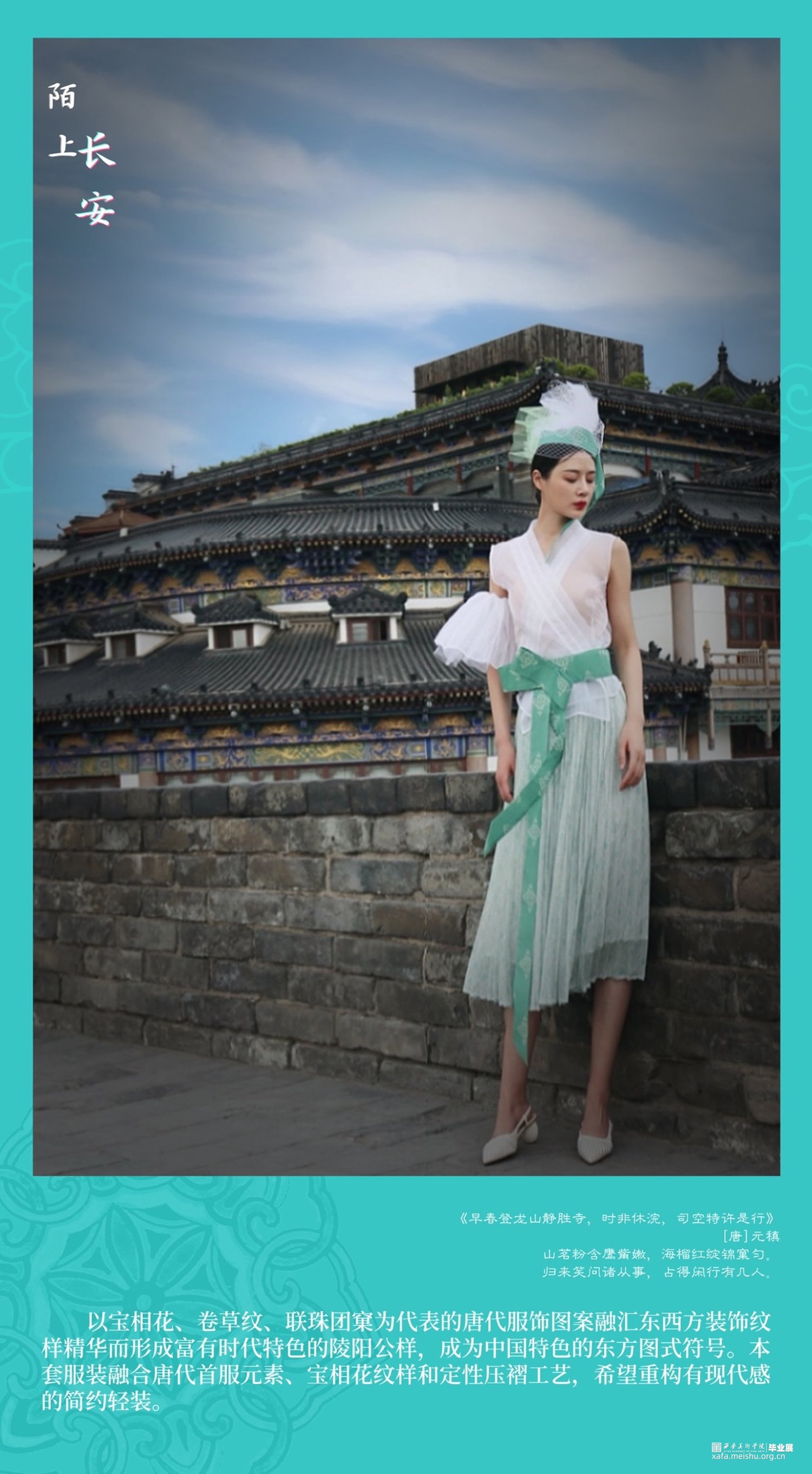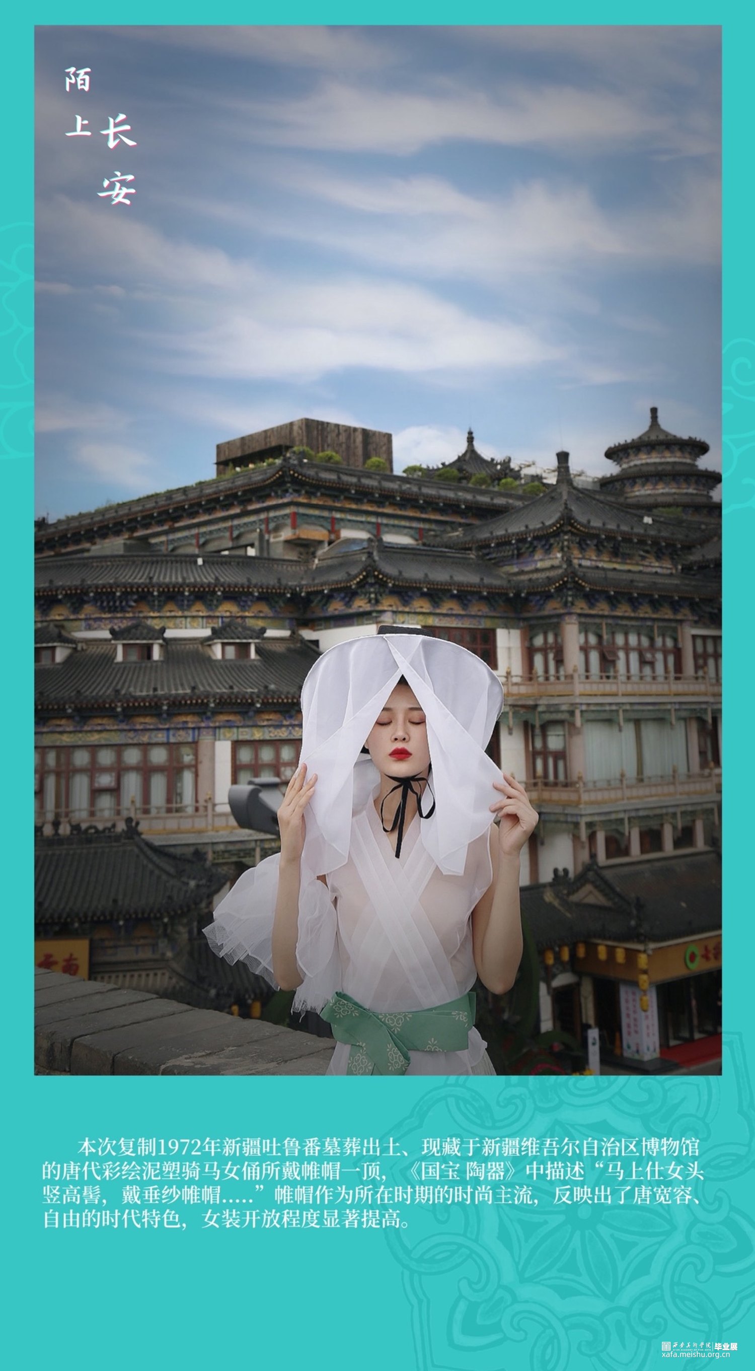 因此,我有幸在西安美术学院求学的七年,唐代文化与长安精神的影响成为我最想表达与释放的情结。本次毕业设计系列服装六套、复制唐代帷帽一件、依据唐代帷帽而设计时尚帽饰两件。以唐代首服及女装经典的色彩、纹样、款式、造型等元素为灵感来源,结合当前流行的中国美学时尚,探寻以新的服饰设计方式表达对于唐代文化的继承、创新与应运。也许,从唐代帷帽到到现代帽饰,从裙衫帔臂到现代肌理再造,从以唐代服饰为蓝本的传统风格向现代时装的转化,这其中的变与不变,就是唐代服饰文化由古意向现代的蜕变,就是长安文化内涵在我们的实际生活和理想心灵家园中的传承与诠释。