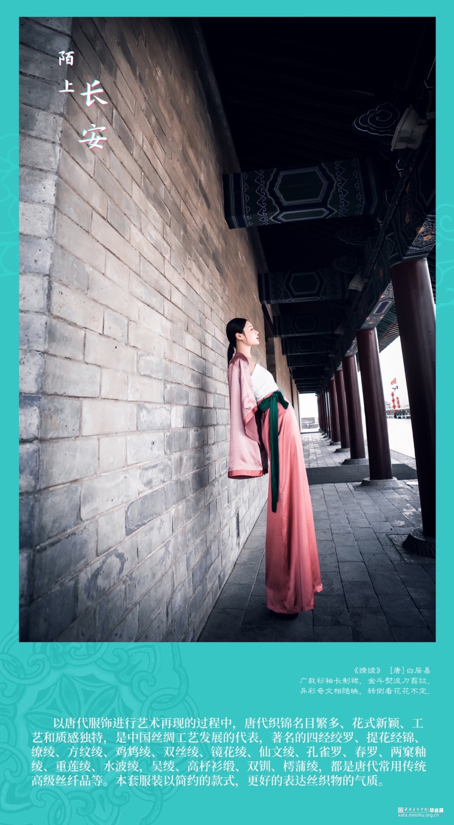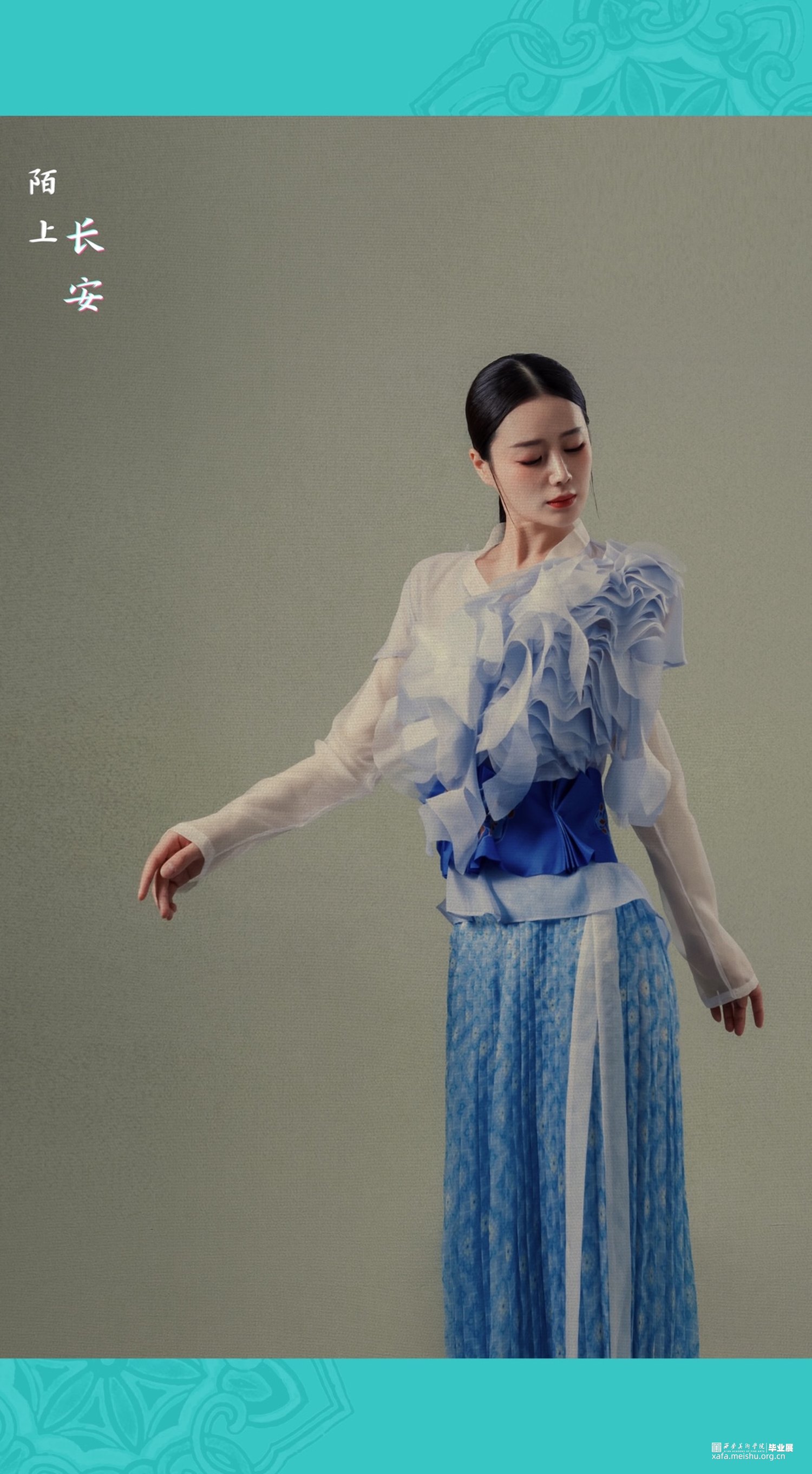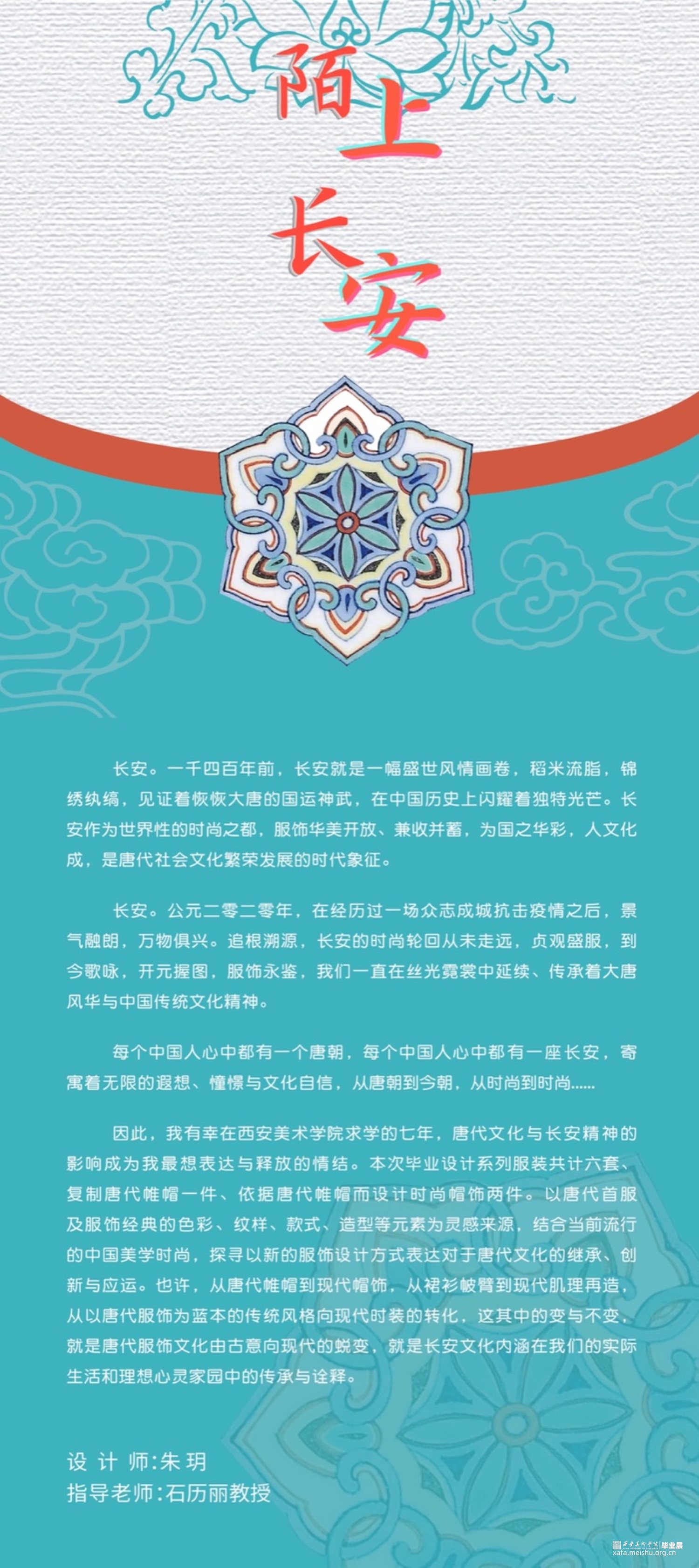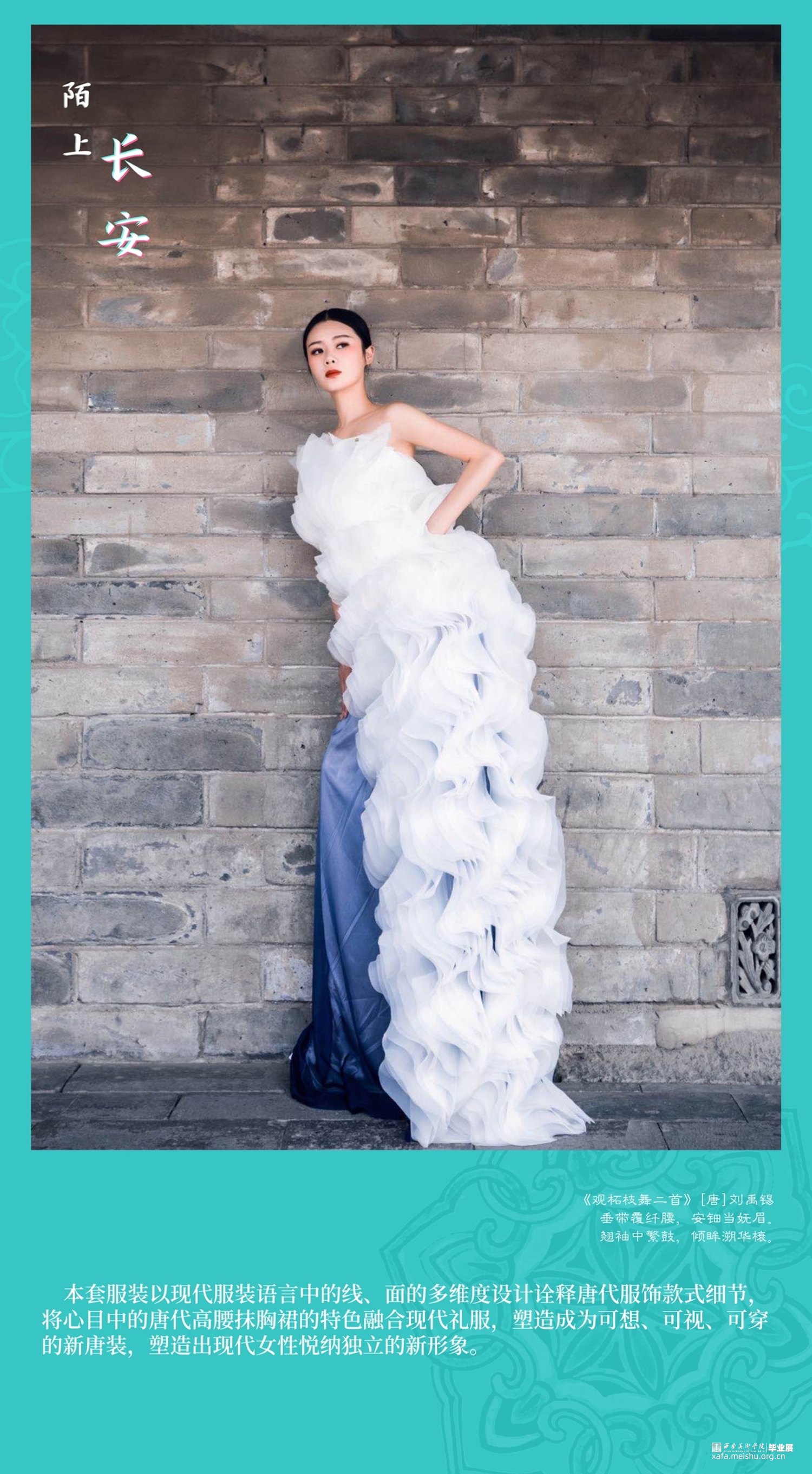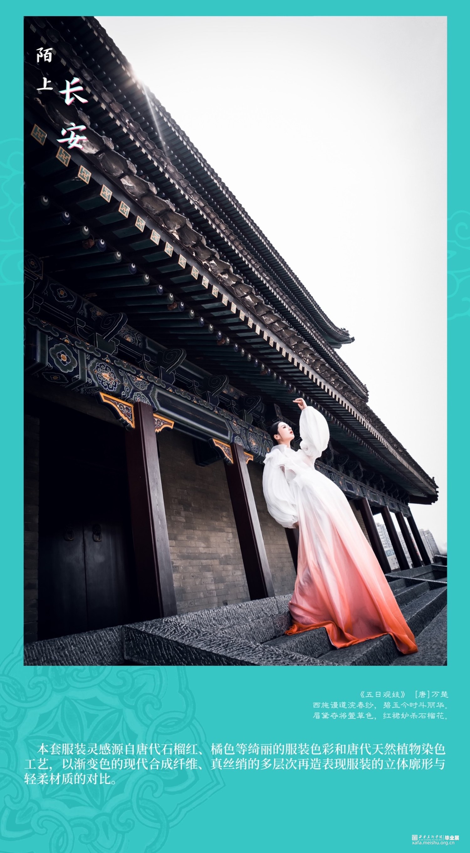 因此,我有幸在西安美术学院求学的七年,唐代文化与长安精神的影响成为我最想表达与释放的情结。本次毕业设计系列服装六套、复制唐代帷帽一件、依据唐代帷帽而设计时尚帽饰两件。以唐代首服及女装经典的色彩、纹样、款式、造型等元素为灵感来源,结合当前流行的中国美学时尚,探寻以新的服饰设计方式表达对于唐代文化的继承、创新与应运。也许,从唐代帷帽到到现代帽饰,从裙衫帔臂到现代肌理再造,从以唐代服饰为蓝本的传统风格向现代时装的转化,这其中的变与不变,就是唐代服饰文化由古意向现代的蜕变,就是长安文化内涵在我们的实际生活和理想心灵家园中的传承与诠释。