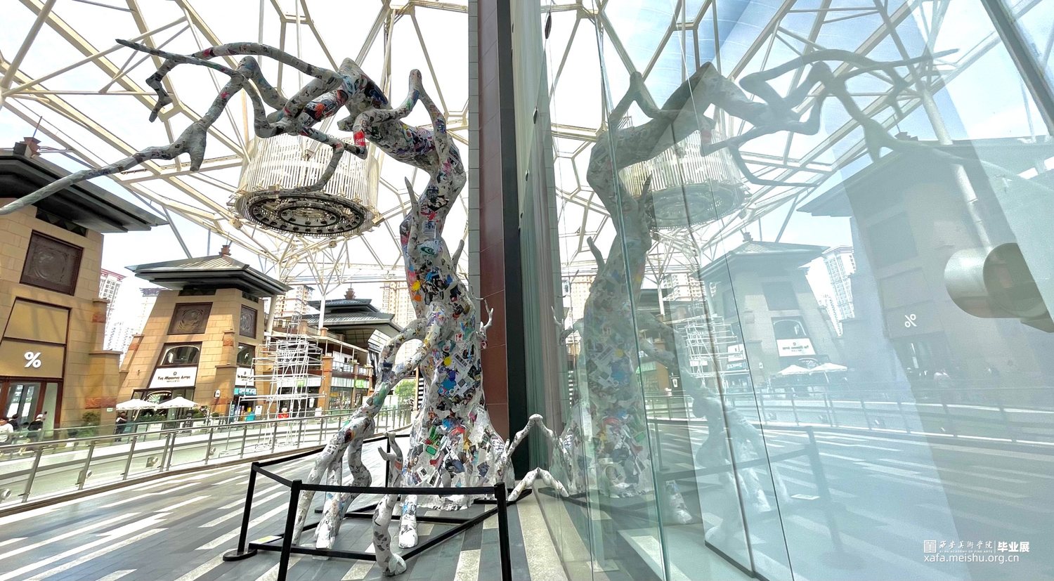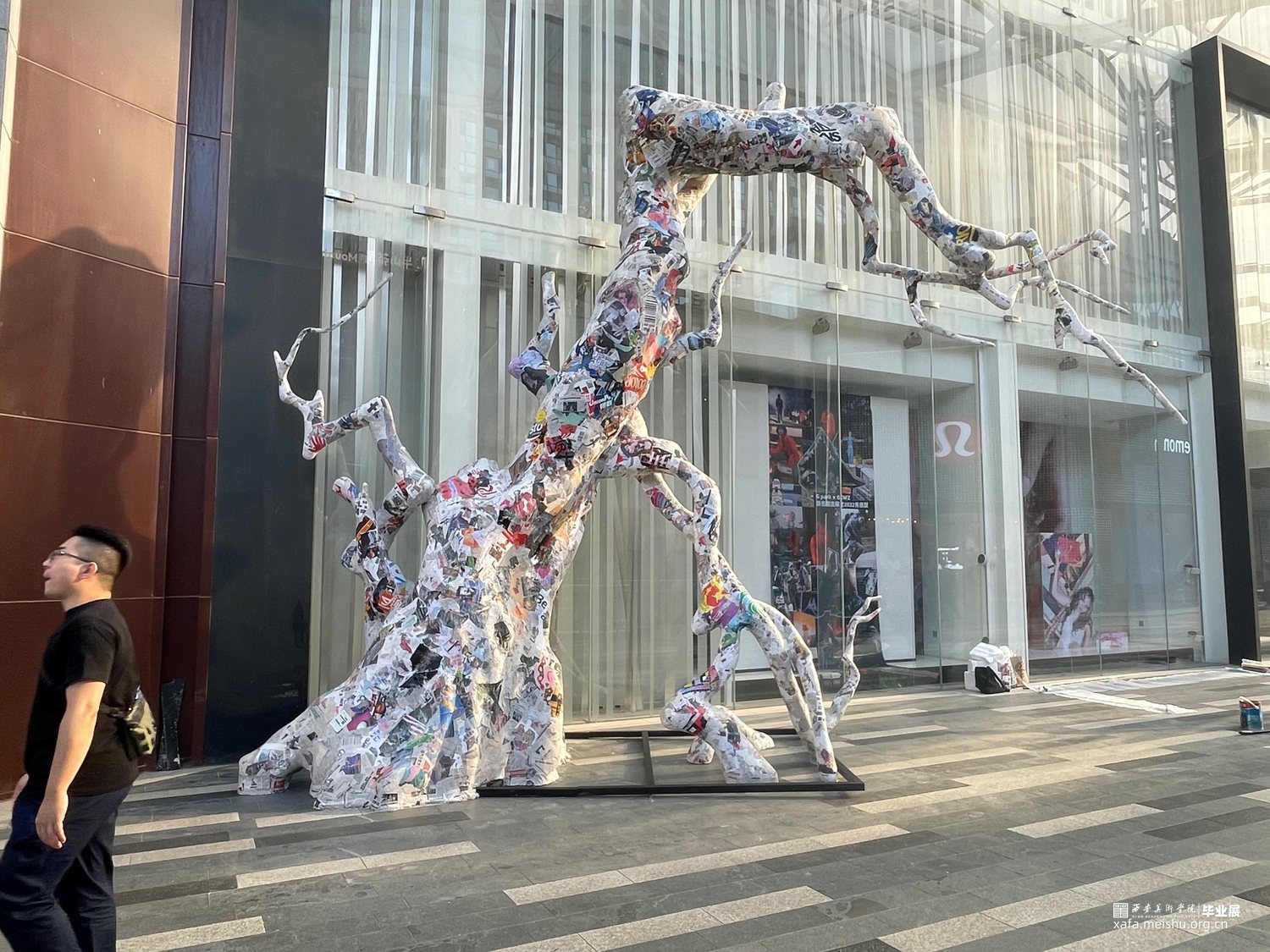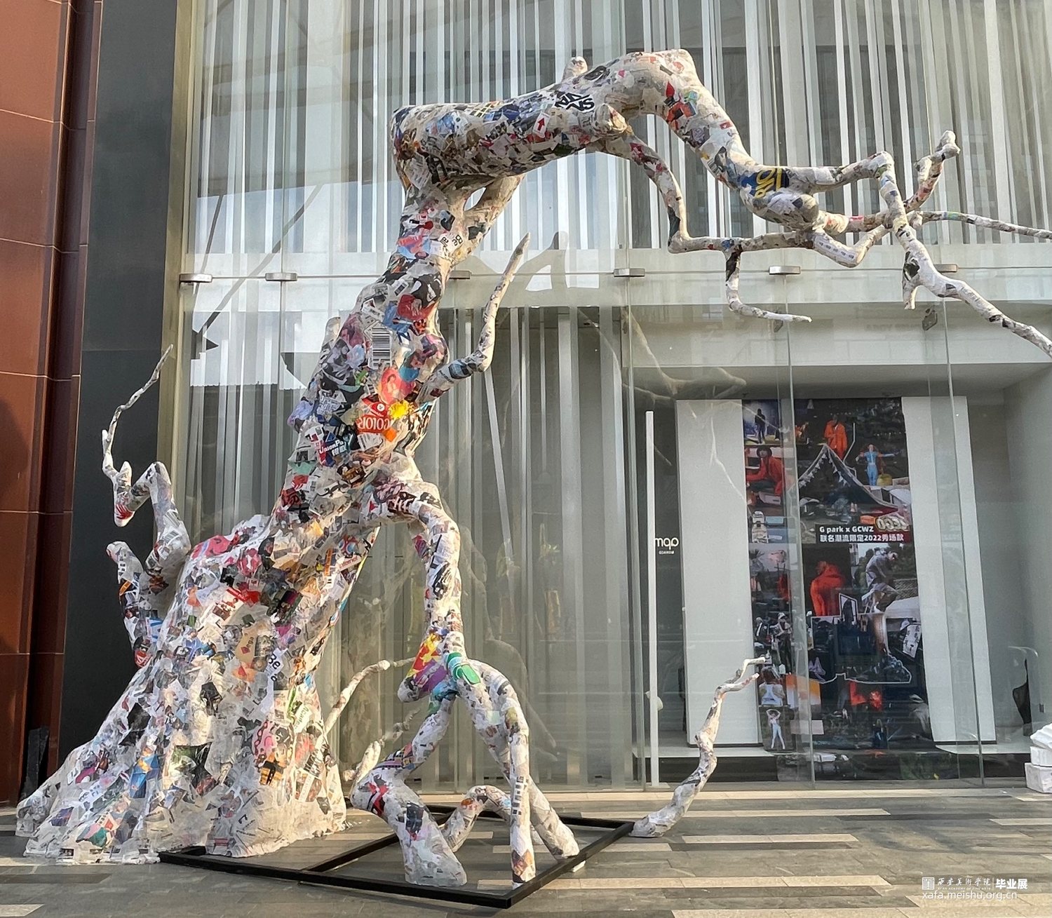 作品以一棵冲出建筑的树为主体,形成一幅超现实的视觉景观。大量无序排列的商品信息、报纸头条、订单编号被还原为纸浆碎片形态后依附于树干并形成新的语言躯壳,信息的蔓延与树形的延展在无限的空间中交织、作用。
