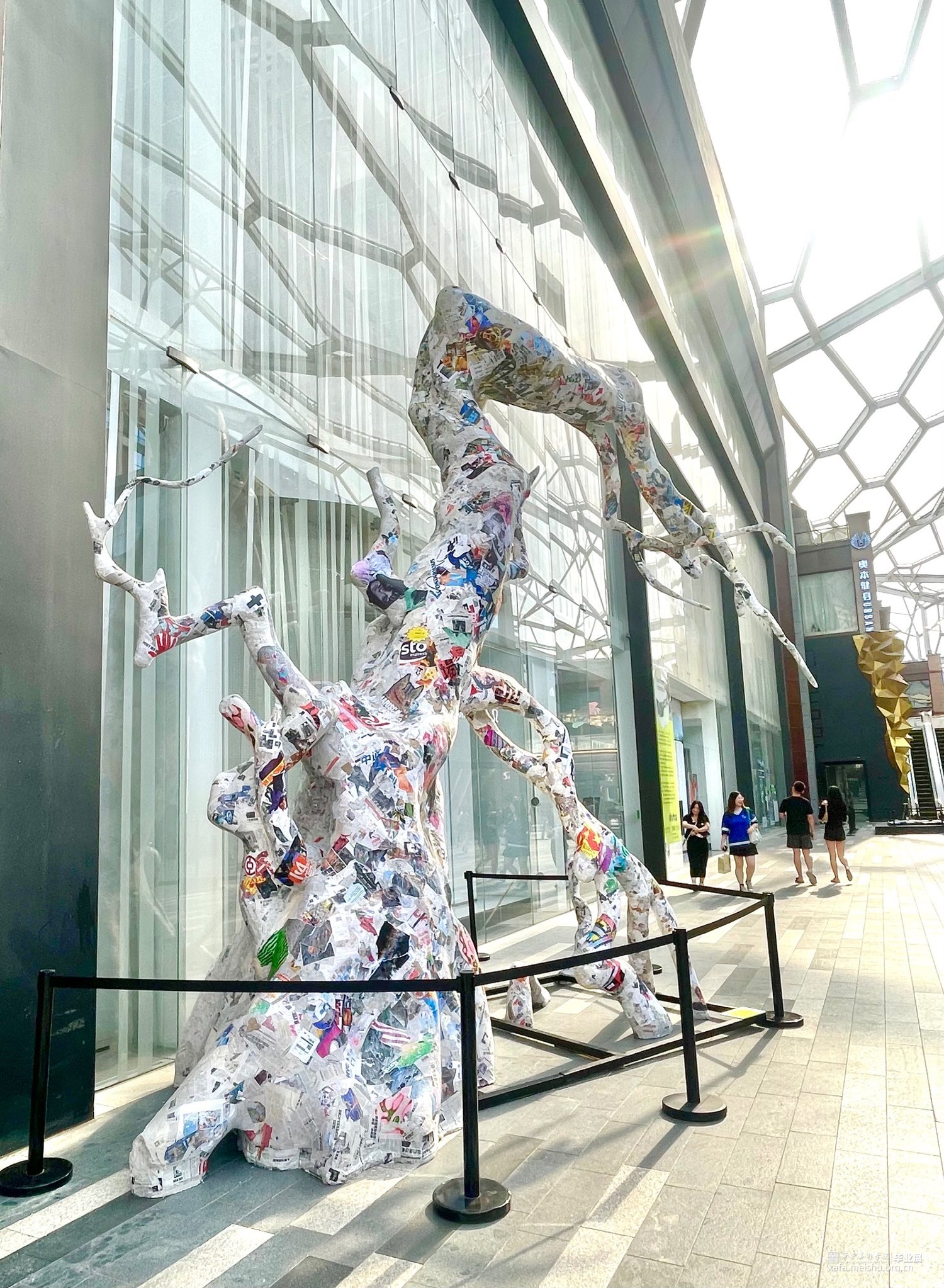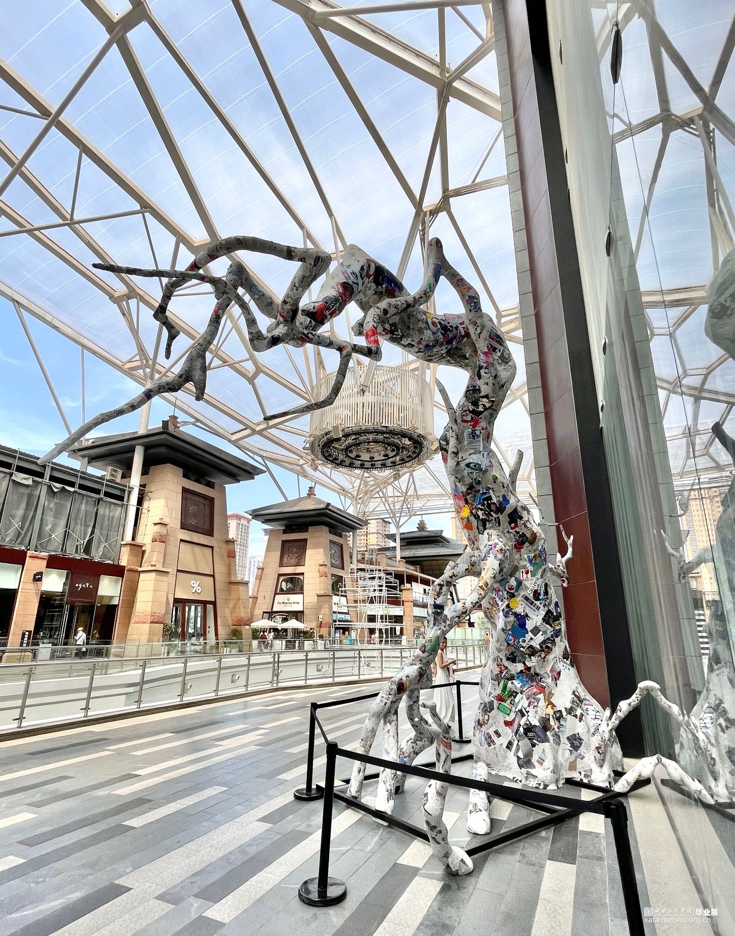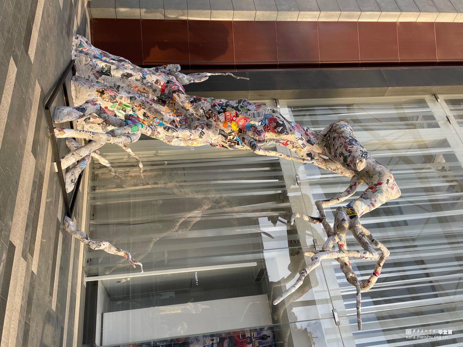 作品以一棵冲出建筑的树为主体,形成一幅超现实的视觉景观。大量无序排列的商品信息、报纸头条、订单编号被还原为纸浆碎片形态后依附于树干并形成新的语言躯壳,信息的蔓延与树形的延展在无限的空间中交织、作用。