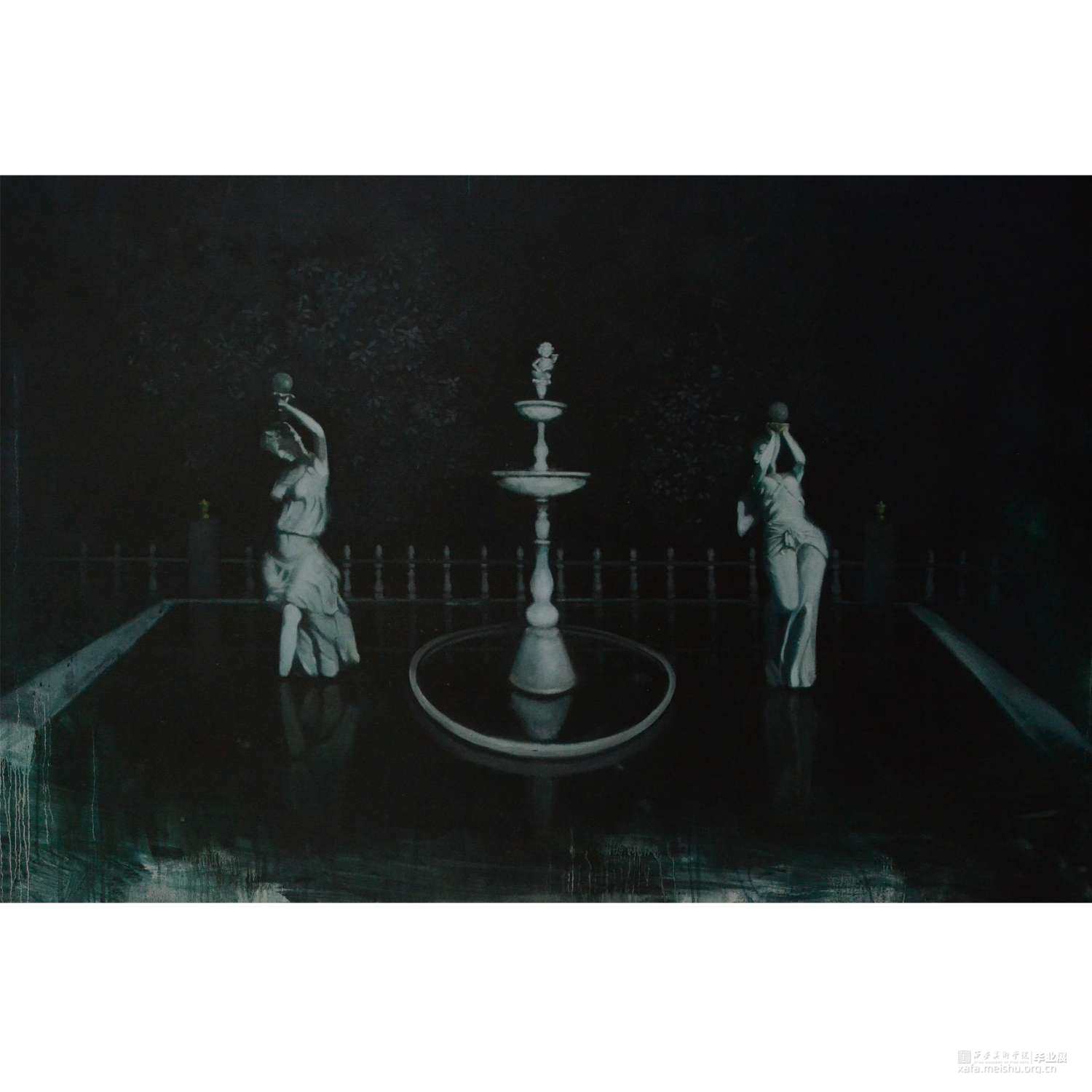 这张创作来源于当时的一次出游,无意间经过一座公园,角落间一座无人问津的喷泉引起了我的注意。它给人们传达出一种深深的孤独感与失落感, 其优美的造型、时光所留下的斑驳印记以及孤独、凄清的氛围触动到了我,于是我决定画下这座泉。在画面处理上,我试图采用单色的处理方式,同时使用大量松节油,使得画面颜料产生流淌、滴落的激励效果,意图使画面呈现出褪色老 照片一般的复古陈旧的感觉。力图给观者带来独特的视觉体验。关...