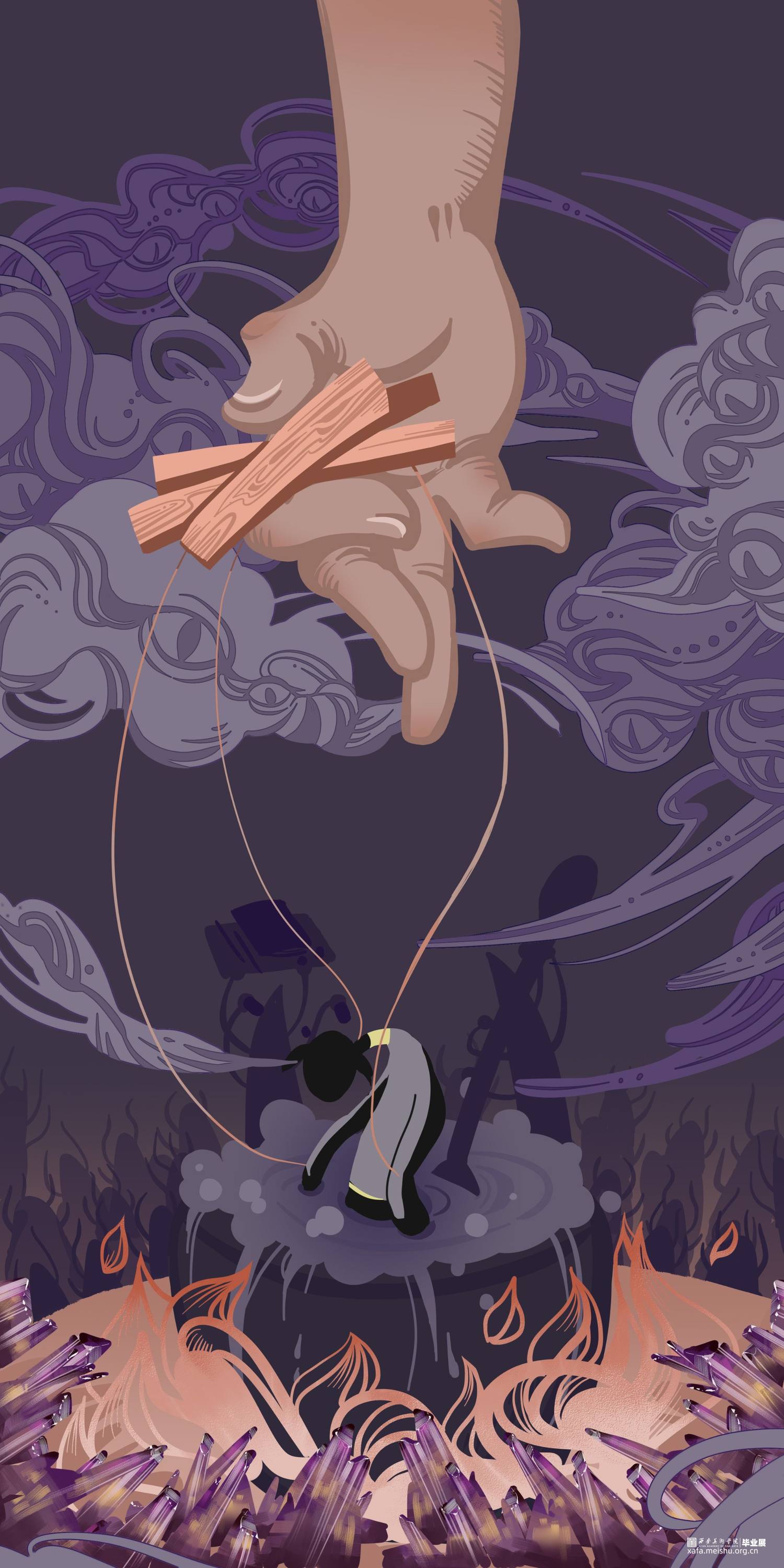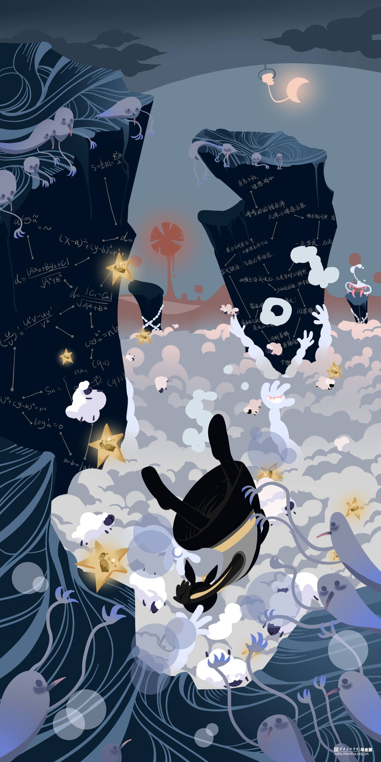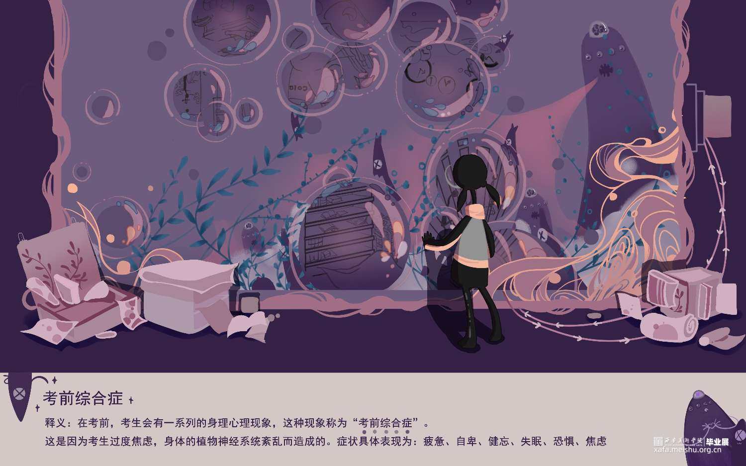 释义:考生在考试之前产生的一系列心理活动被称为“考前综合症”。这是因为考生过度焦虑,身体的植物神经系统紊乱而造成的。症状具体表现为:疲惫、自卑、健忘、失眠、恐惧、焦虑。而插画的灵感也来源于自身的高考经历。