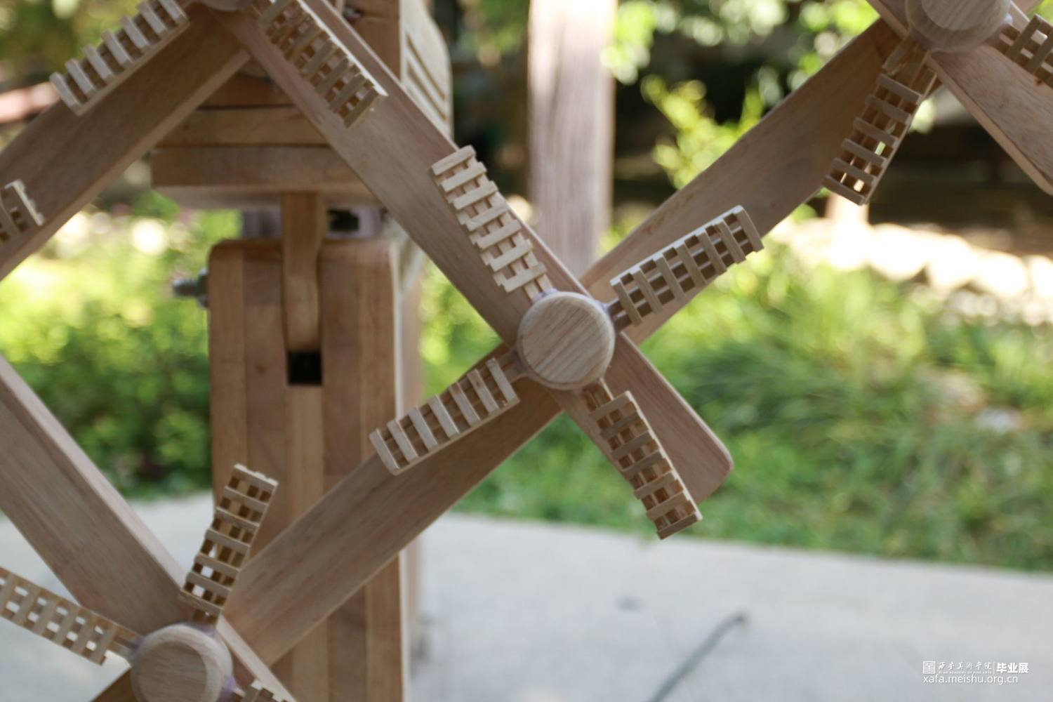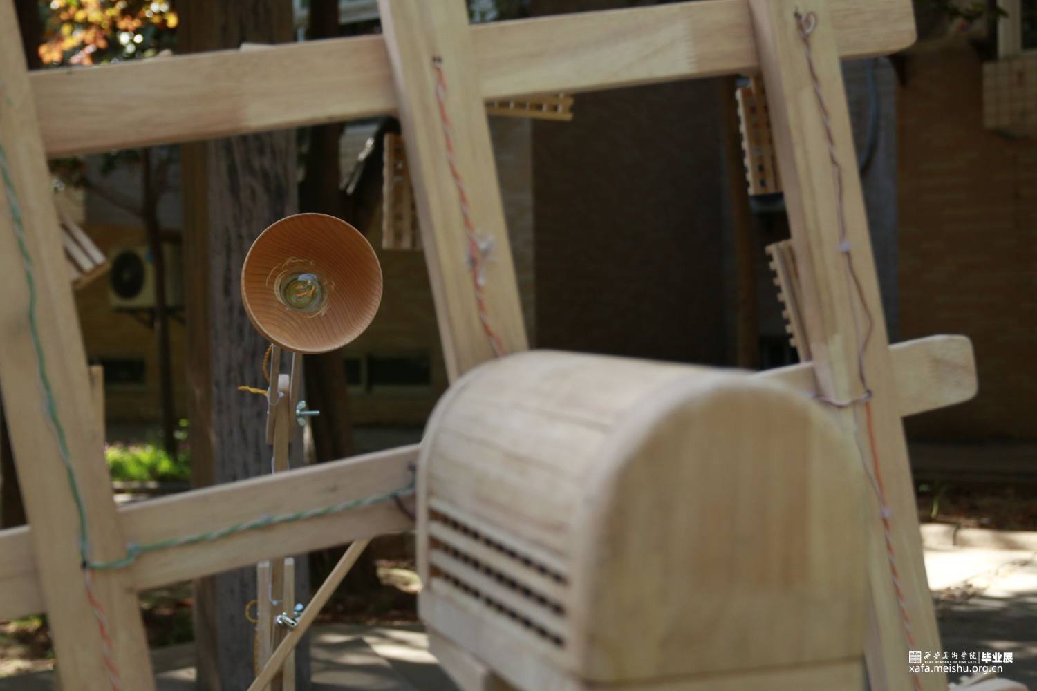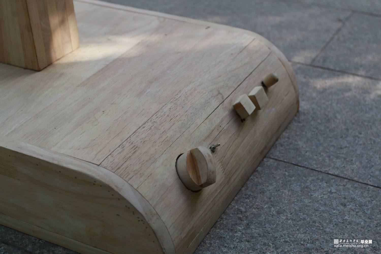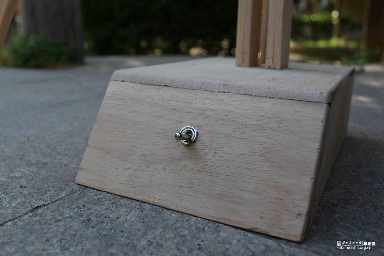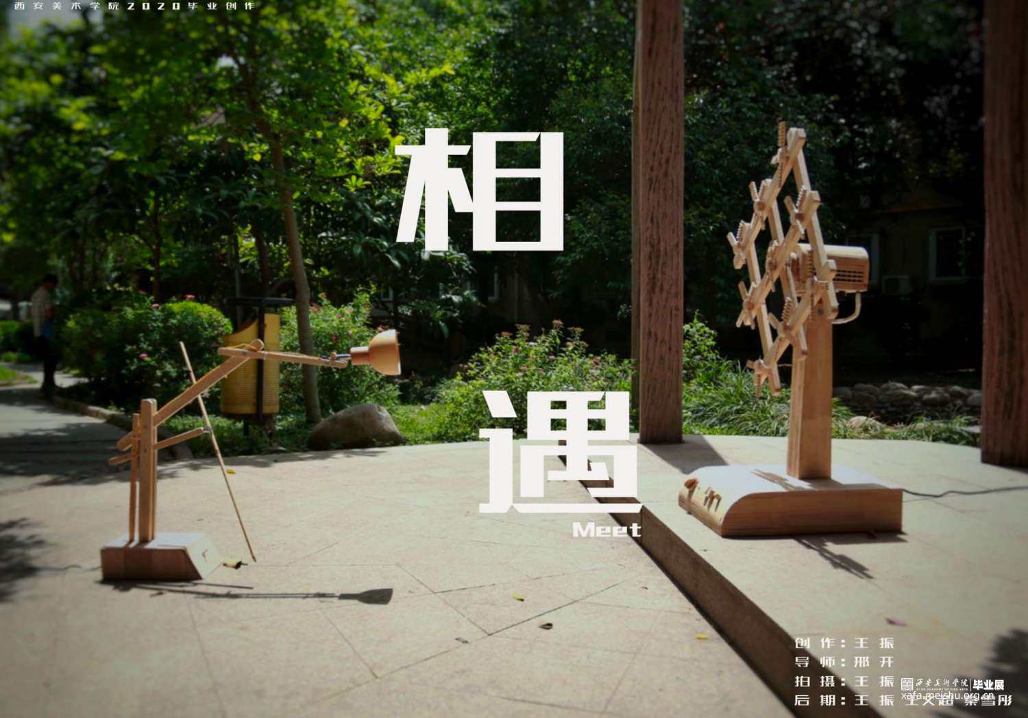 相遇系列由《相遇-大甲》和《相遇-小乙》两件作品组成,为可动装置,主要为橡木材质,大甲和小乙都是来自现实中的人,加以艺术创作后,再次回归现实生活中去,每个人在仔细阅读后都可以看到生活中自己的身影。《相遇-大甲》和《相遇-小乙》均为装置作品,创作材料为橡木,减速电机组,多种开关,变压器,电流调节器。可实现人机互动。每一个开关控制相应的功能,可以实现大甲的定时开关,左右转头,扇叶整体旋转,九个小叶片的转动和速度调节。实现小乙的电灯的开关,导盲杆的运动,机身的上下运动(具体运动方式可观看视频https://www.bilibili.com/video/BV1Wv411672W/)。