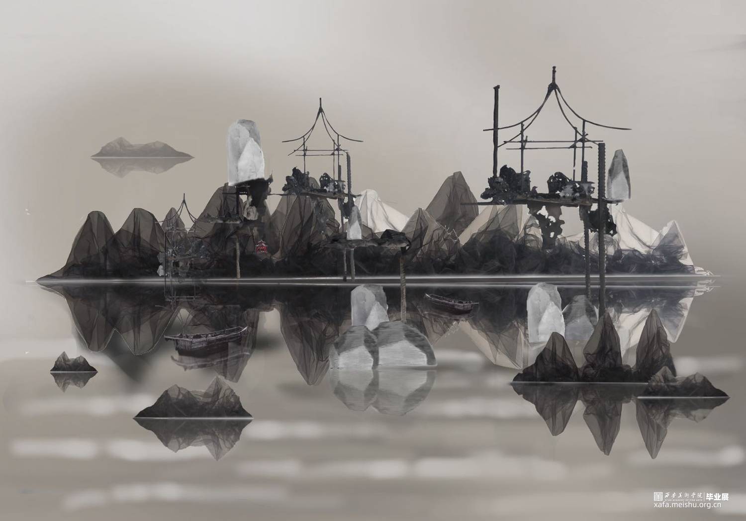作品的创作初衷是基于本人对中国传统水墨画的热爱与追求。以黑纱布这种简单常见的材料进行挤压,灼烧,堆叠等塑造手法使其有画中水墨的韵律。 运用这种新的造型语言来营造中国古代山水之境。同时创作中的木质船舶,金属的房屋。造型丰富,使作品静中有动动中有静。