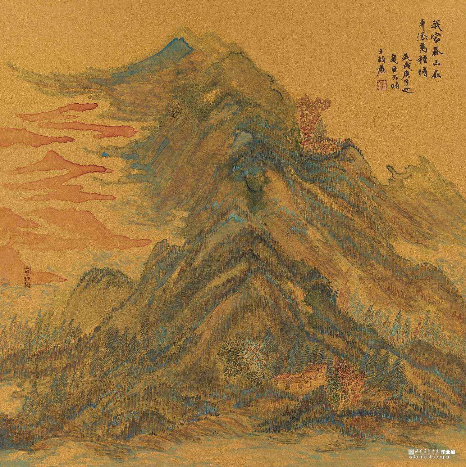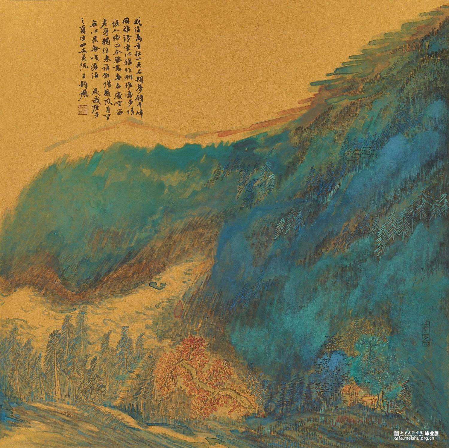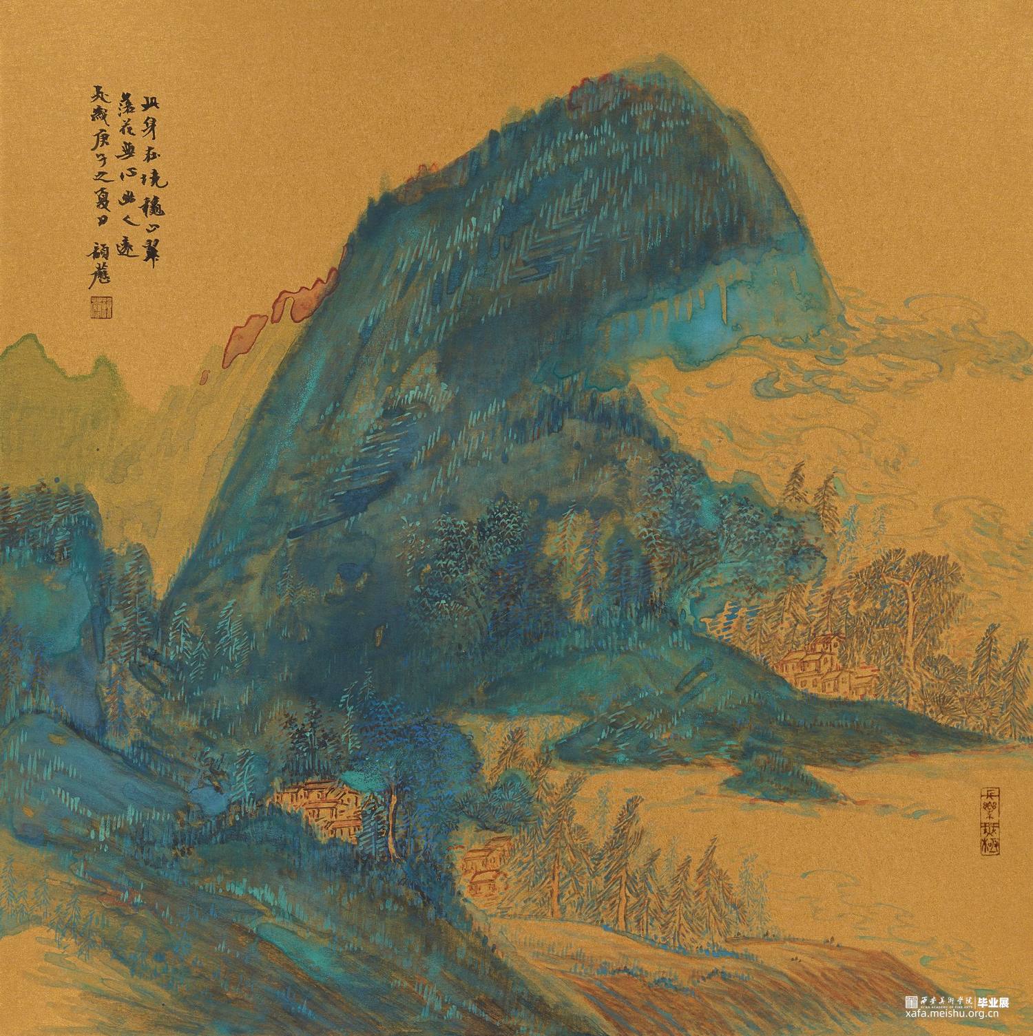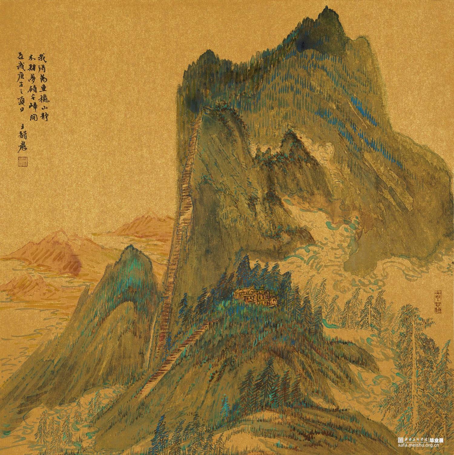 清绿设色源于‘山水’之中,二者相融便可曲古而熠熠生辉。余体宇宙之大且畏敬自然之道。以秦岭诸山为形绘以心中之象。且谙知“画法通于书法,绘心合于文心”!青绿山水设色以“清润而不浮薄,沉厚而不晦滞,明丽而不甜俗"为理想效果。余以金潜卡纸底,勾勒峭仞耸巍的秦岭山脉。先用草木之色点活,再覆以金石者,而草木得以附金石而久。层层叠之,终现其色。"画固所以象形,然不可求之形象,而当求于形象之外"。故名曰《象·迹》或得意忘形耳。此余之画所得也!