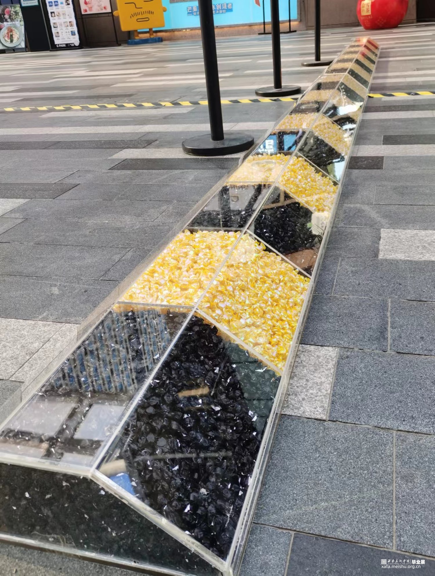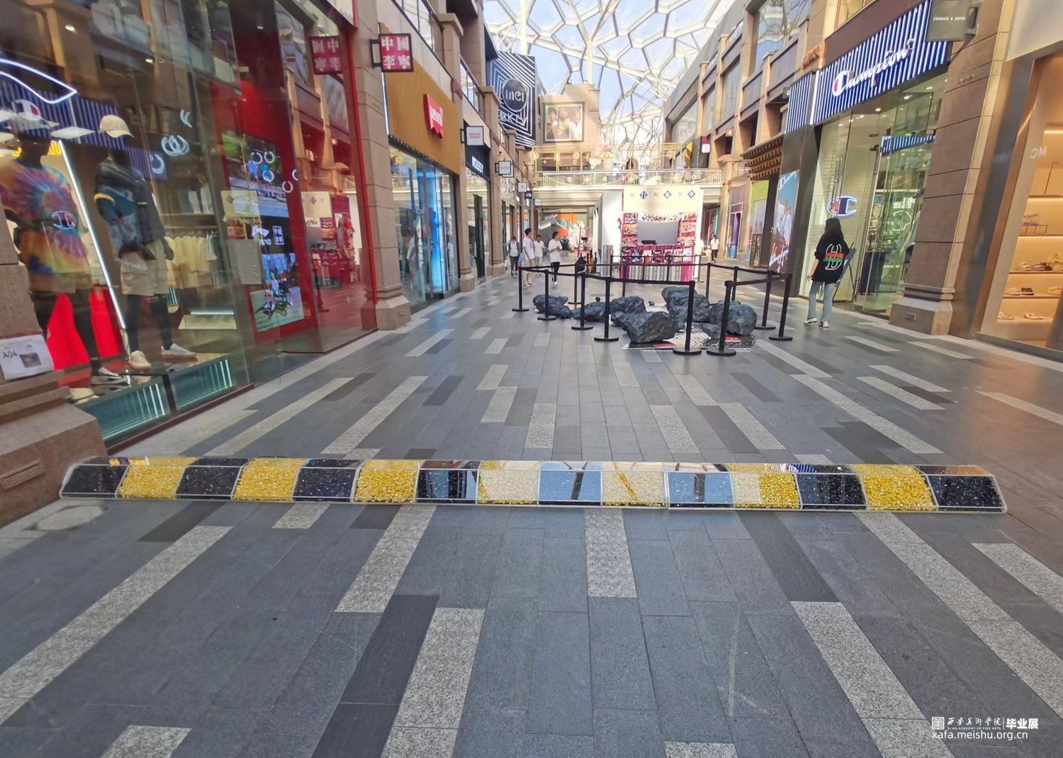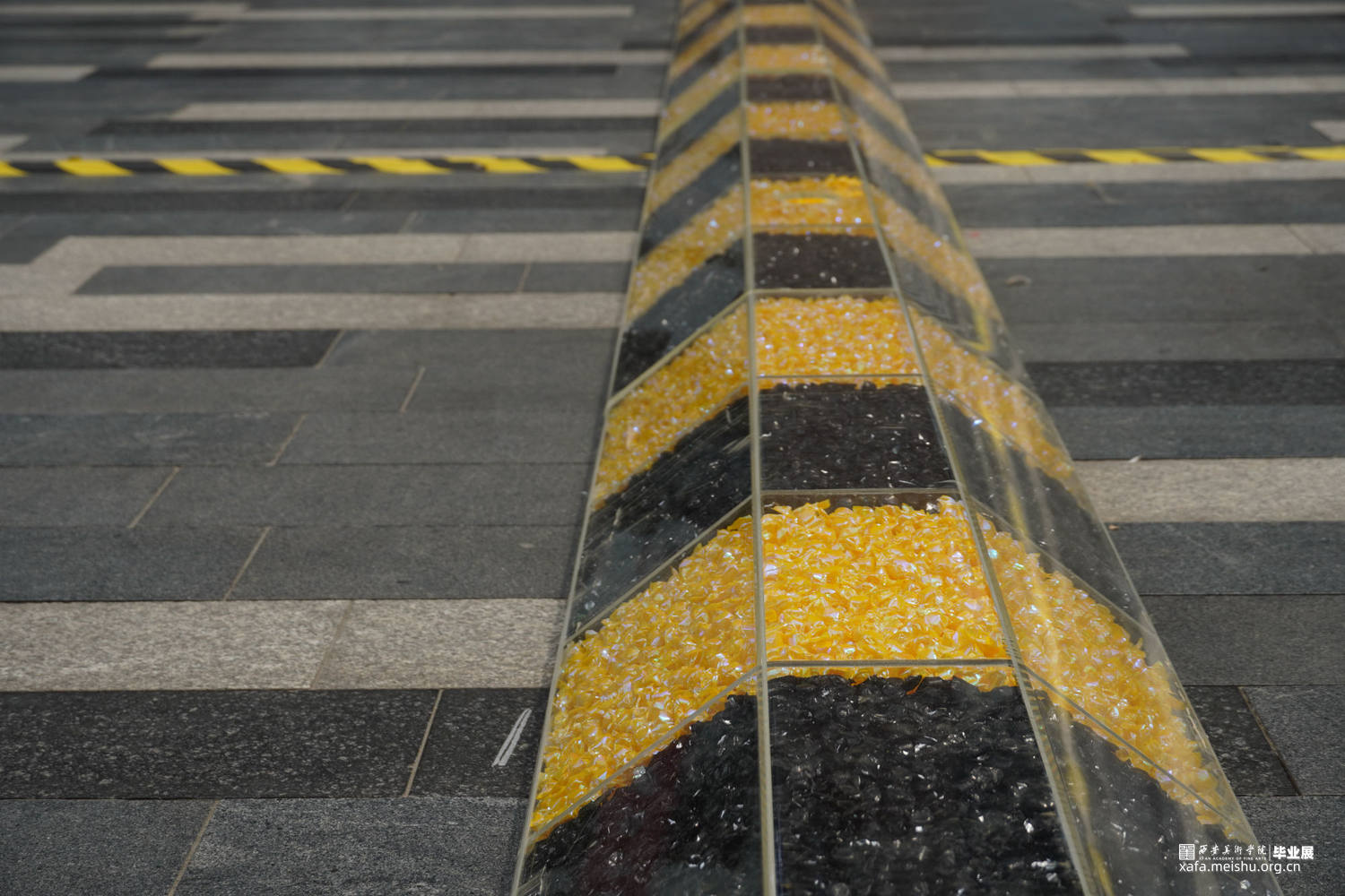 减速带是人类社会的一种交通规则,作品用糖果来构成“减速带”,通过吃掉糖果来消解规则。当它放置在商场里时阻碍着人们正常的行走,也在发挥着“减速”的作用。随着展览进行,“规则”被不断拿走吃掉。