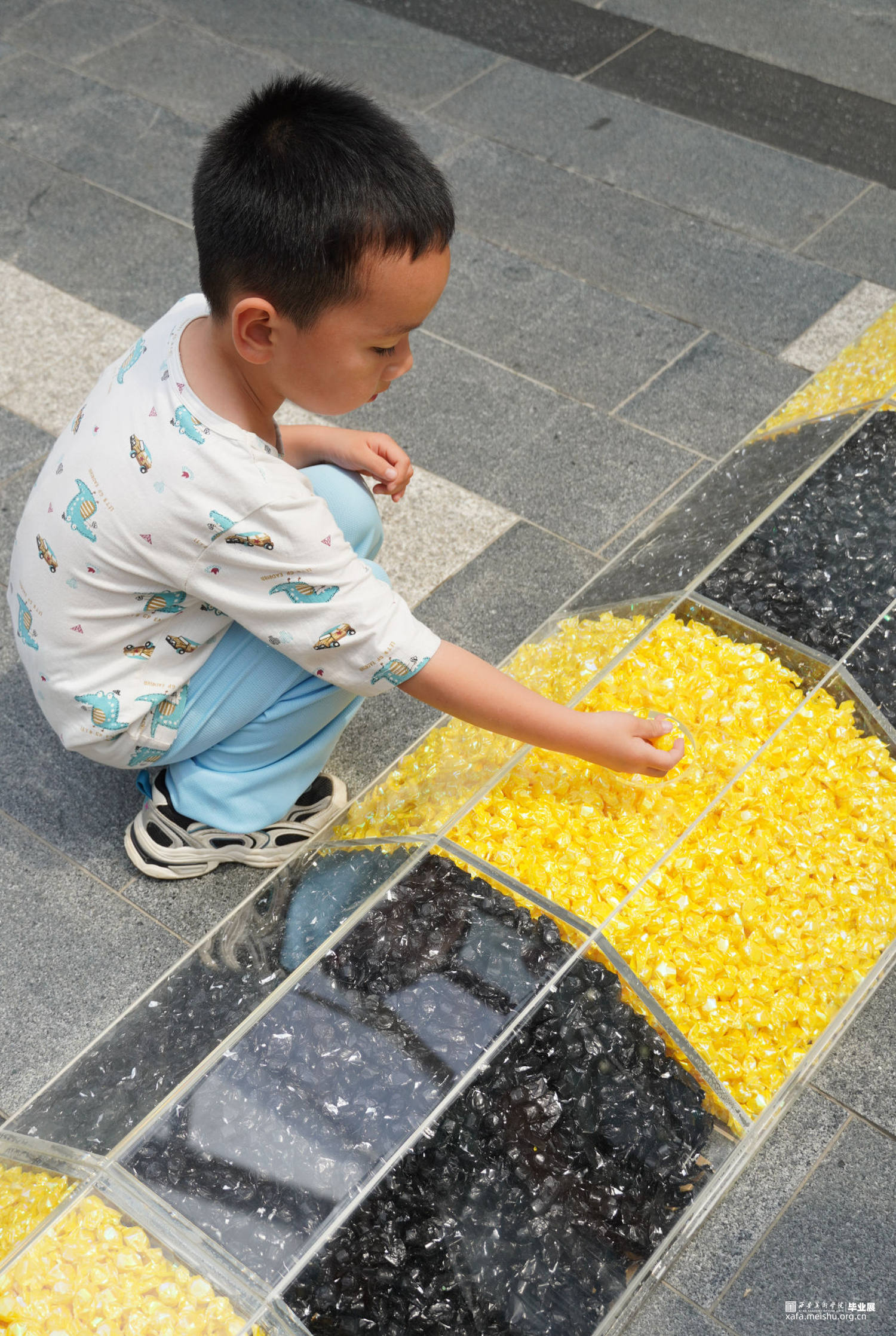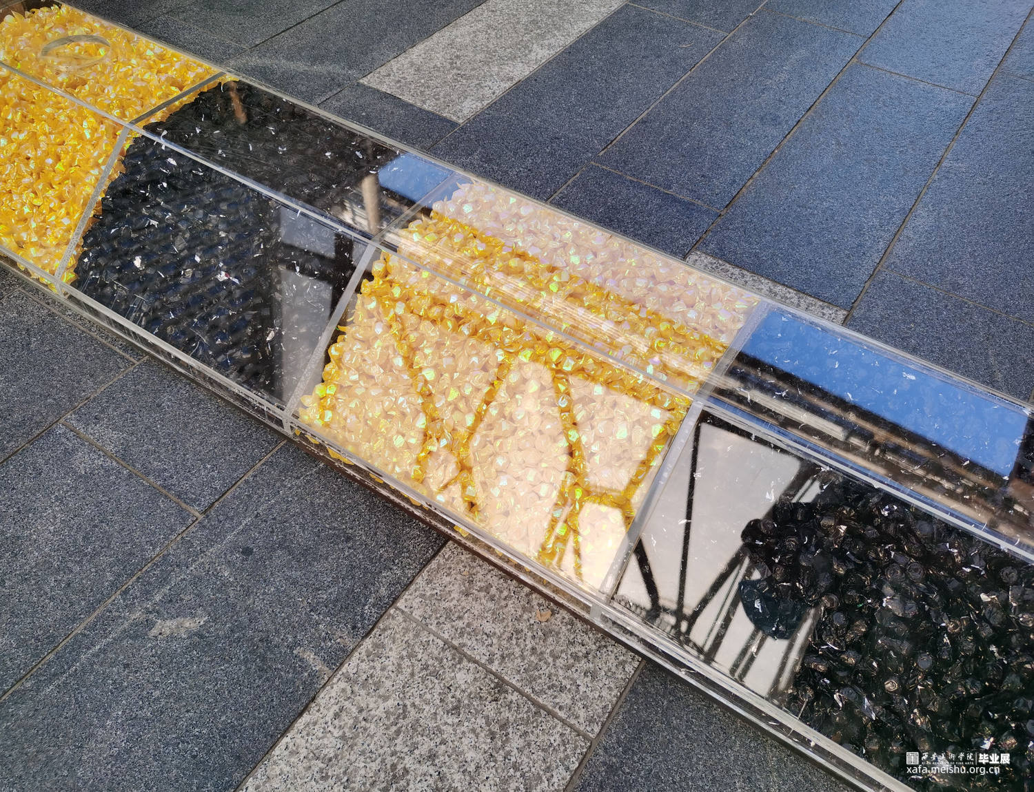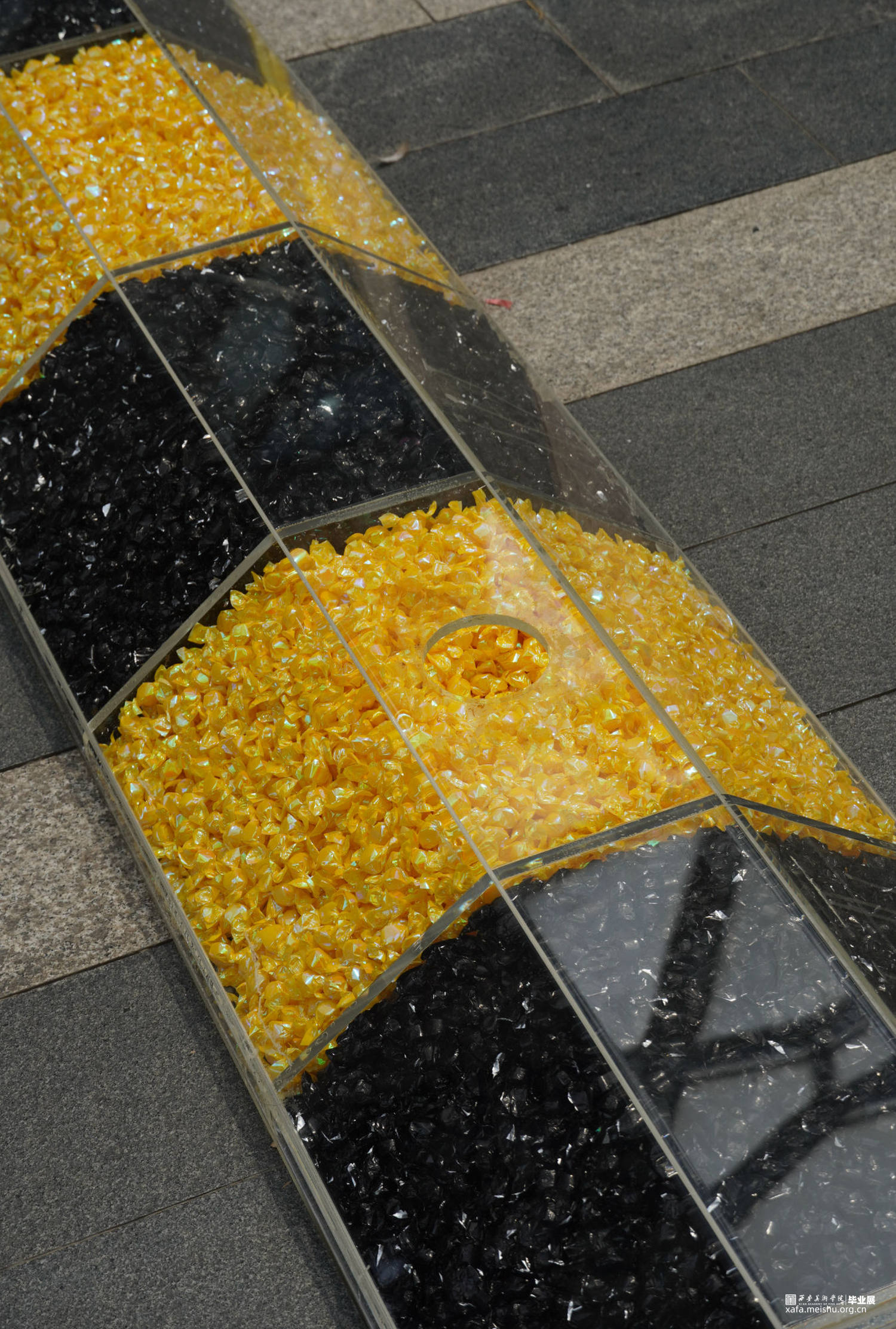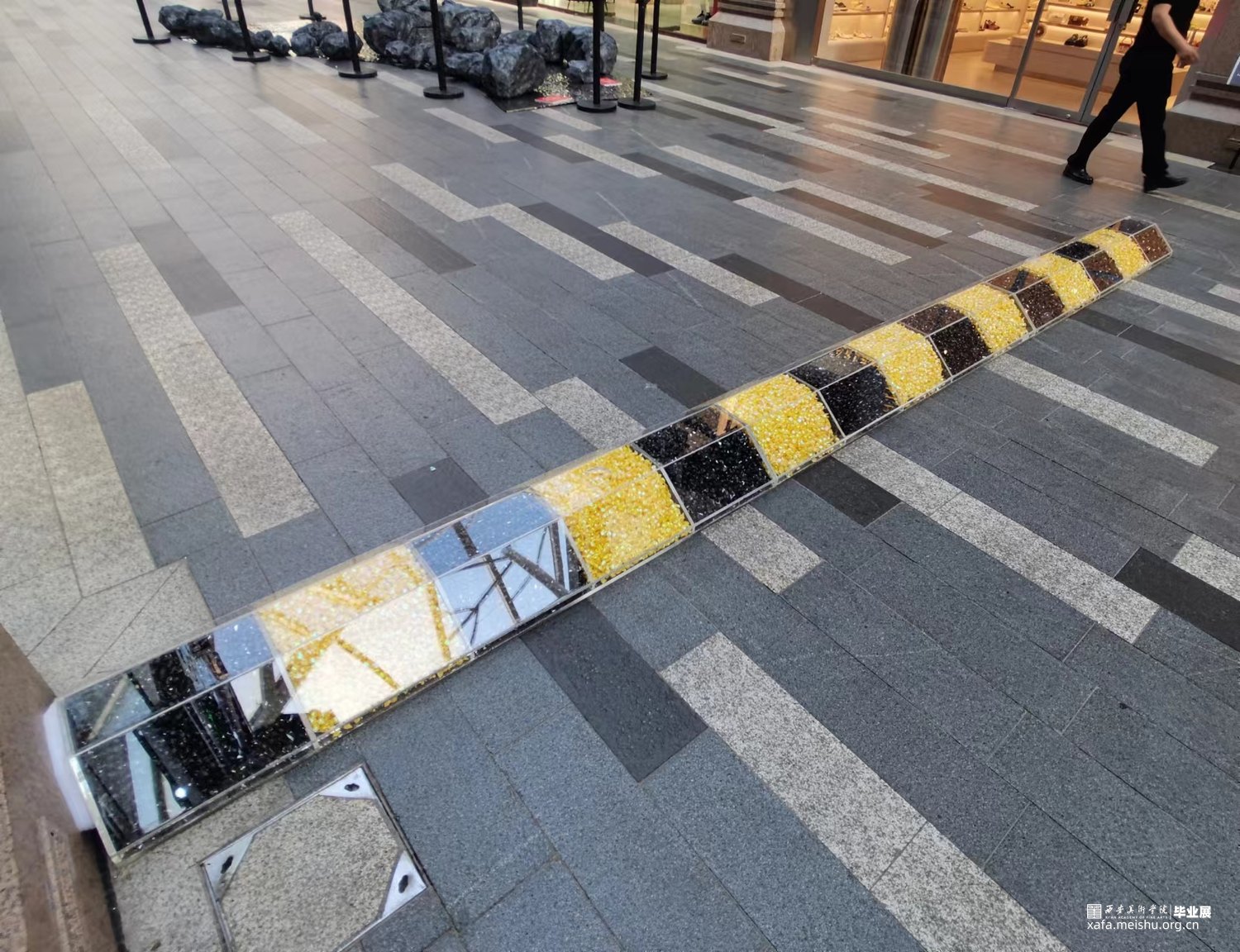 减速带是人类社会的一种交通规则,作品用糖果来构成“减速带”,通过吃掉糖果来消解规则。当它放置在商场里时阻碍着人们正常的行走,也在发挥着“减速”的作用。随着展览进行,“规则”被不断拿走吃掉。