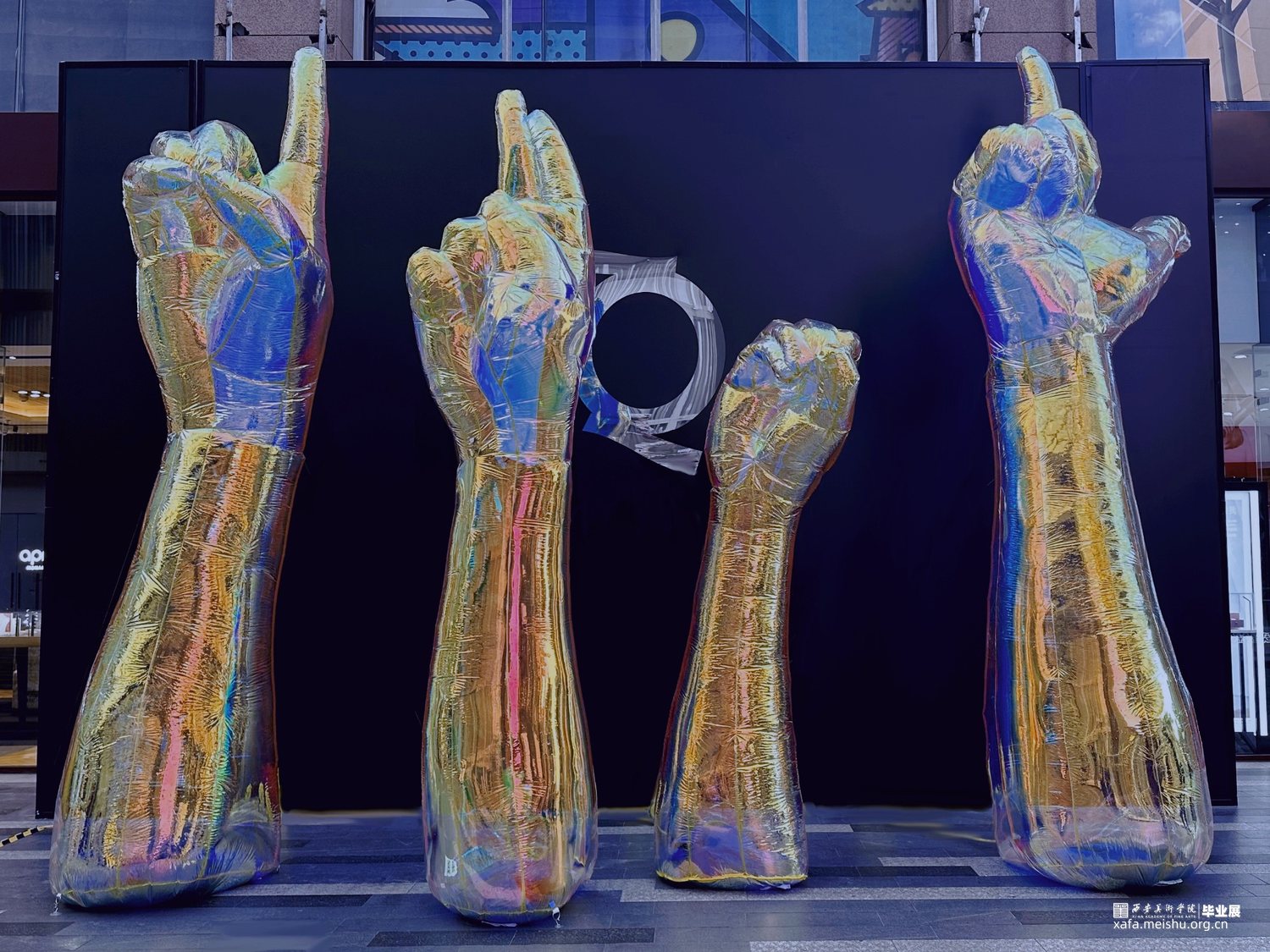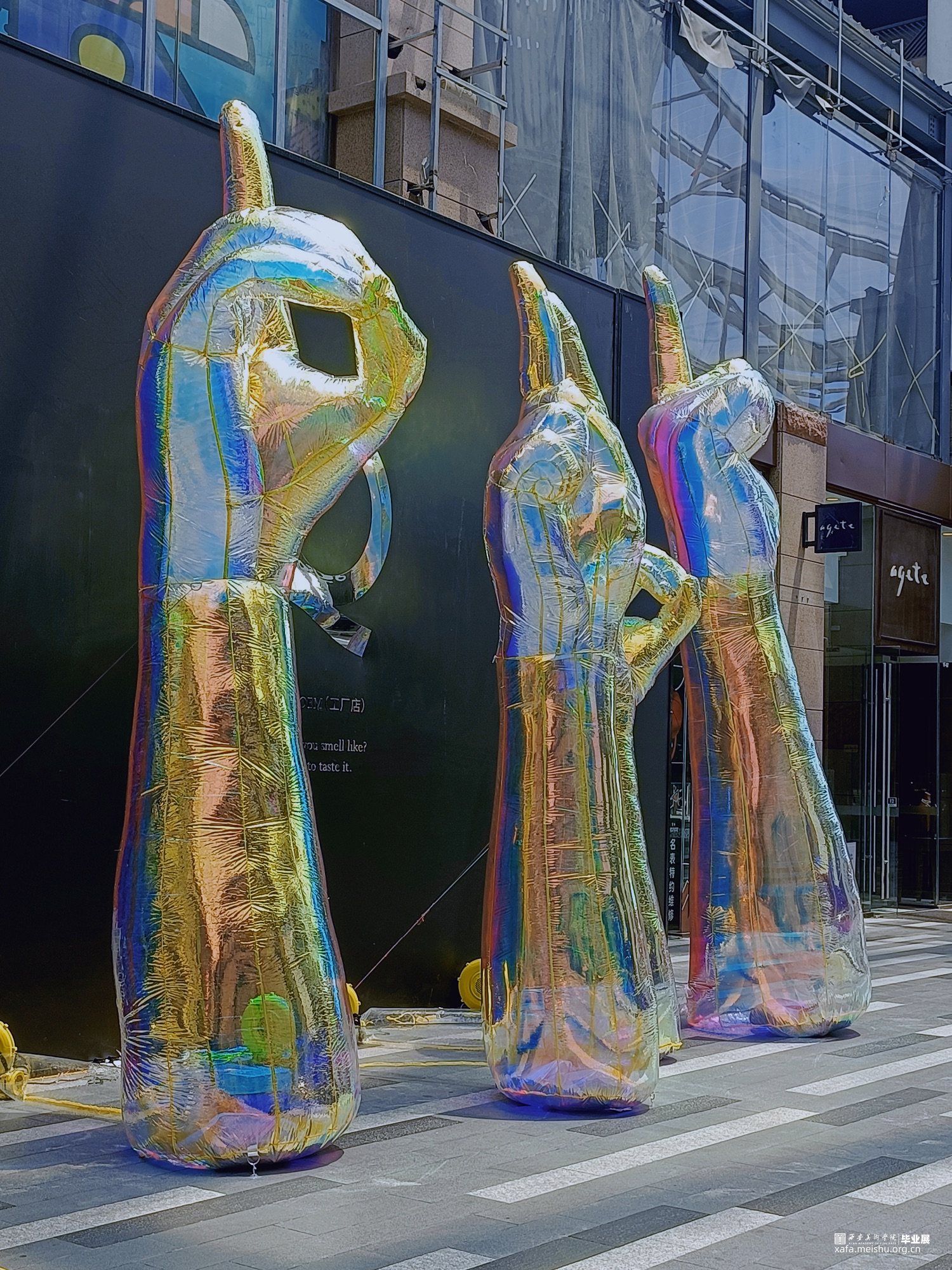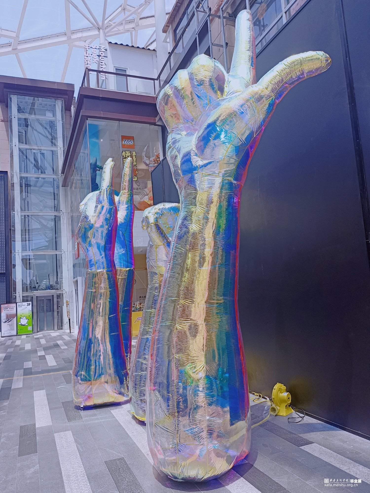 作品采用气膜充气时的喧嚣和斑驳的色彩,呼应听障人群内心世界渴望与常人一样“大声说、大声喊、大声笑”的诉求与心愿。以手语字母为原型拼出单词“loud”,发出无声之言,旨在于沉默不语中发出喧嚣。