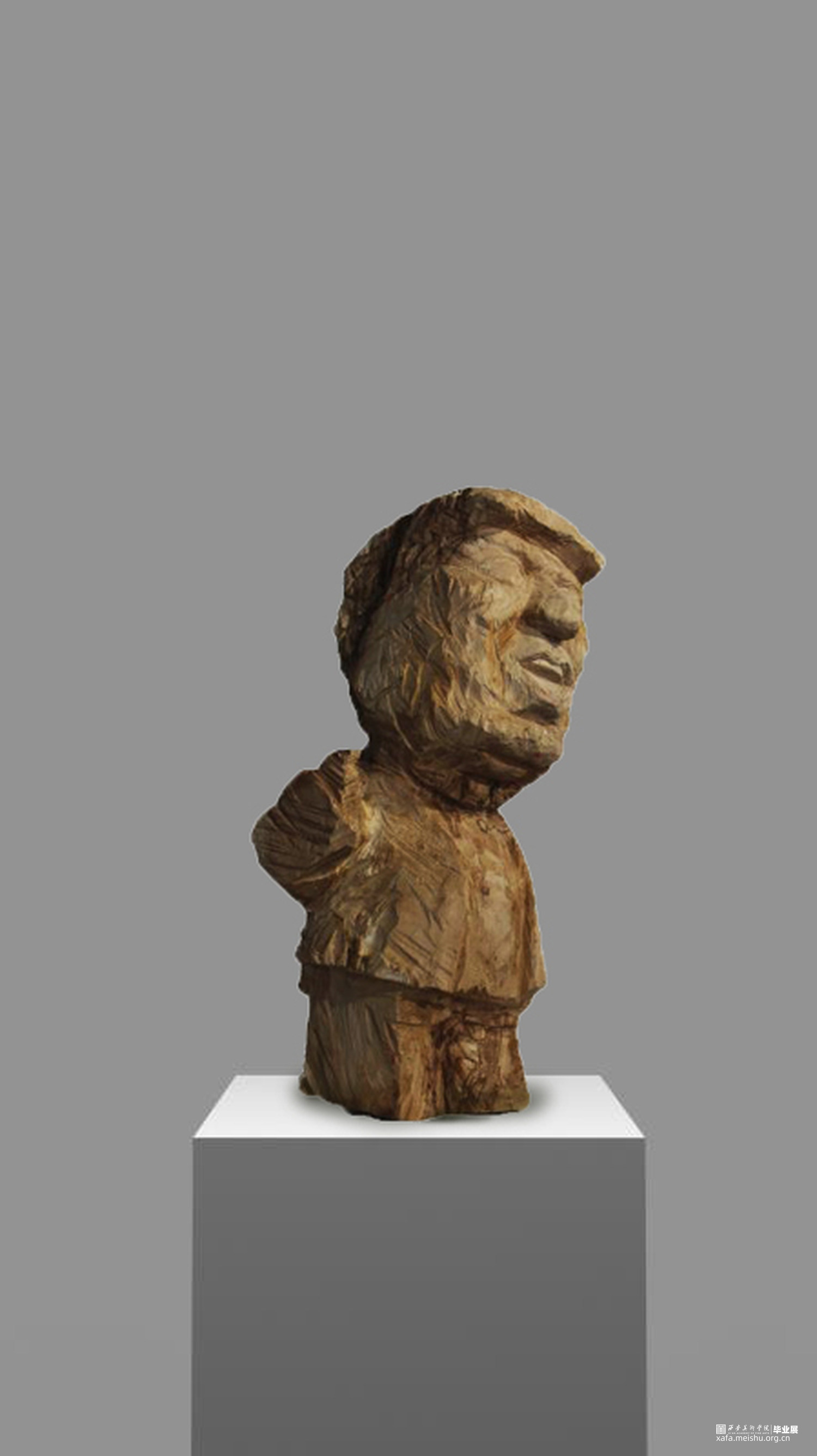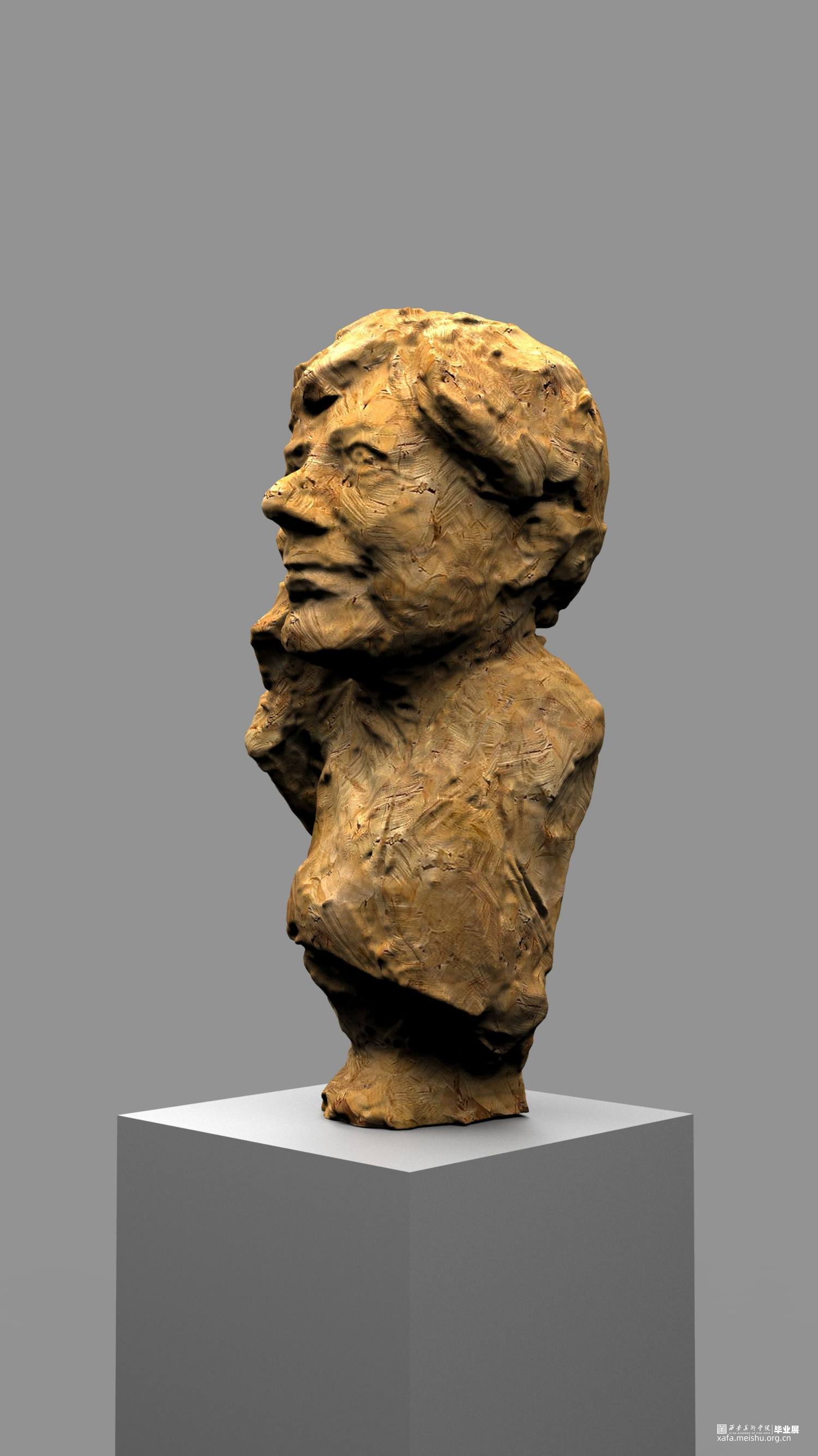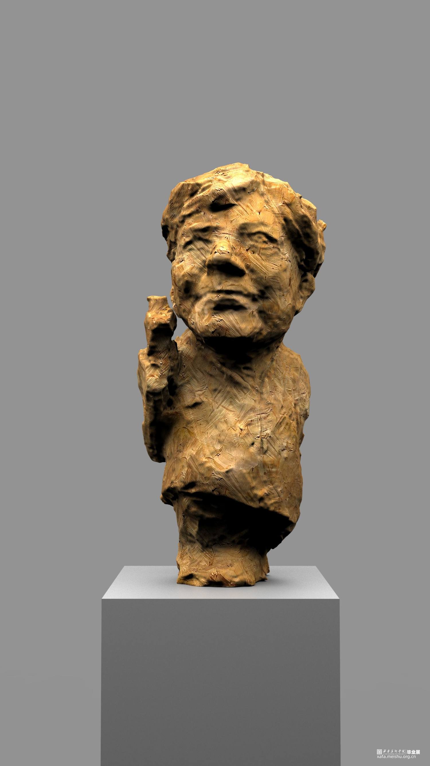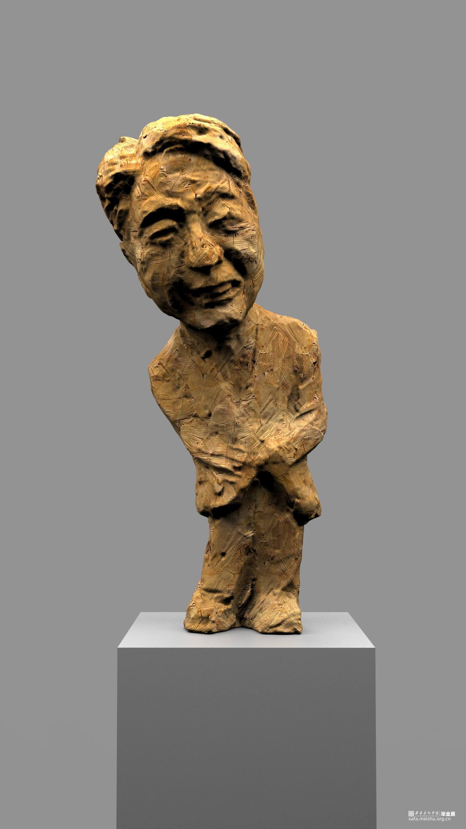 本次雕塑创作,特意选择了木头这个常见的与人们得生活息息相关的材质,木头作为雕塑的传统材料之一,它的历史悠久,是一种纯天然的产物,拥有着不同于其他材质的独特属性和材料表现语言。它的成长历经沧桑,一圈圈的年轮是岁月流逝留下的印记,也是生命气息的见证,不管是从视觉上或者触觉上木头都散发着一种温情、亲切、质朴、自然的特性,对于生命而言树木有一种被依赖的感觉。木头的这种特性与我的人物题材雕塑创作非常吻合,散发着生命的气息同时也具有一定的历史沧桑感。