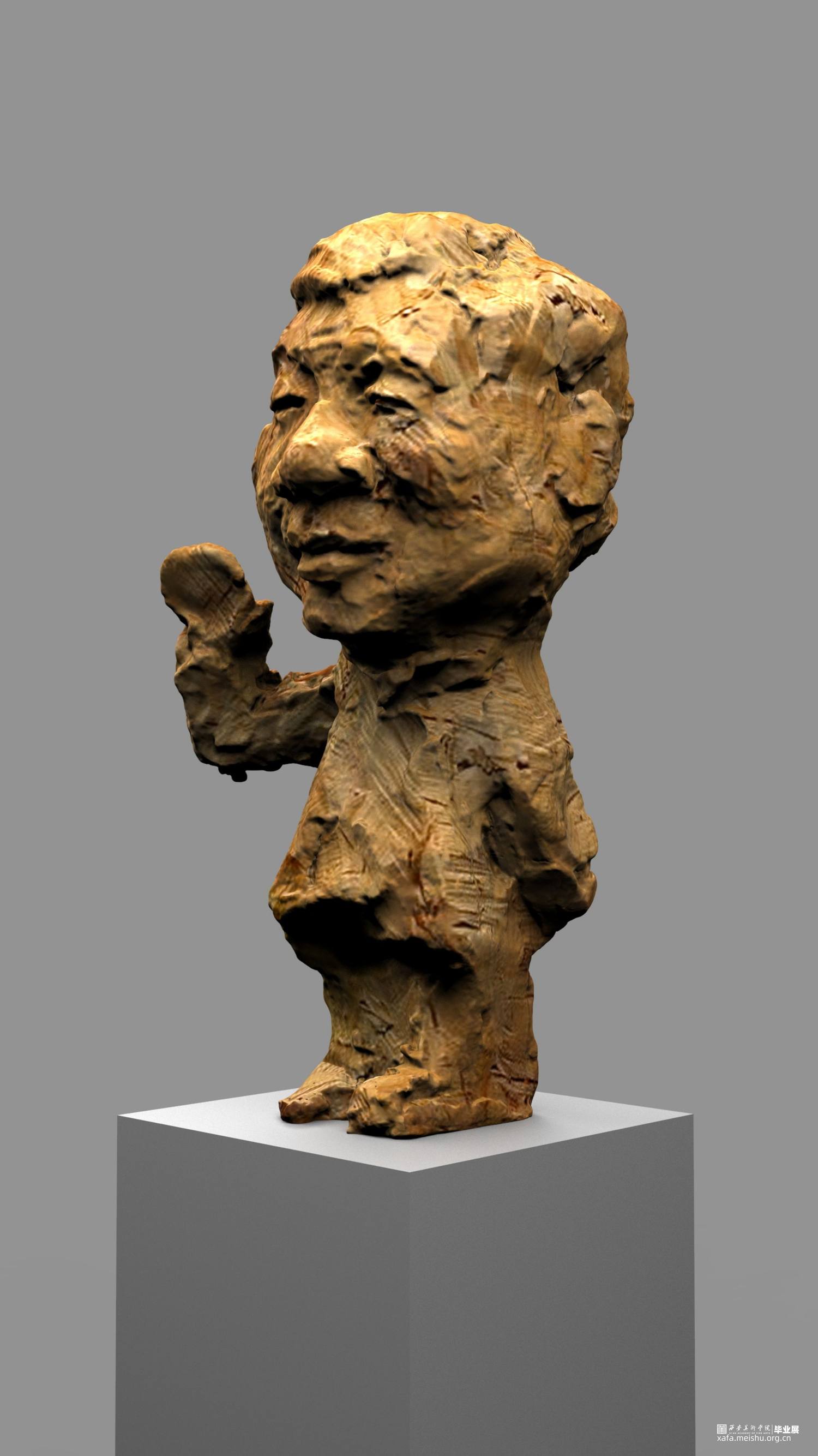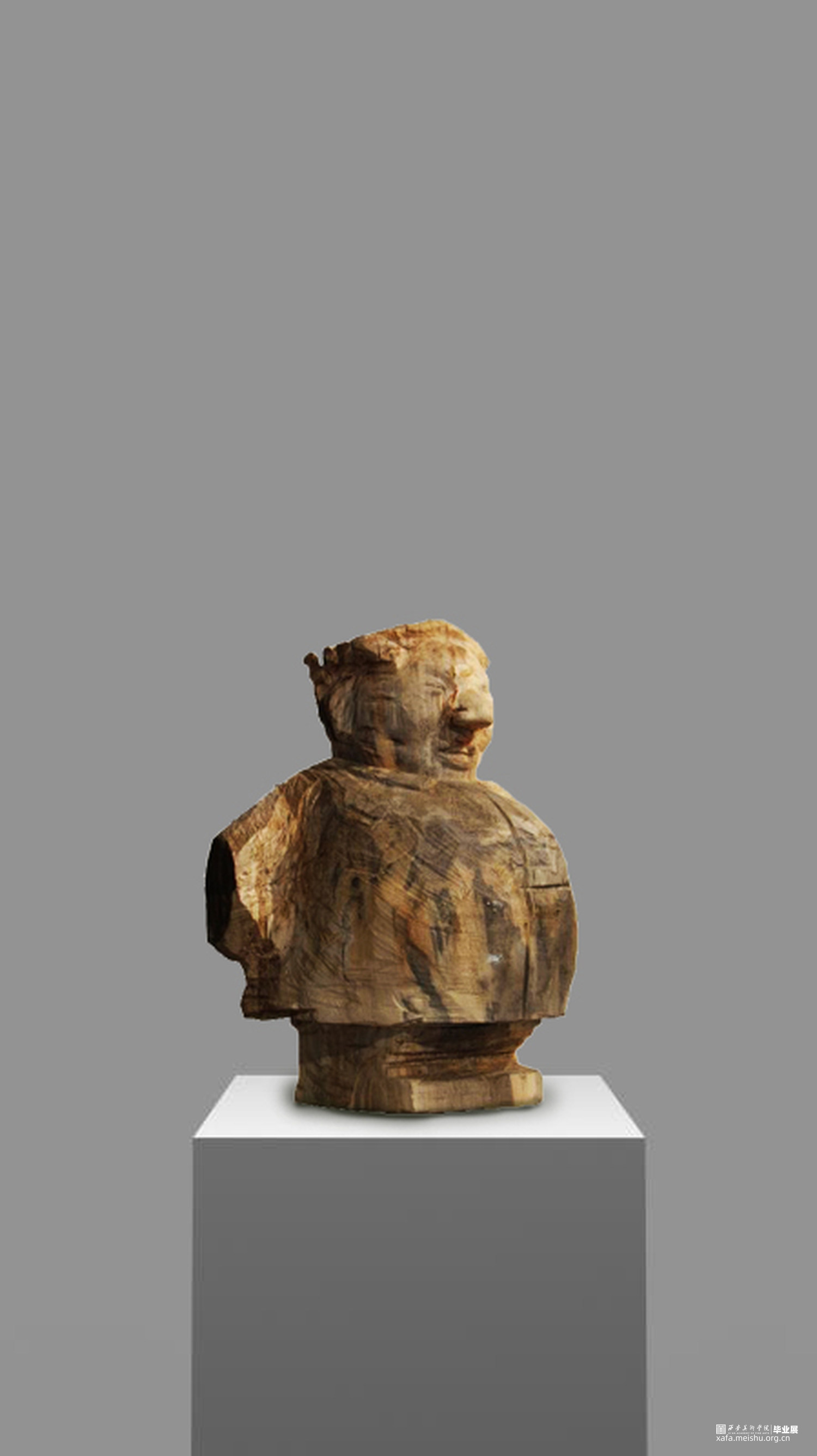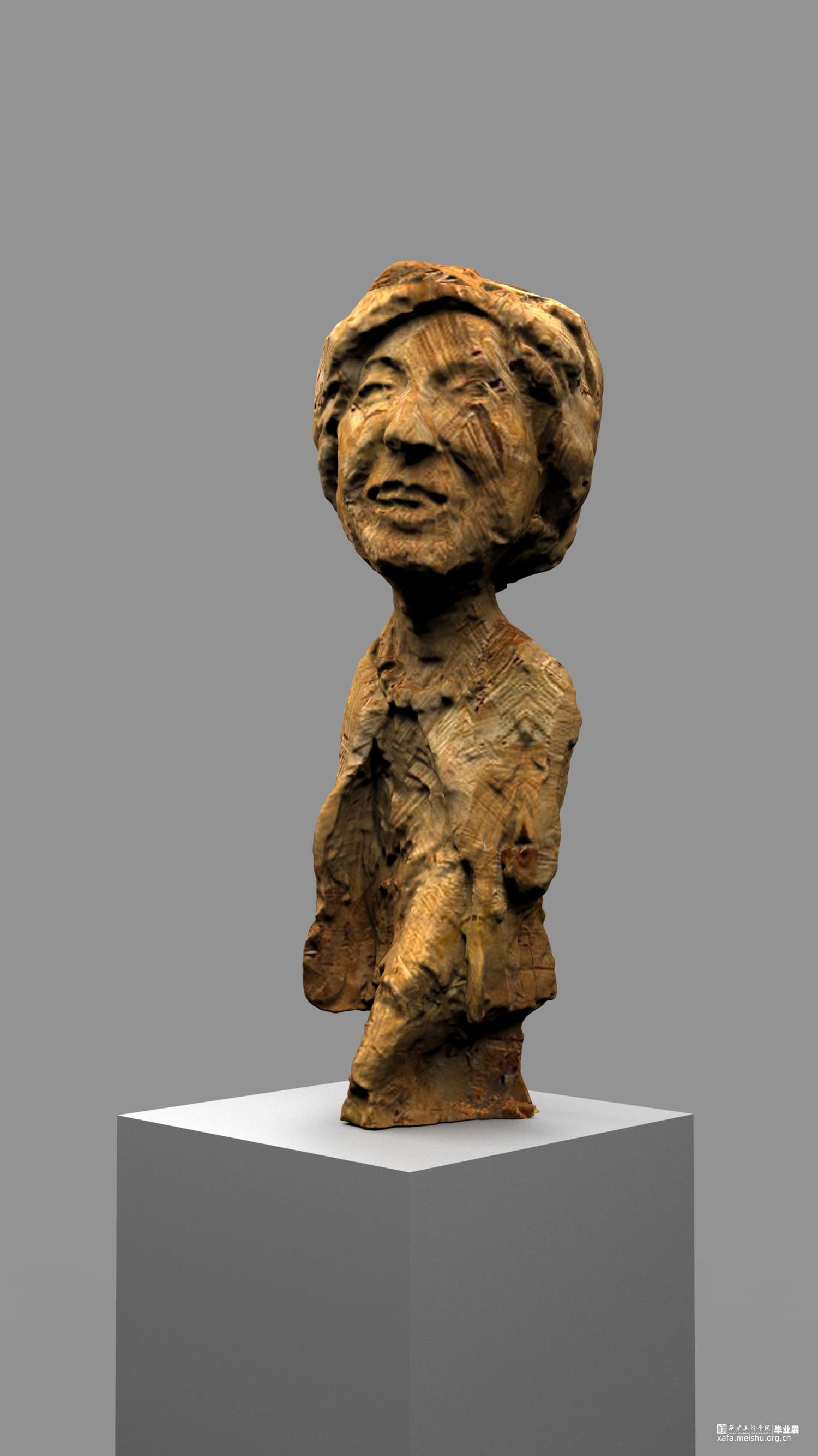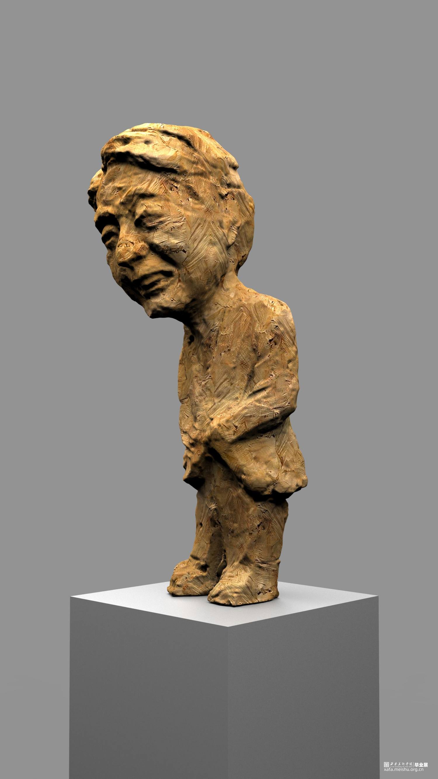 本次雕塑创作,特意选择了木头这个常见的与人们得生活息息相关的材质,木头作为雕塑的传统材料之一,它的历史悠久,是一种纯天然的产物,拥有着不同于其他材质的独特属性和材料表现语言。它的成长历经沧桑,一圈圈的年轮是岁月流逝留下的印记,也是生命气息的见证,不管是从视觉上或者触觉上木头都散发着一种温情、亲切、质朴、自然的特性,对于生命而言树木有一种被依赖的感觉。木头的这种特性与我的人物题材雕塑创作非常吻合,散发着生命的气息同时也具有一定的历史沧桑感。