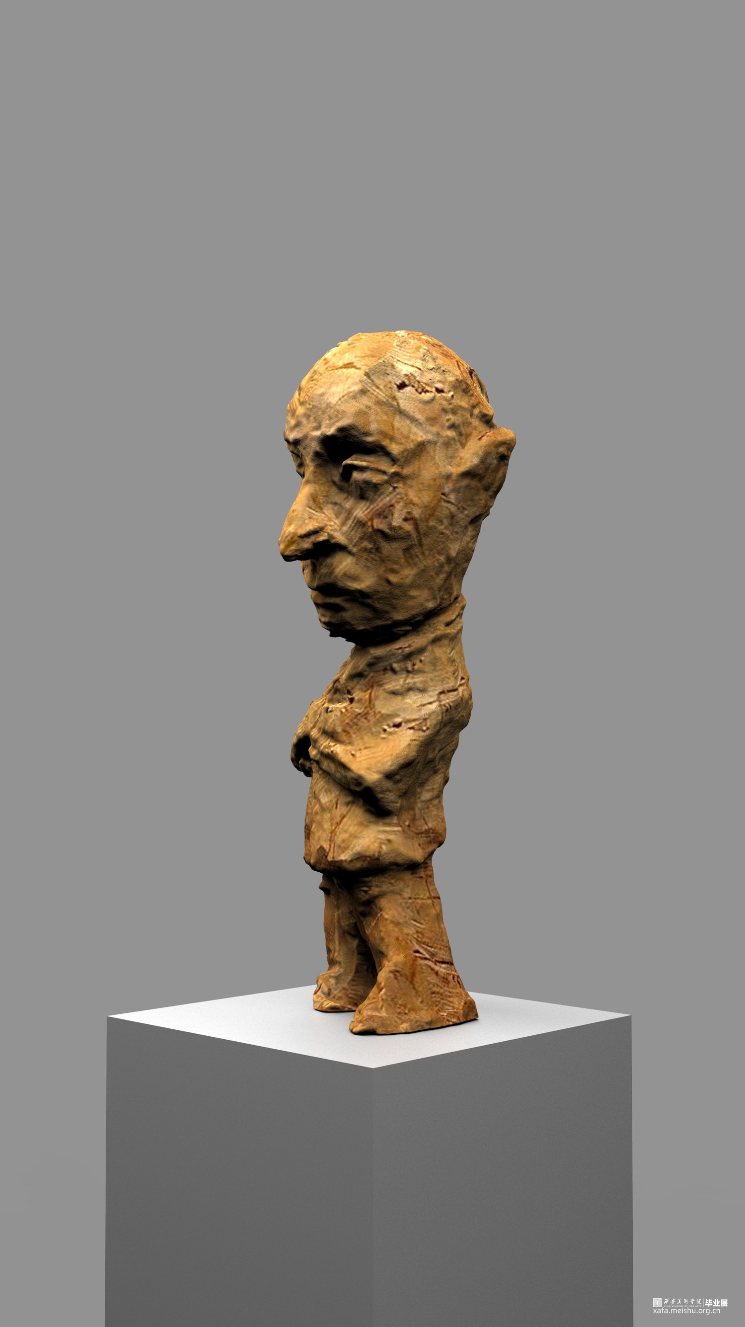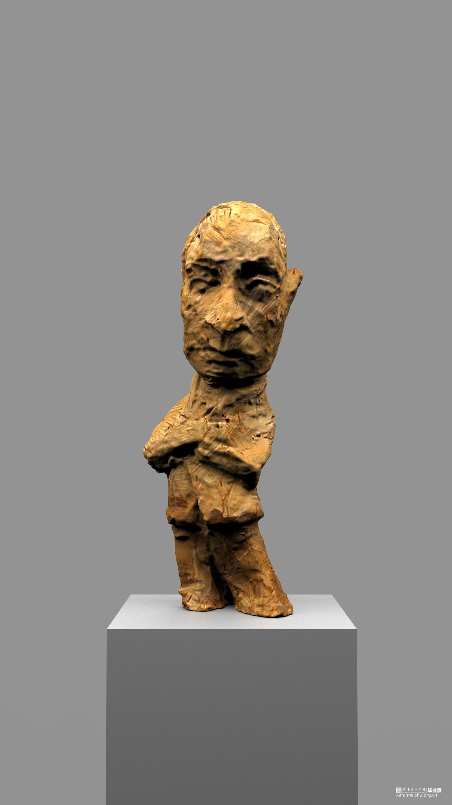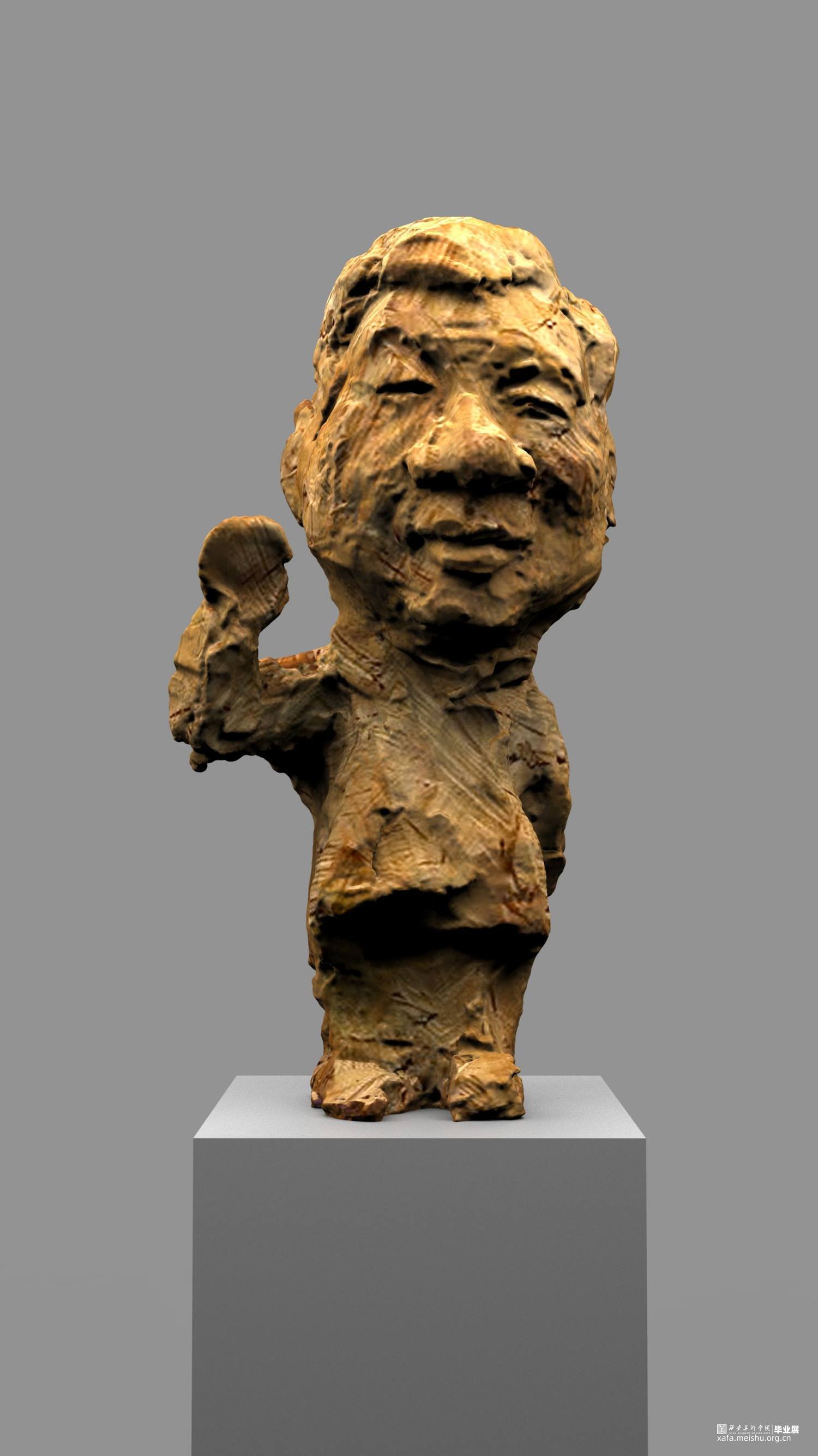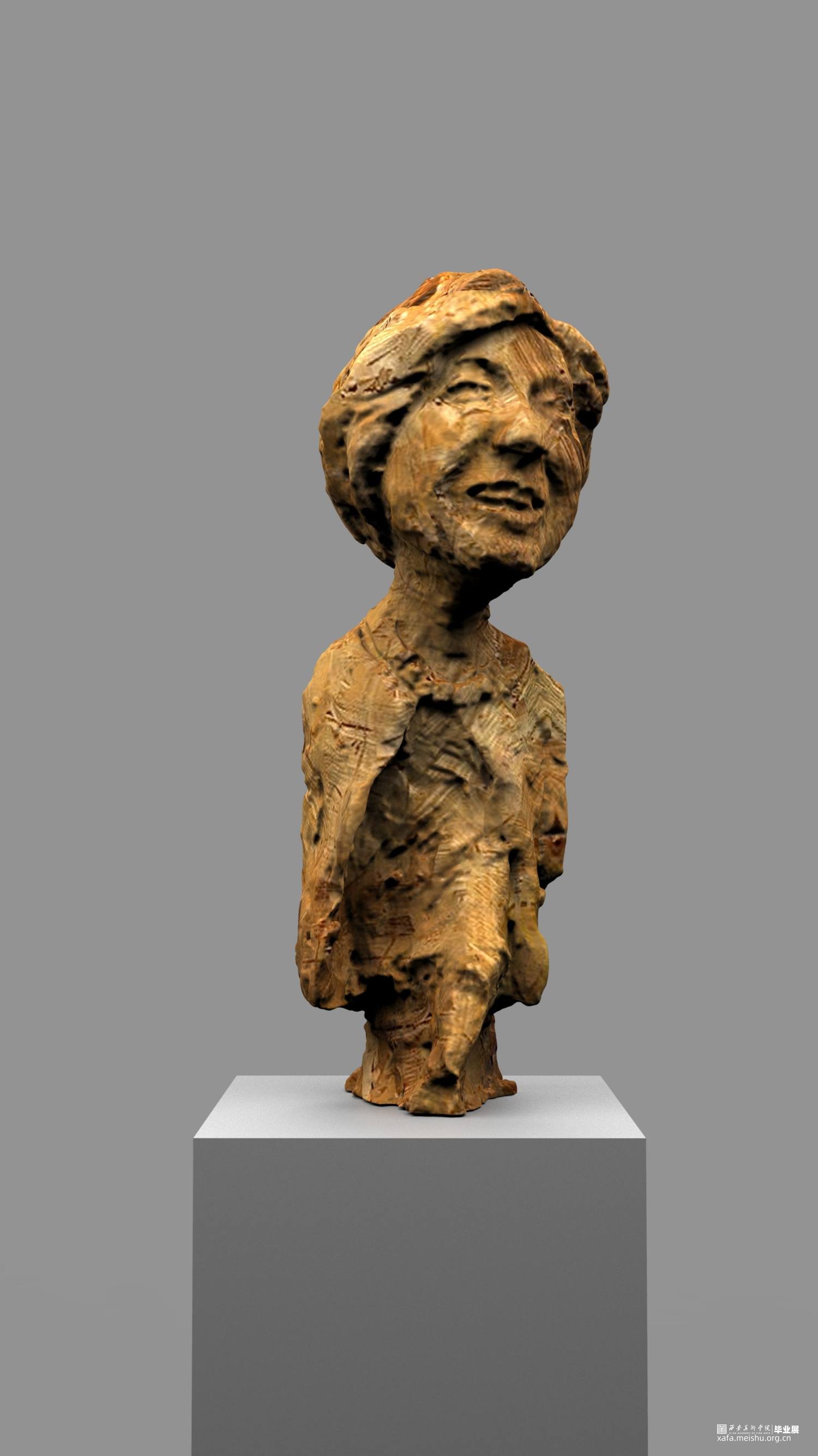 本次雕塑创作,特意选择了木头这个常见的与人们得生活息息相关的材质,木头作为雕塑的传统材料之一,它的历史悠久,是一种纯天然的产物,拥有着不同于其他材质的独特属性和材料表现语言。它的成长历经沧桑,一圈圈的年轮是岁月流逝留下的印记,也是生命气息的见证,不管是从视觉上或者触觉上木头都散发着一种温情、亲切、质朴、自然的特性,对于生命而言树木有一种被依赖的感觉。木头的这种特性与我的人物题材雕塑创作非常吻合,散发着生命的气息同时也具有一定的历史沧桑感。