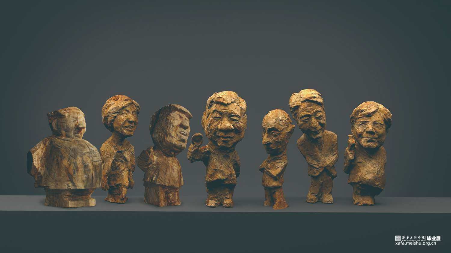 《世界舞台》是一组人物形象创作,结合了卡通艺术风格的特点,采用木雕的形式来呈现。作品整体呈现出大头小身子的卡通人物形象,对每个人物的神态、动态、比例等进了夸张式的提炼和概括,突出他们每个人鲜明的个性特征。