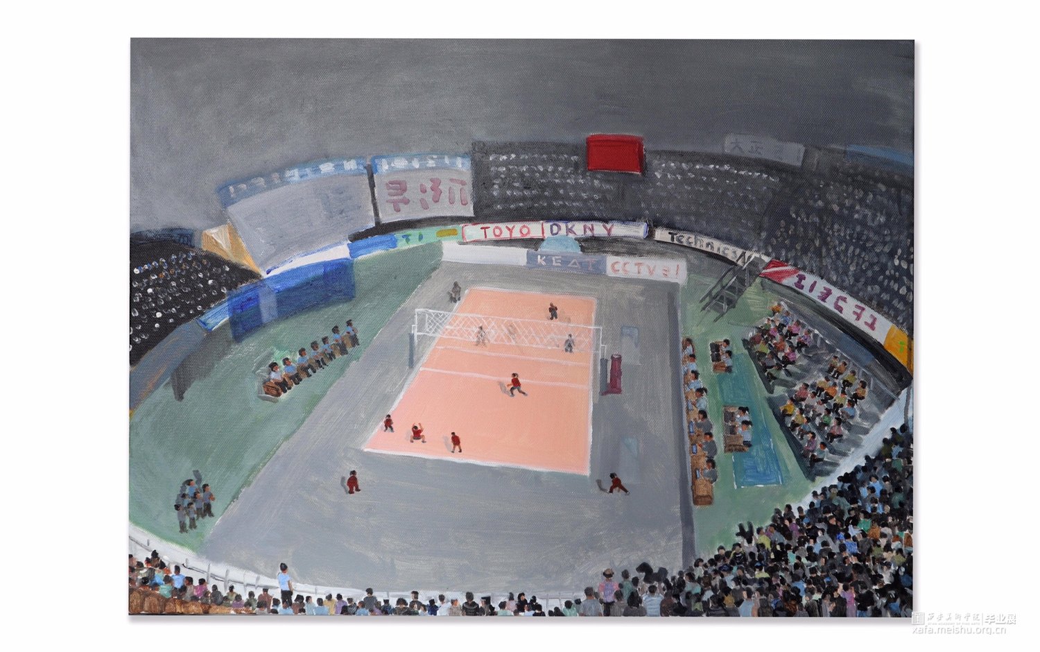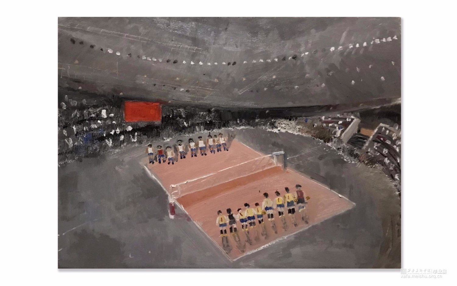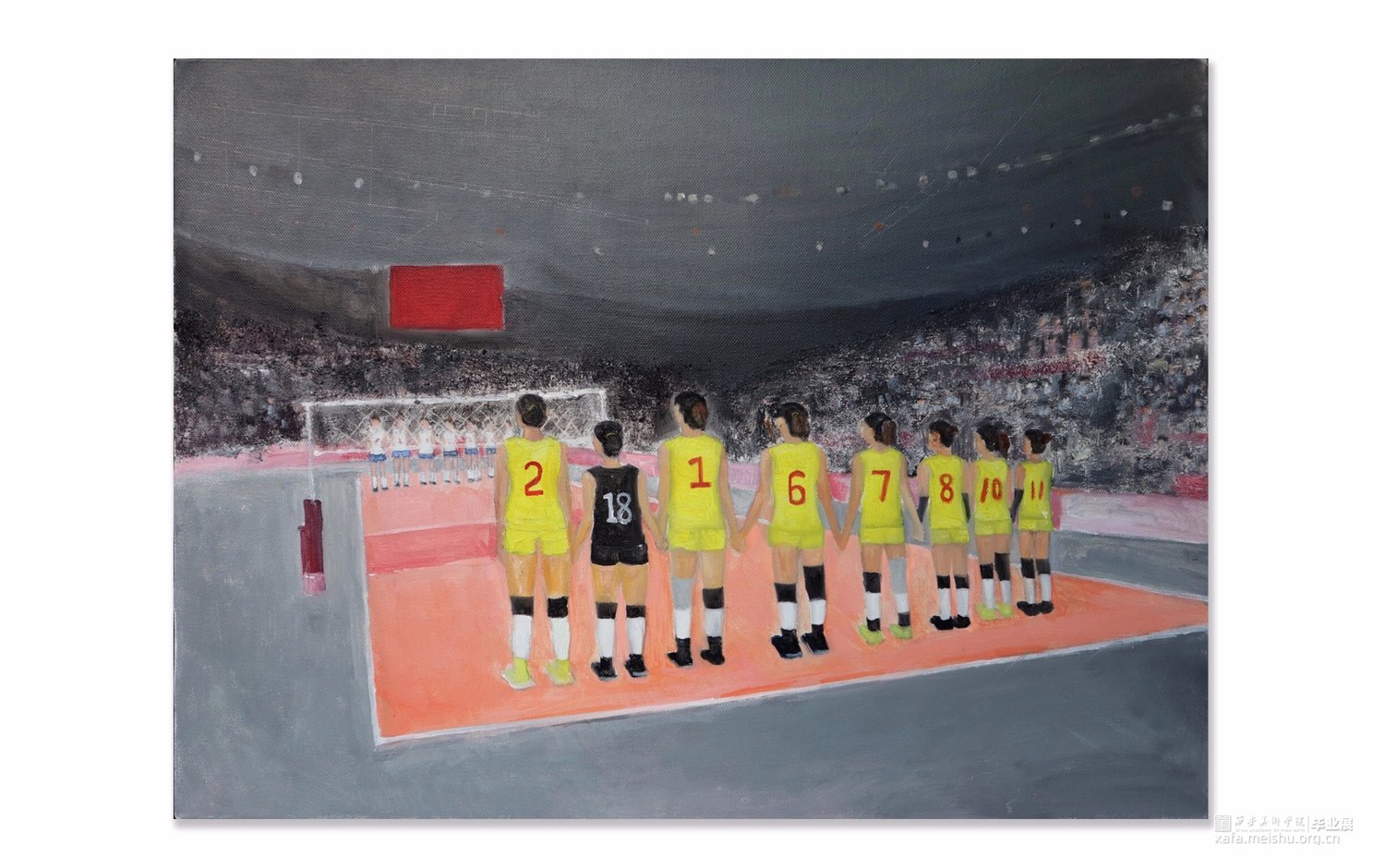 以运动场为源点而创作;通过中国女排来传达的体育精神。在中华,女排正是谱写复兴篇章中振奋精神的浓重一笔。本作品通过对女排赛场的结构还原,以真实比赛为背景,展现女排体育精神背后的坎坷奋斗与赛场之上的辉煌进取。在基本制作上,通过色彩的变化,是希望传达出当一种精神被歌颂的背后,是对输赢的未知。虽然未知,却依旧坚定,竭尽全力的拼搏过程也是形成体育精神的重要部分。通过本作品可以引起人们的反向思考,以赛场映射在生活中的每一时刻,其实胜利不只在赛场,在于每一个中华儿女奋进的每时每刻。