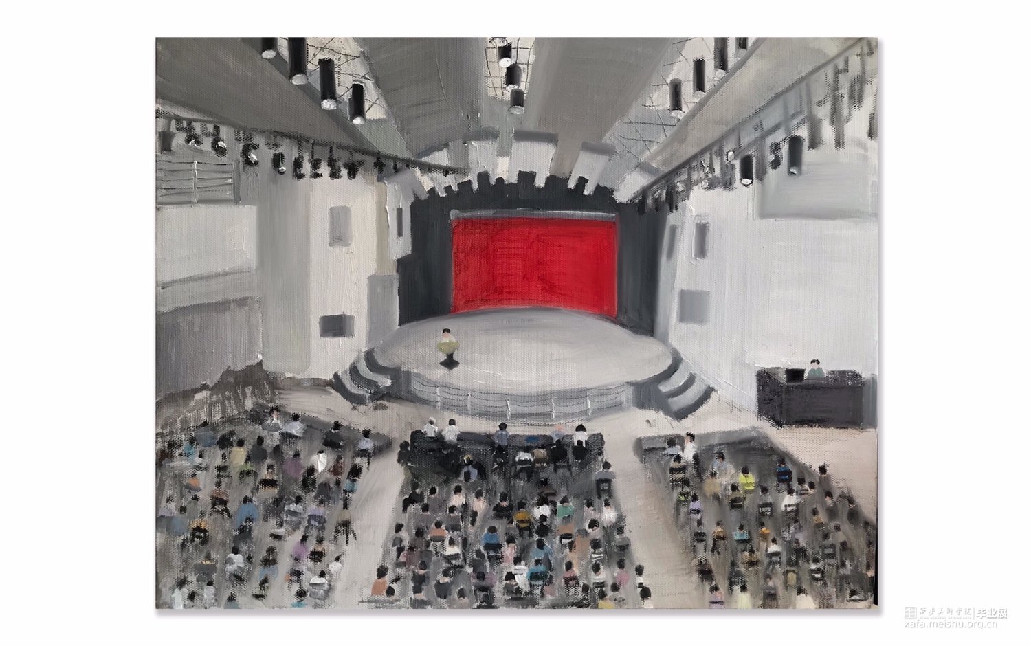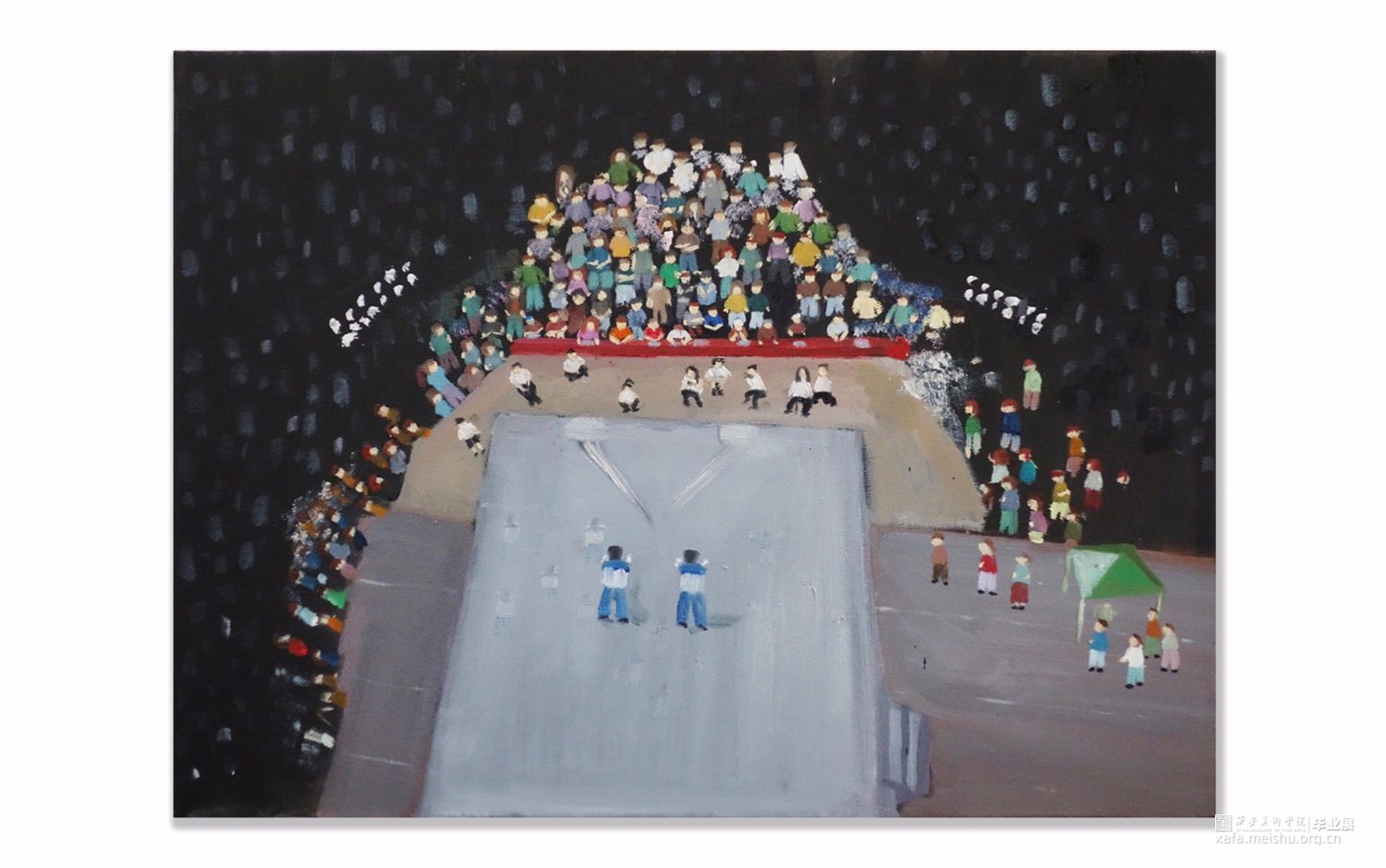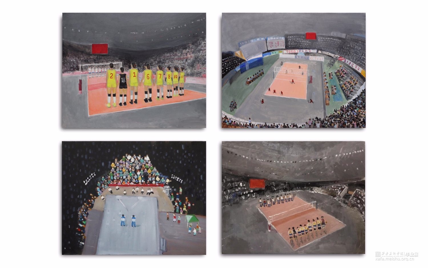 以运动场为源点而创作;通过中国女排来传达的体育精神。在中华,女排正是谱写复兴篇章中振奋精神的浓重一笔。本作品通过对女排赛场的结构还原,以真实比赛为背景,展现女排体育精神背后的坎坷奋斗与赛场之上的辉煌进取。在基本制作上,通过色彩的变化,是希望传达出当一种精神被歌颂的背后,是对输赢的未知。虽然未知,却依旧坚定,竭尽全力的拼搏过程也是形成体育精神的重要部分。通过本作品可以引起人们的反向思考,以赛场映射在生活中的每一时刻,其实胜利不只在赛场,在于每一个中华儿女奋进的每时每刻。