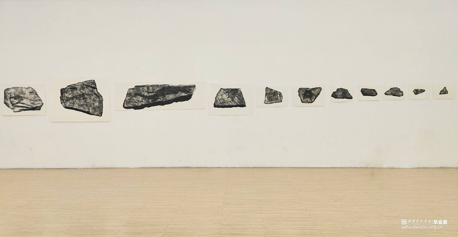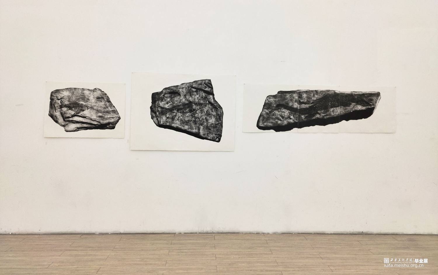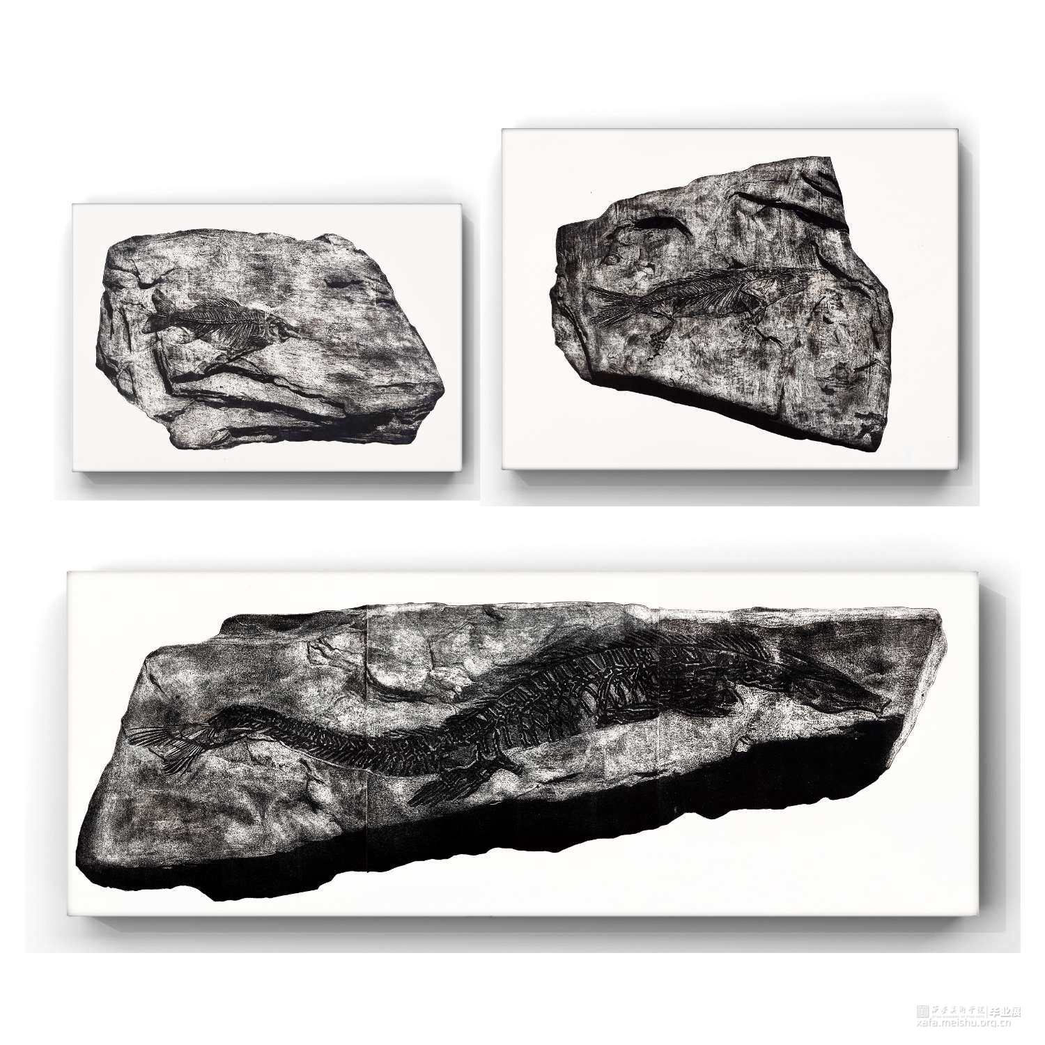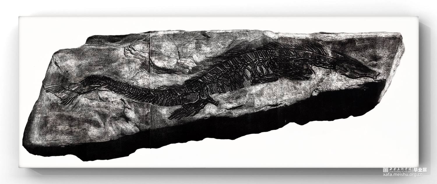 作品分为三个部分。第一部分为自然⻥化石图像以及古代关于鲤⻥化龙的传说和古代有关真龙存在的历史文献,代表着古代历史考古;第二部分为自然⻥变异化石和当代人类社会中不可降解物形成的化石图像,代表着当代考古;第三部分为龙化石图像和来自网络关于真龙存在的文献以及影像资料,代表着未来考古。