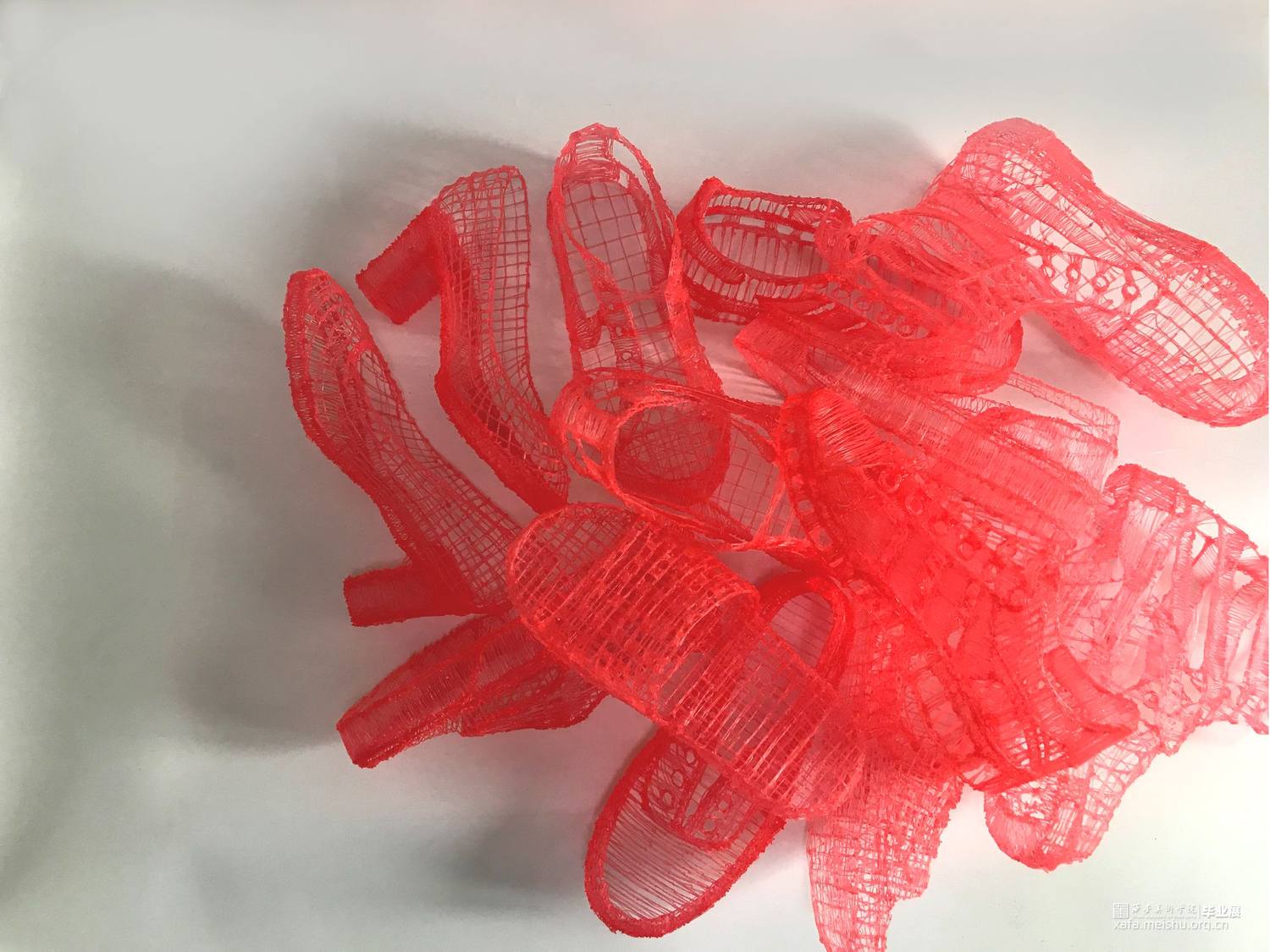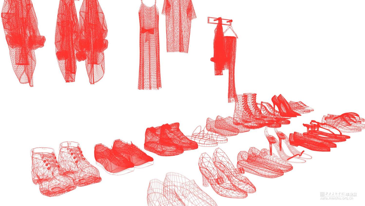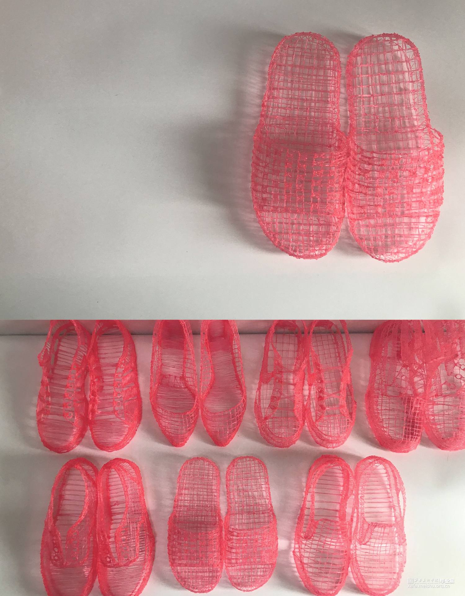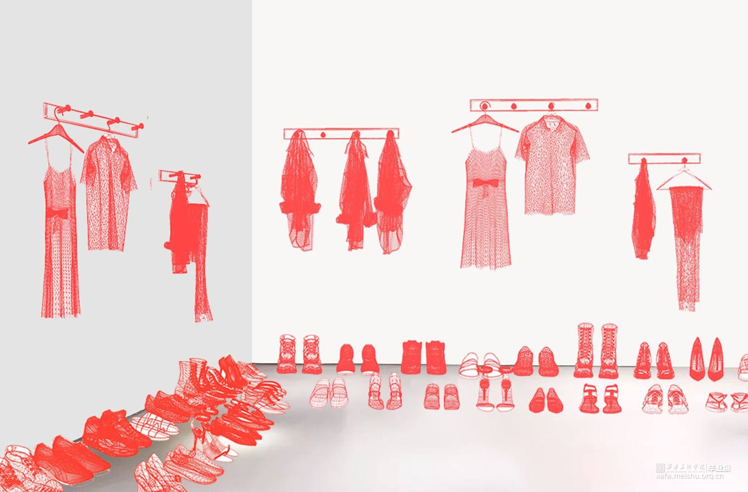 毕业创作的灵感来源于韩国艺术家徐道获的作品,他用色彩鲜艳,通透的纤维材料将自己的曾经居住的家创作成实体纤维装置,以此来探索不同空间的定义。因此,我借鉴了艺术家选用辨识度比较高的透明红色。通过材料结合服装鞋子等用品作为创作方式,选用透明红的3D打印材料加之网格肌理来表现作品的细腻质感,这种质感是夏天的、是廉价的、是随意的。