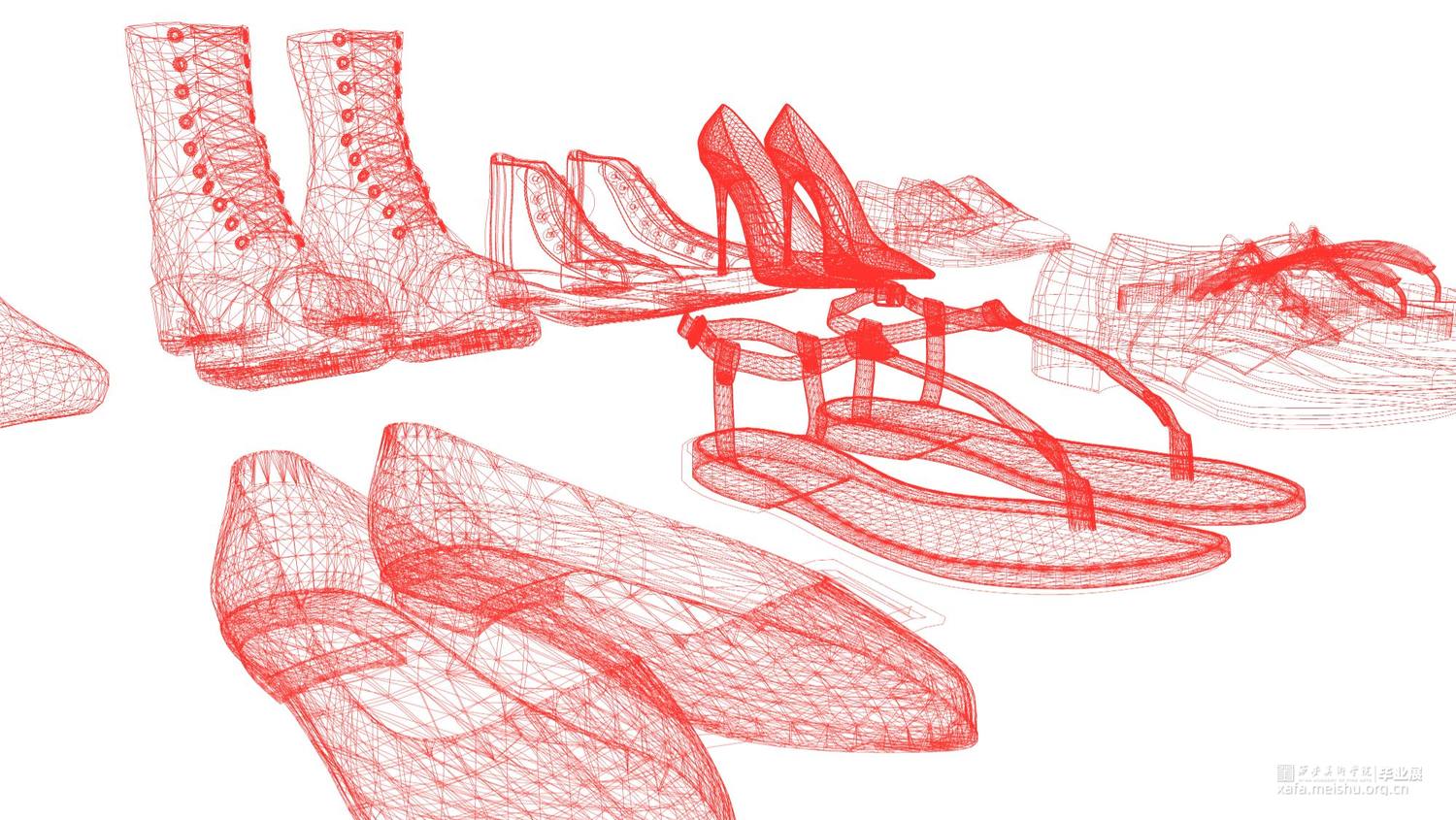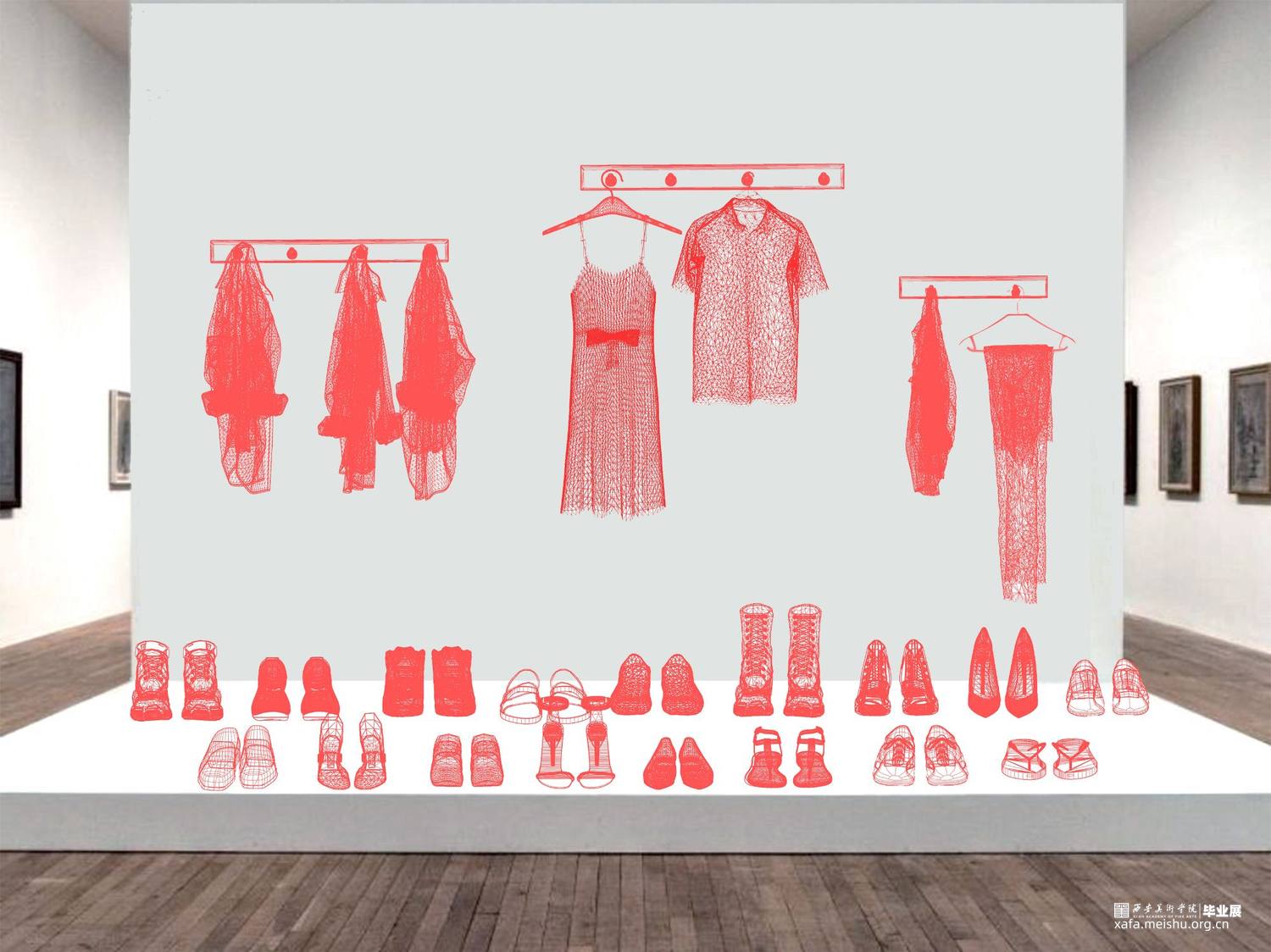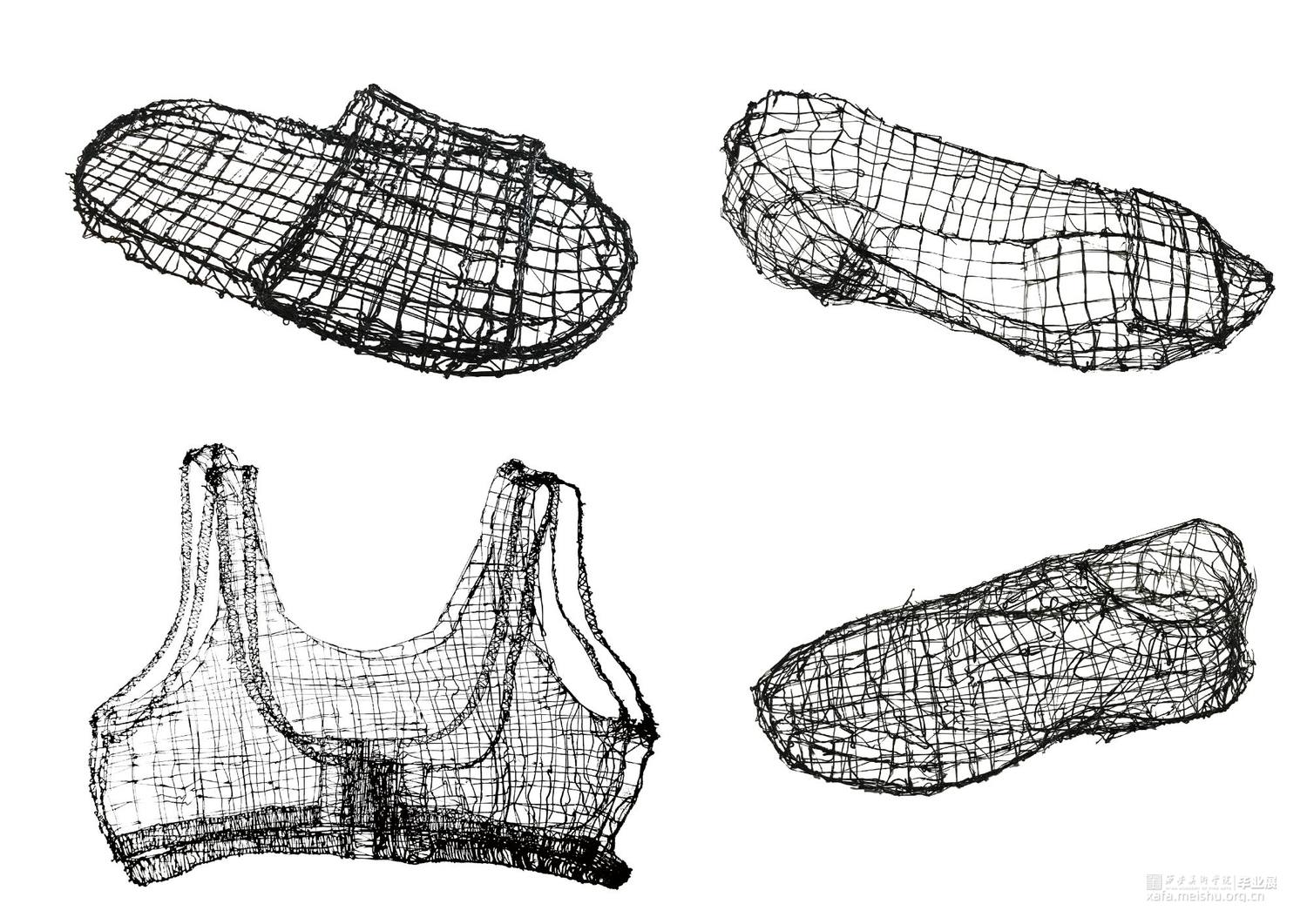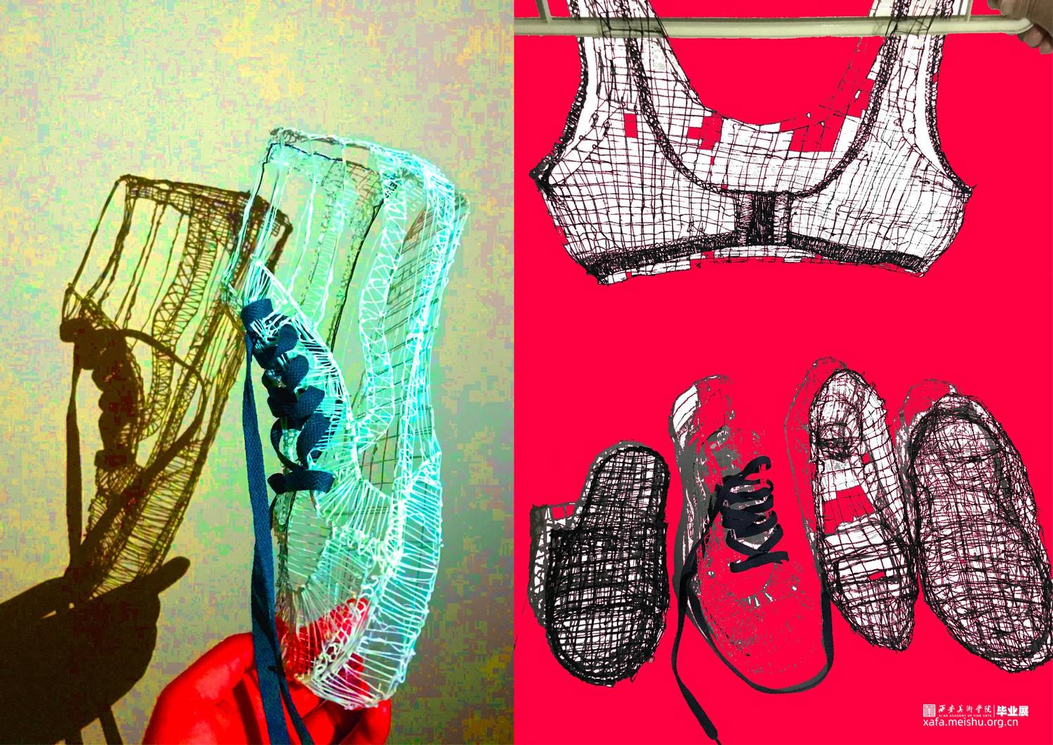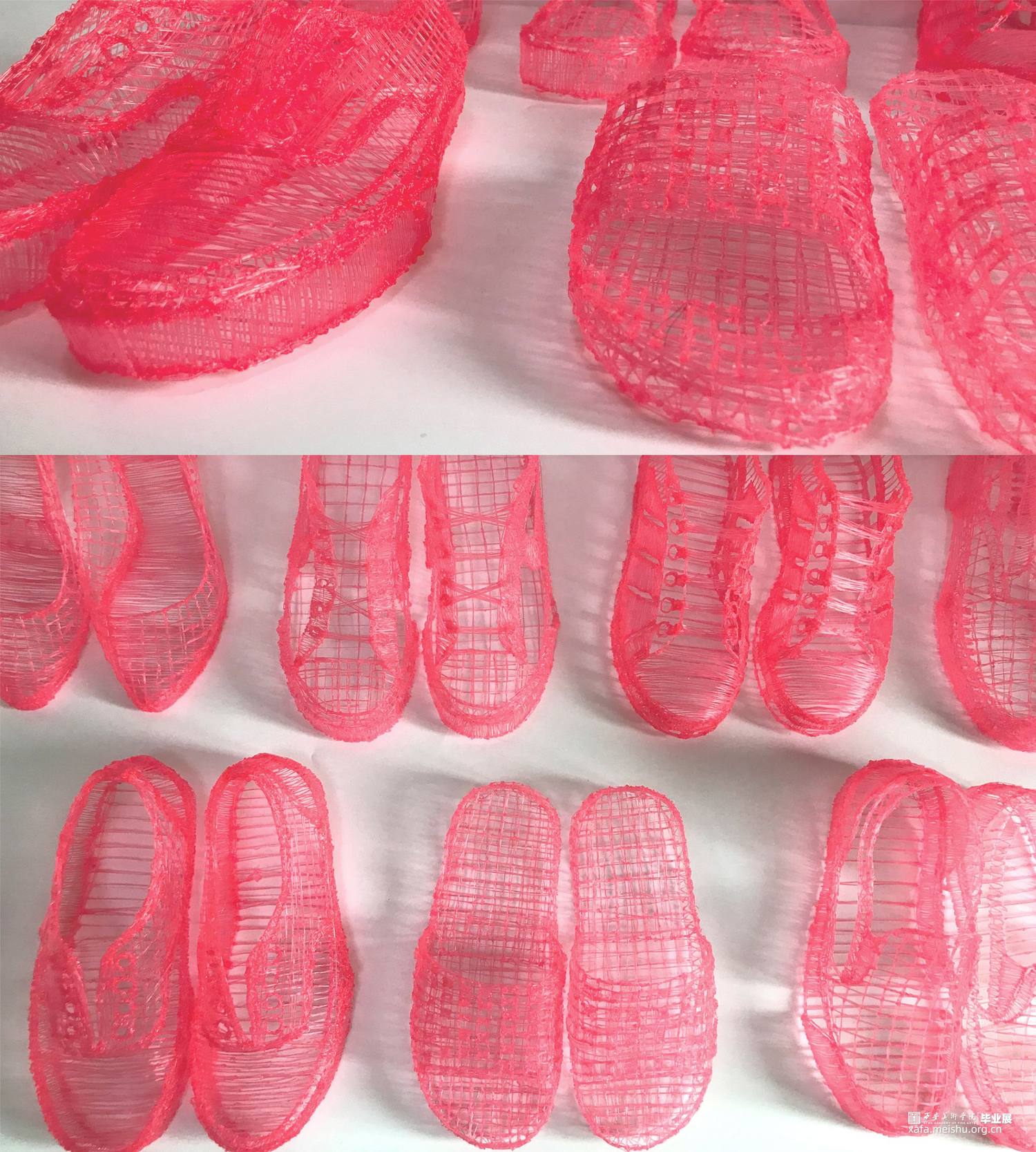 毕业创作的灵感来源于韩国艺术家徐道获的作品,他用色彩鲜艳,通透的纤维材料将自己的曾经居住的家创作成实体纤维装置,以此来探索不同空间的定义。因此,我借鉴了艺术家选用辨识度比较高的透明红色。通过材料结合服装鞋子等用品作为创作方式,选用透明红的3D打印材料加之网格肌理来表现作品的细腻质感,这种质感是夏天的、是廉价的、是随意的。