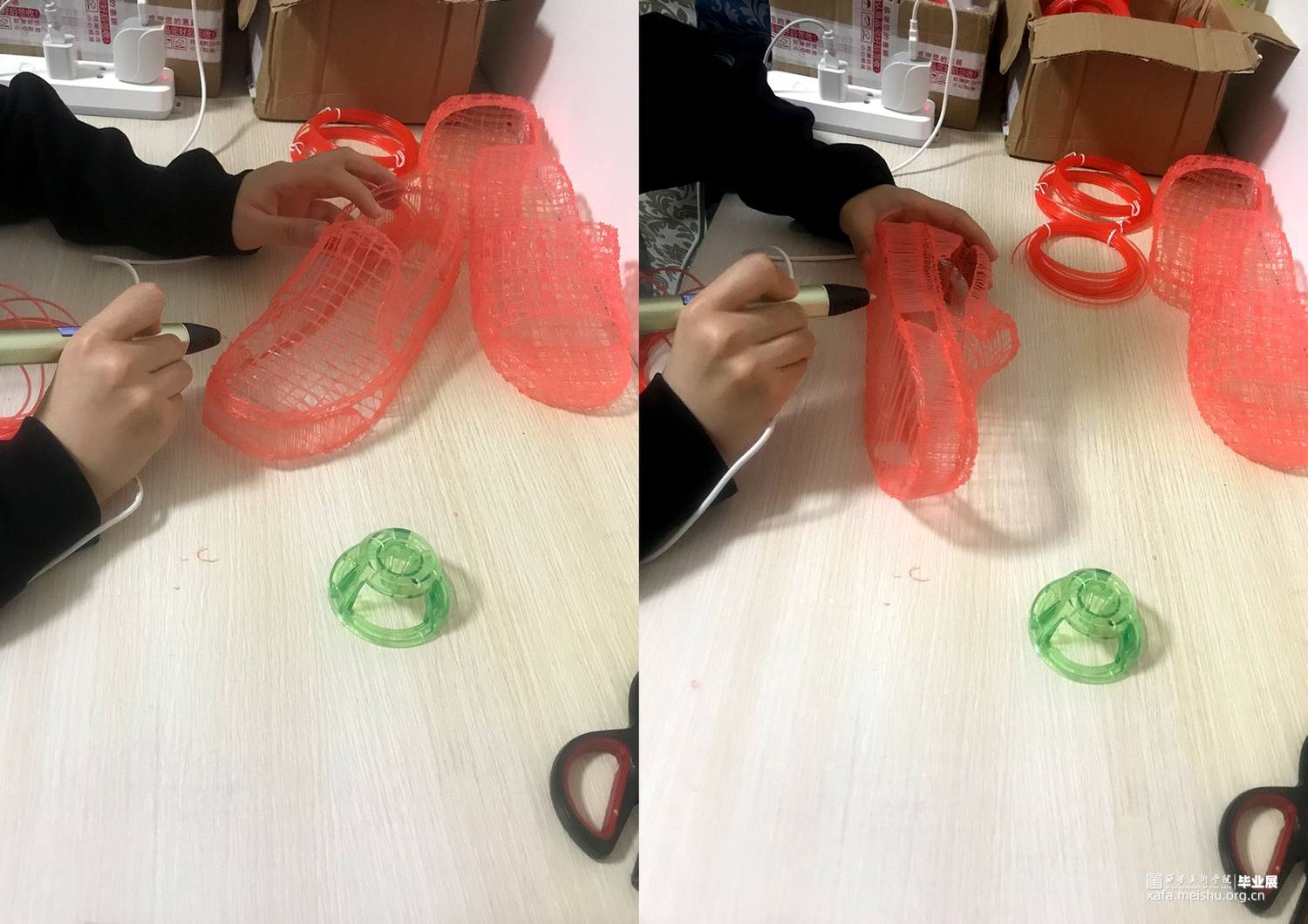 草图绘制完成进入到材料试验。我认为这一步是必不可少的一个阶段。试验阶段前期对于3D打印笔的使用以及材料属性不太了解,出现了很多小问题,比如绘制出的模型网格图案不紧凑、绘制当中笔出料的速度和手上的速度很难结合在一起等。于是跟老师沟通先做了几件小模型来练习。经过一段时间的练习,慢慢有了对材料的把控,3D打印笔使用也变得熟练起来。