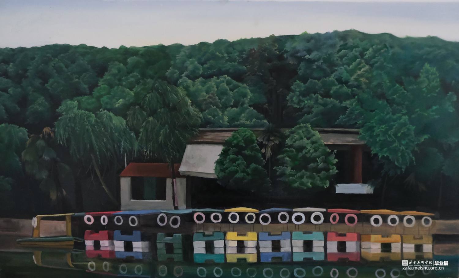 在这个生活节奏飞快的时代里,每个人在生活上多多少少会有一些厌倦,向往一片可以宁静的净土。在那里可以放下追求的脚步放空自己,就像是儿时的乐园回归于本源的快乐。我的这副作品表达的主题就是这个。一个人们心中的乐园,它看起来十分幽静神秘又令人向往。就像是一个梦一样,虚幻而飘渺。年轻人的生活越来越焦虑,因为年轻并没有什么生活经验进而对自身的生活处境感到无能为力;无法内心平静的去适应和面对,也不知怎样去破解未来自己要走的路,越来越多的现实问题也让我们没法像小时候那么充满理想,变得慢慢开始接收现实但又不想放弃。我们每天接收着无数条碎片化的信息,看似每天都在不断学习进步成长,好像懂得了很多道理,实际上我们变得越来越焦虑,思维越来越紊乱,我们不知道哪个是真哪个是假,都好像美景