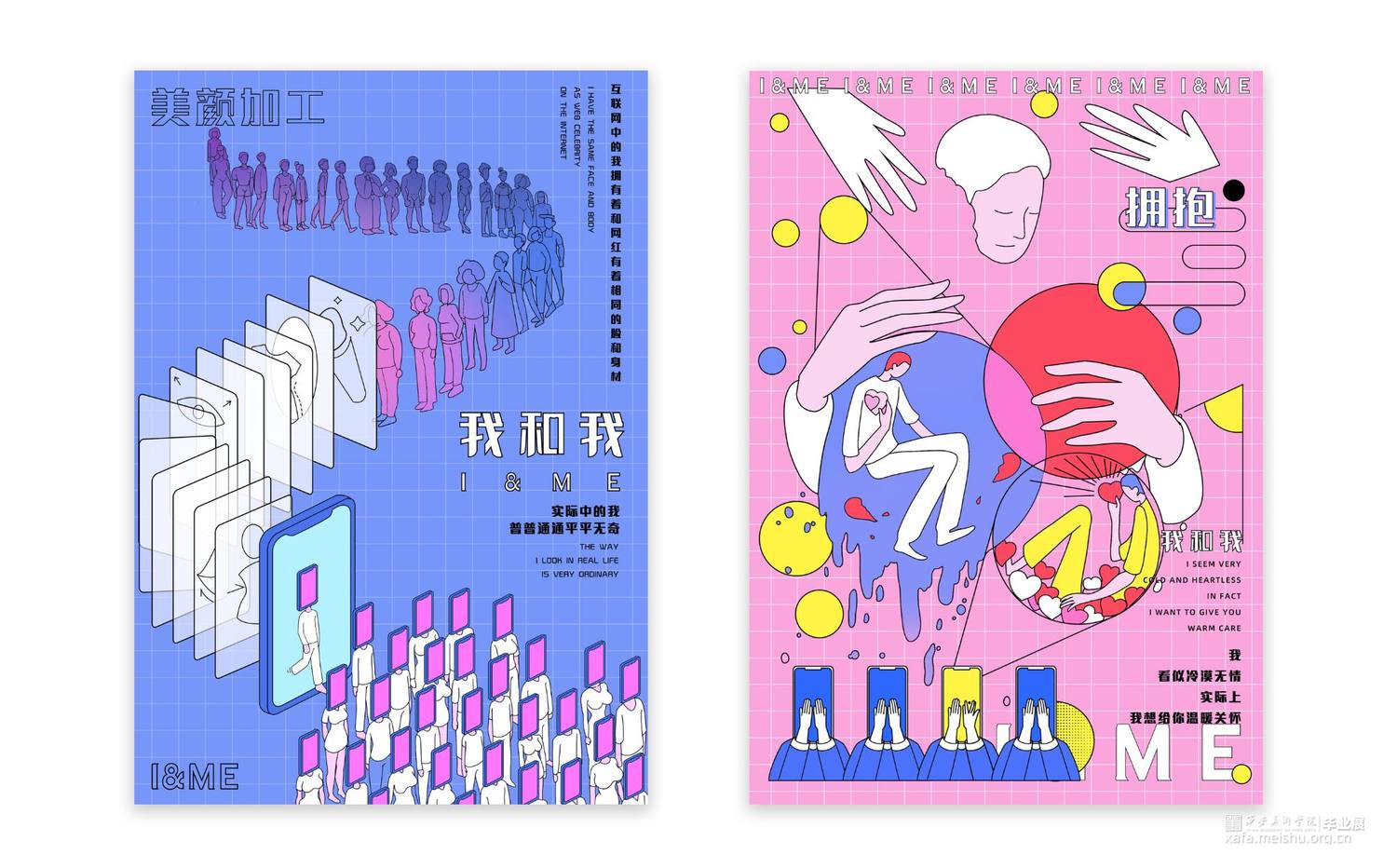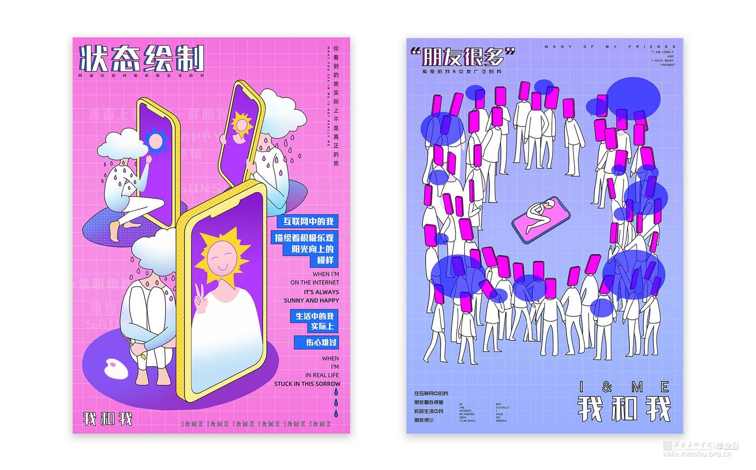 信息时代,伴随着自媒体喷发式发展,当代人群中慢慢演变出这样的人——既互联网上表我和实际的真我截然不同,设想按照这样的趋势发展下去,人们会越来越熟练的掌握在互联网中聊天的感觉和状态,而实际生活中面对人们乃至陌生人时候,会不会越来越难以把控自己的表达?所以创作以“我”为出发点,根据这一生活现象特征进行分类,分别制作六张海报和虚拟人物形象设计。海报运用了较为扁平简约的表现手法,人物形象设计使用立体和平面相结合,旨在表现在“互联网状态的我和实际生活中的我的距大差异”,提醒人们在互联网带给我们的便利时,也不要忘记