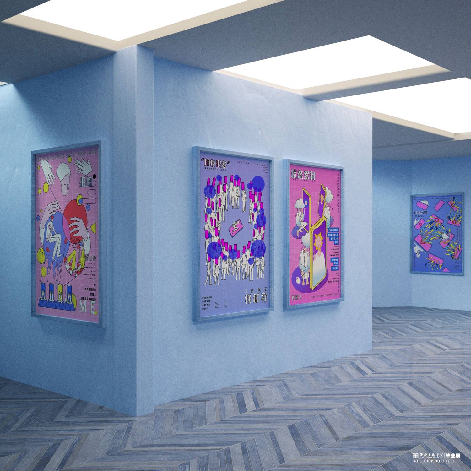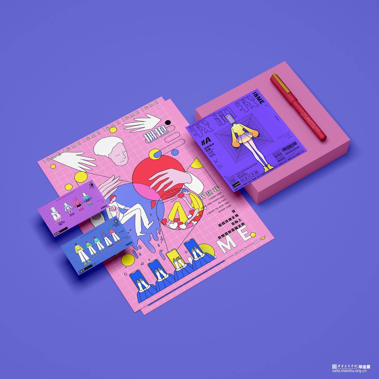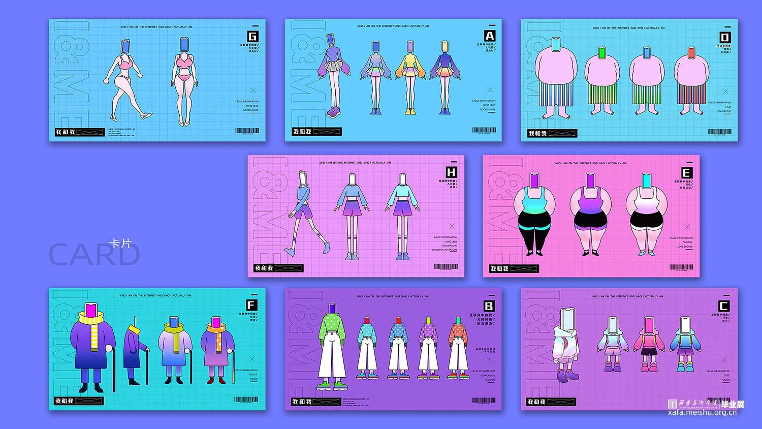 信息时代,伴随着自媒体喷发式发展,当代人群中慢慢演变出这样的人——既互联网上表我和实际的真我截然不同,设想按照这样的趋势发展下去,人们会越来越熟练的掌握在互联网中聊天的感觉和状态,而实际生活中面对人们乃至陌生人时候,会不会越来越难以把控自己的表达?所以创作以“我”为出发点,根据这一生活现象特征进行分类,分别制作六张海报和虚拟人物形象设计。海报运用了较为扁平简约的表现手法,人物形象设计使用立体和平面相结合,旨在表现在“互联网状态的我和实际生活中的我的距大差异”,提醒人们在互联网带给我们的便利时,也不要忘记重视现实生活和社交关系上自我的塑造。