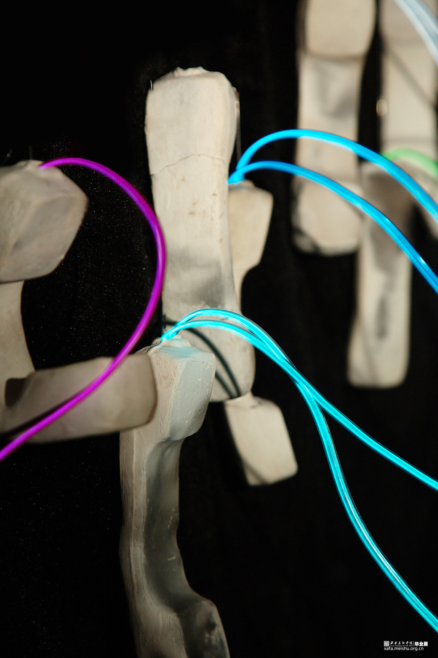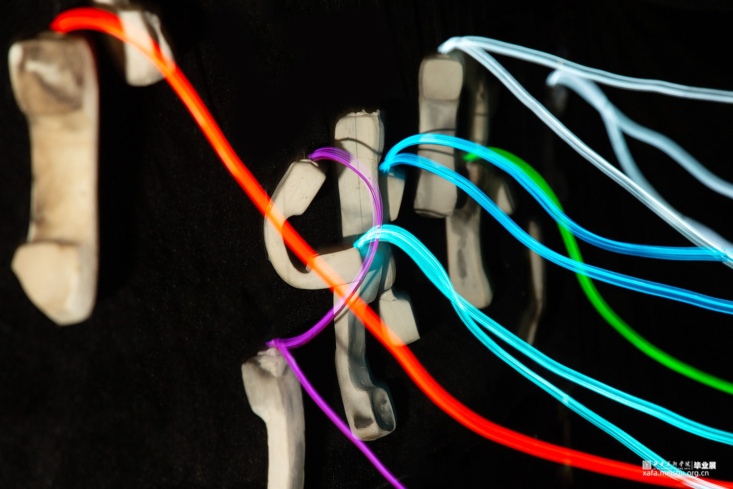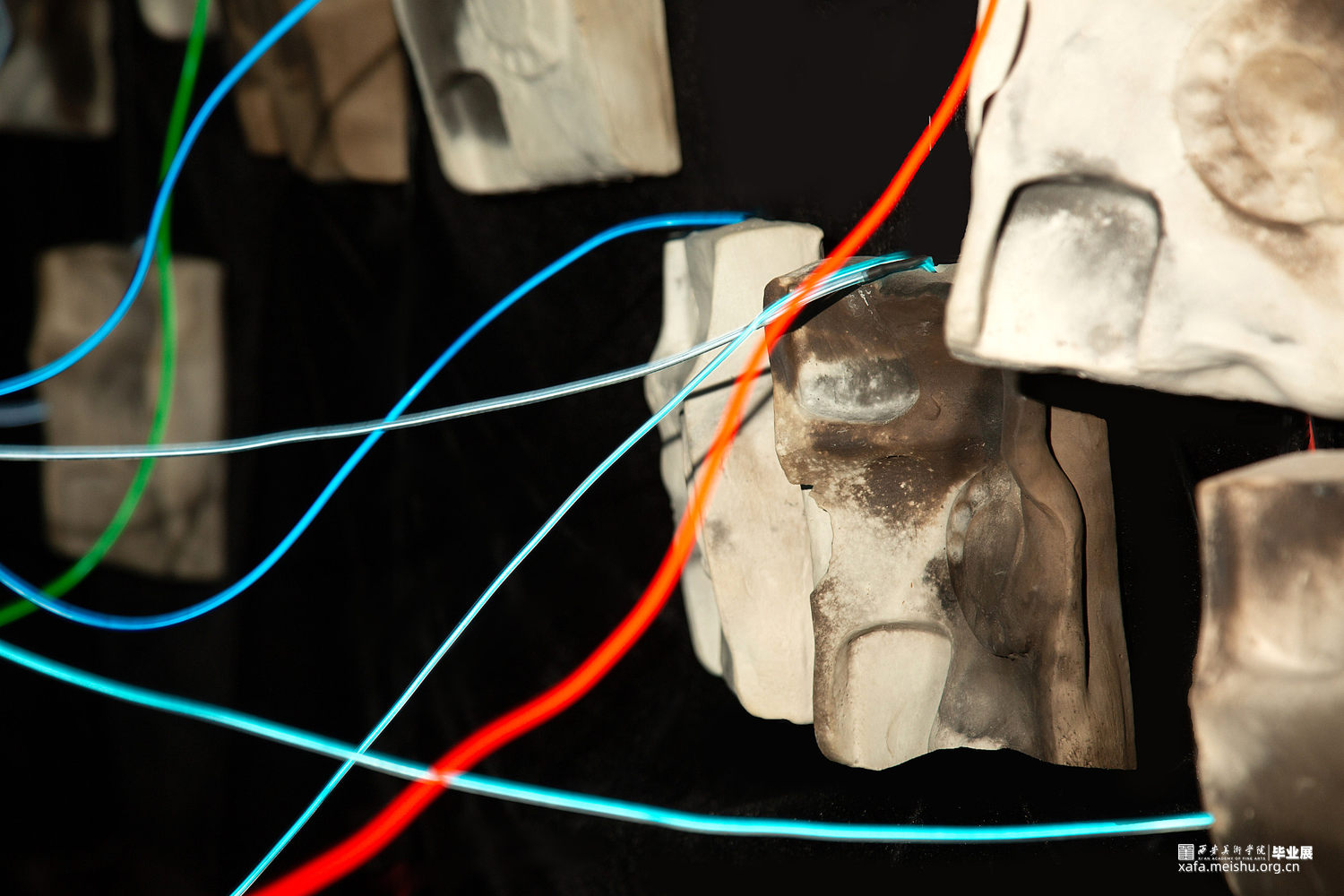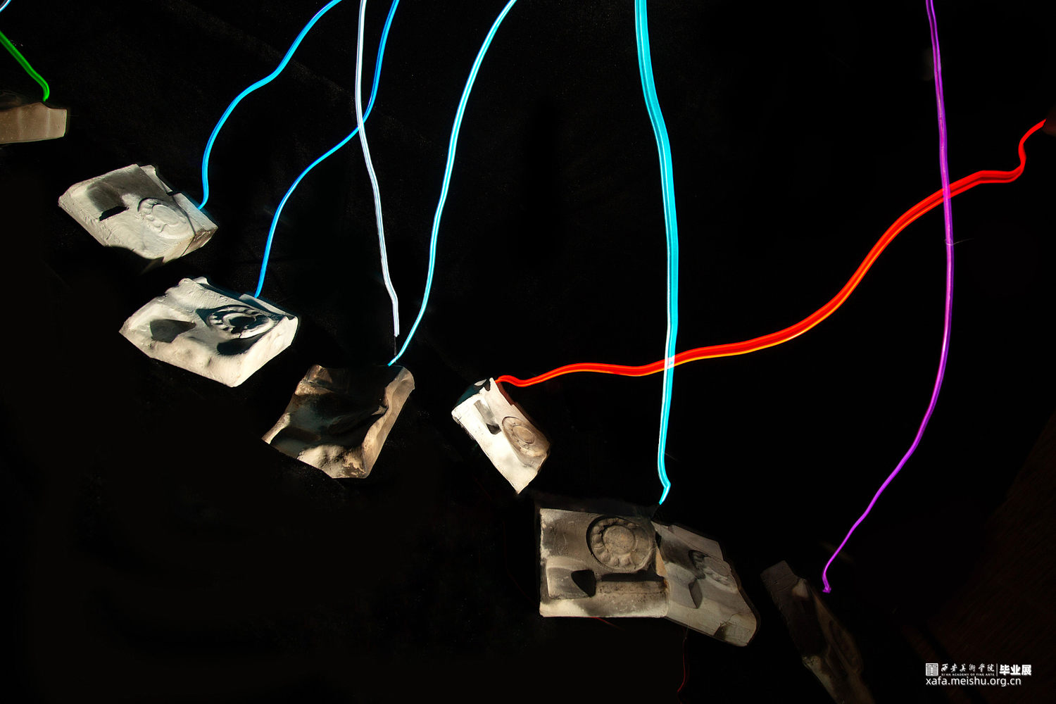 作品主体使用陶瓷材料,呈现观念的媒介是面对面挂壁静置,听筒连结交错的老式电话。在沉默对立的场景中,发光灯线与听筒的缠连杂乱而失序。作品所传递的观念与思考是,人与人之间的沟通与交流在现今的社会越发陌生与疏离,社交通讯科技的革新使得一切的情感交互都过于迅速的诞生及消弭。在这样的大趋势中,共情与相互理解成为社交中过于漫长乏味的环节,人们内化的交流往往是错位而徒劳的不得其解。