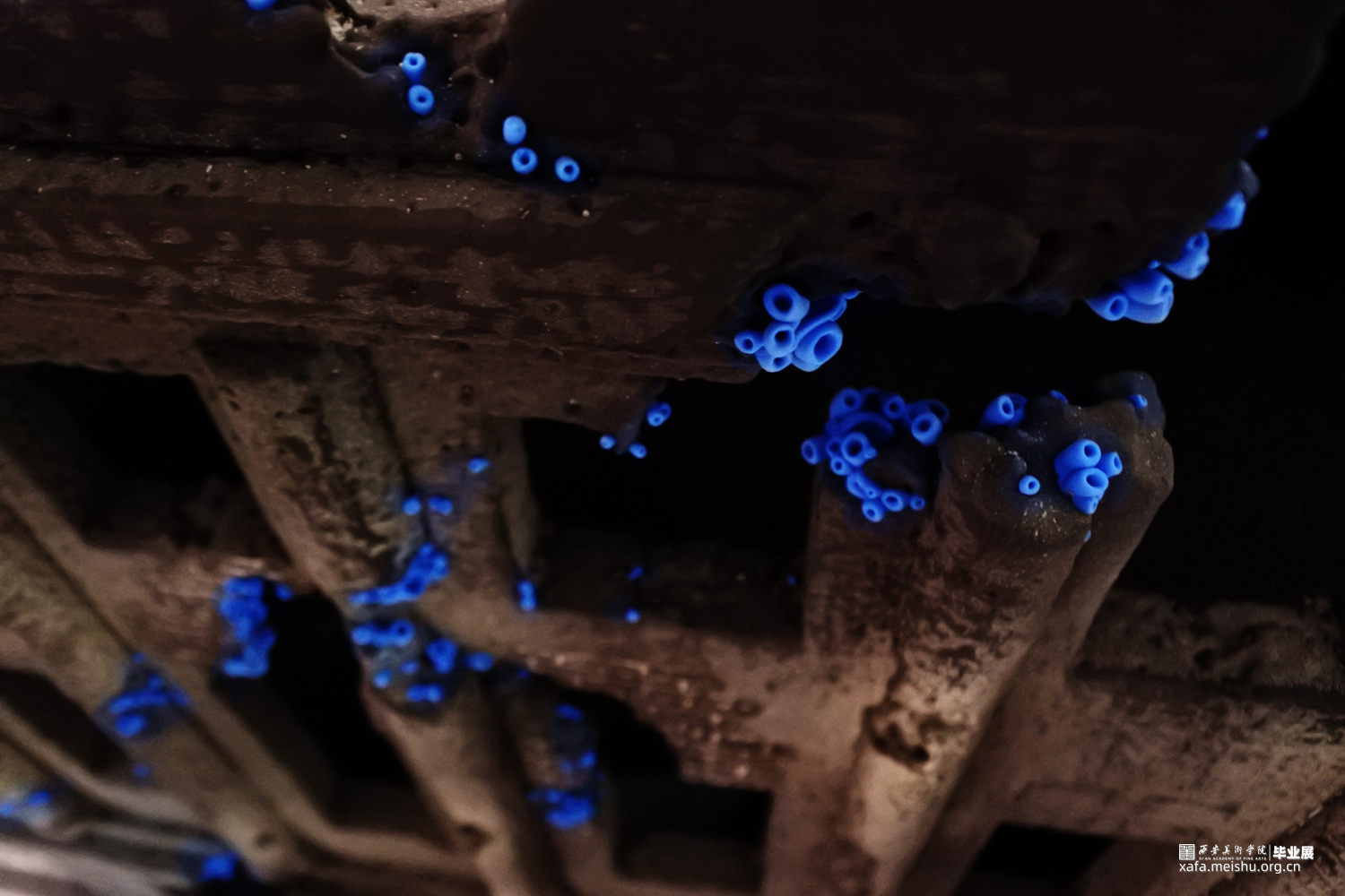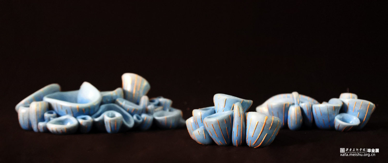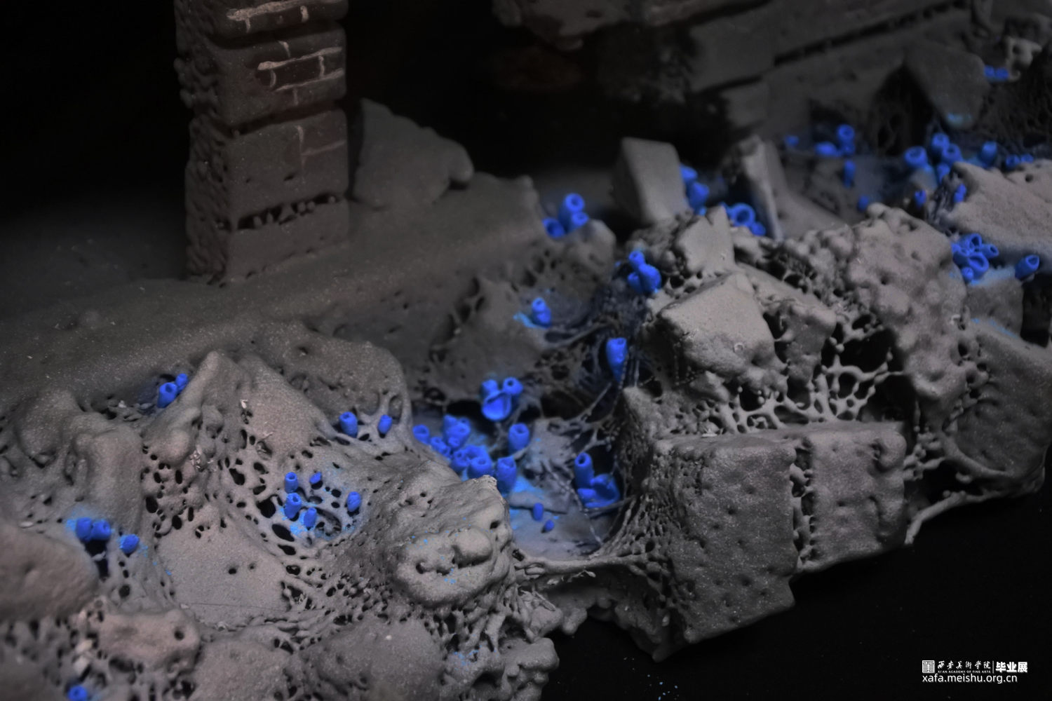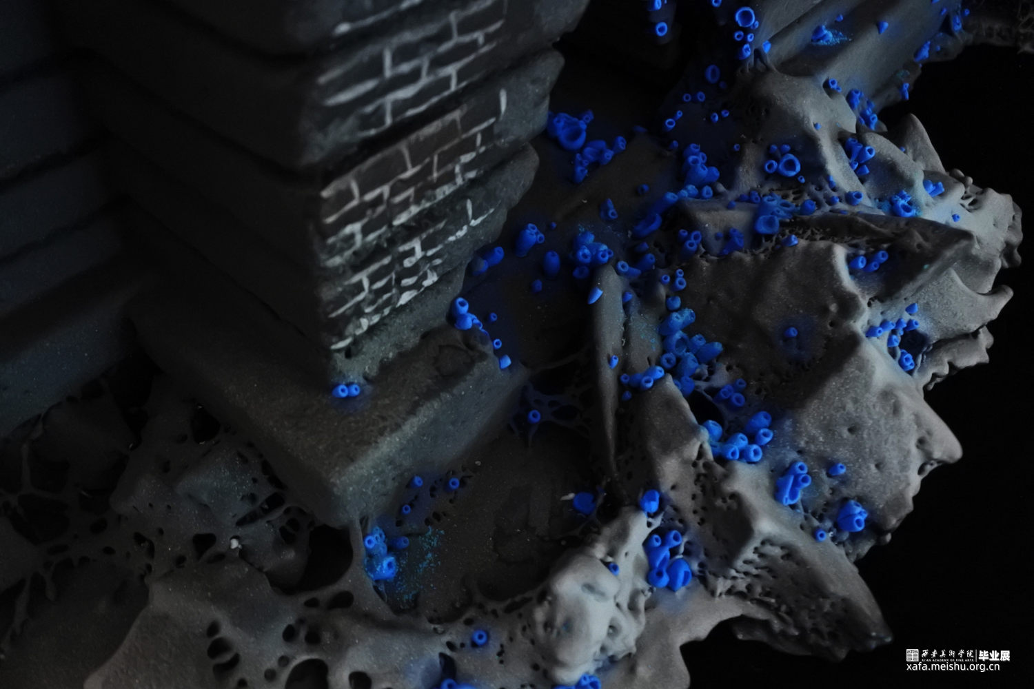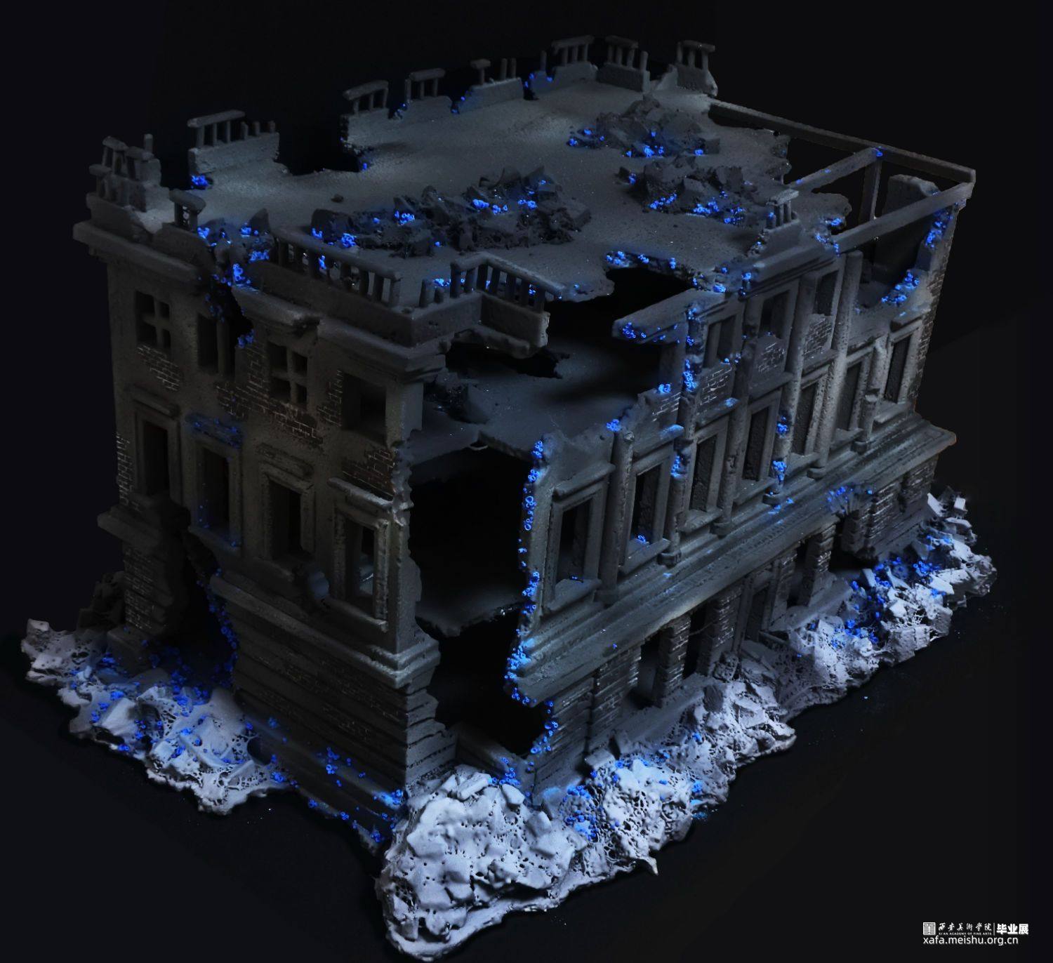 随着基础科学进步的停滞,和人类需求的不断增加,越来越多“隐形”的问题逐渐形成。这些问题看起来很渺小,似乎与我们无关也很好解决,不会对我们的生活产生太大的影响。但如果真不注意这些“小问题”,将会引发我们难以承受的灾难。随着科技的进步、生活水平的提高,人类对自然的敬畏之心却逐渐减少,认为我们好像有控制一切的能力,但至少在现在我们并不能控制一切。作品由一群冰蓝色的菌状物组成,这些菌状物如同苔藓生长在建筑的阴影之中。建筑作为人类对抗自然的屏障代表社会的和谐稳定,其上的菌状物代表各种隐患,不起眼却会逐渐蚕食建筑直至建筑崩塌。