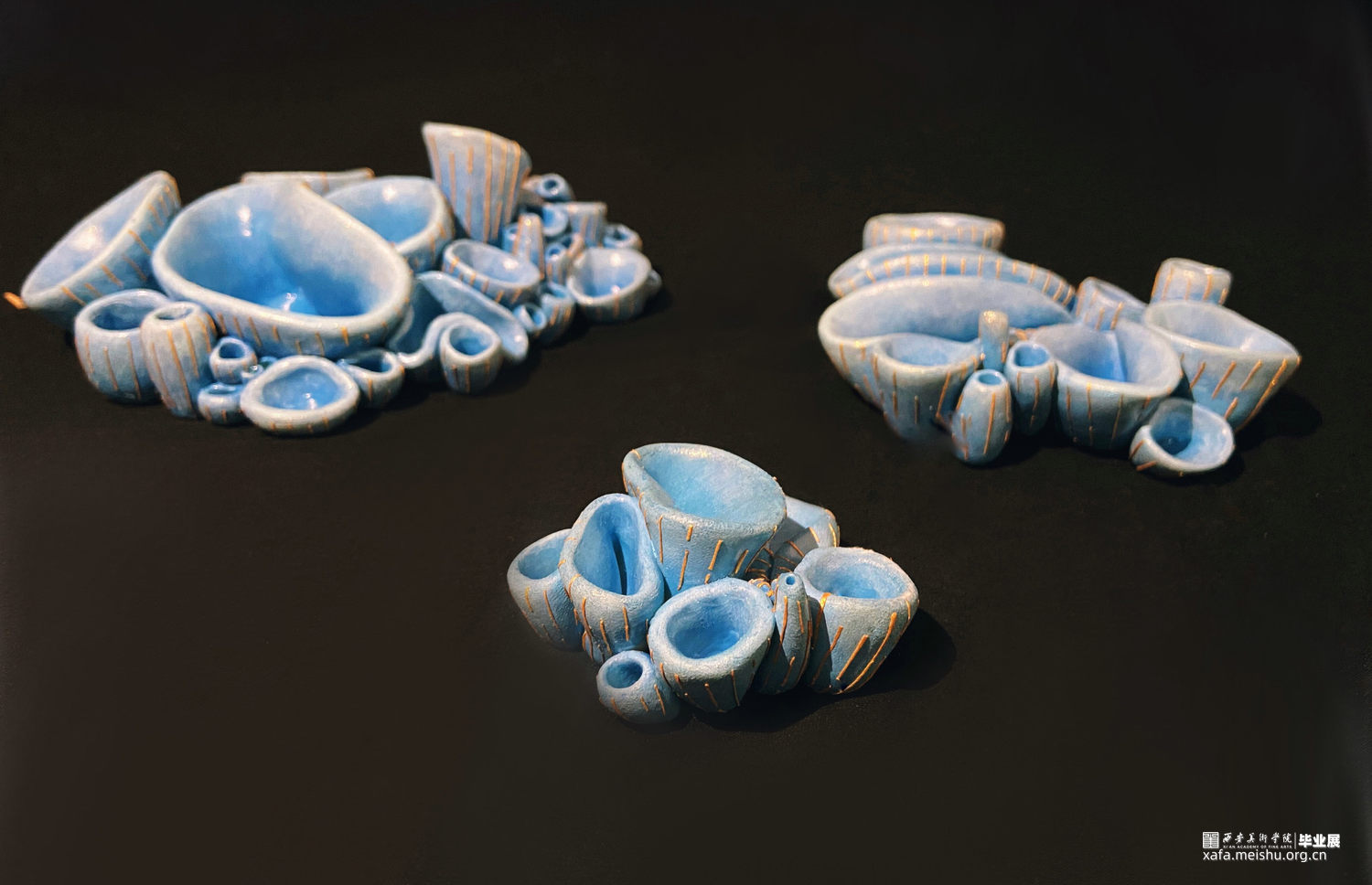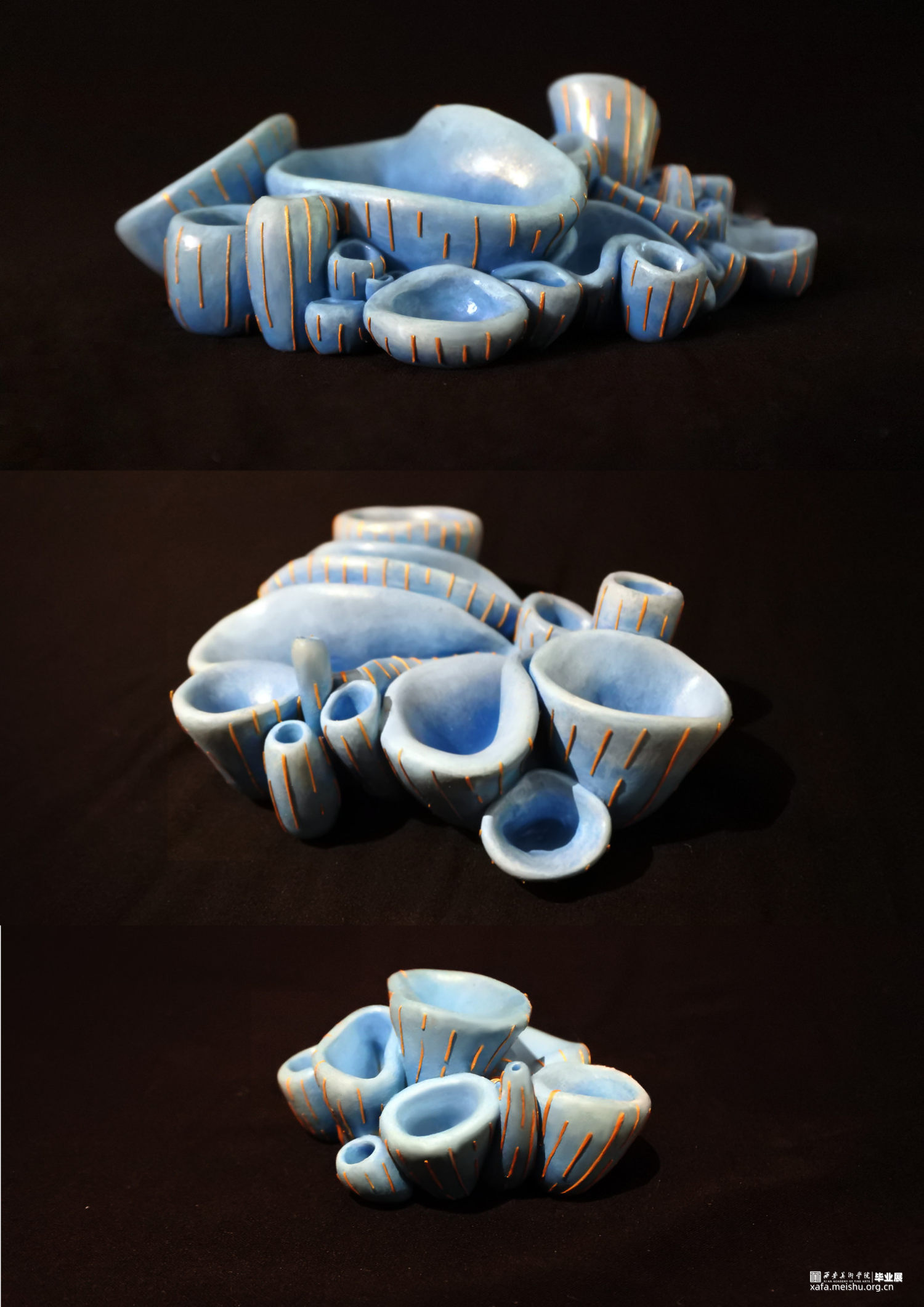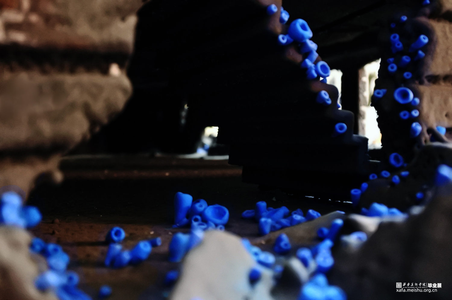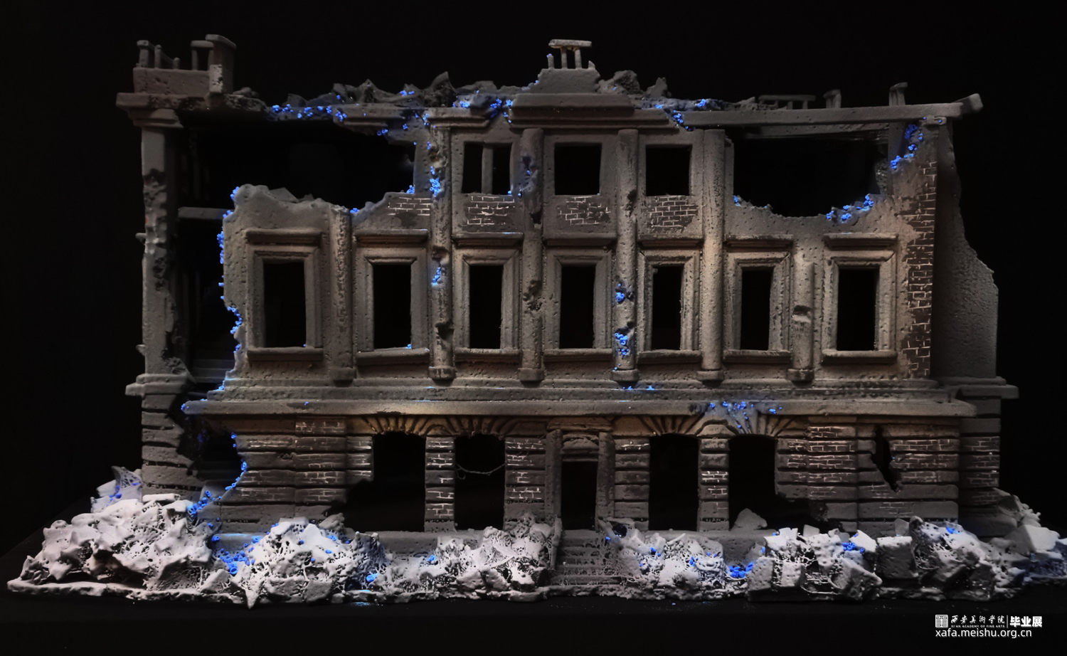 随着基础科学进步的停滞,和人类需求的不断增加,越来越多“隐形”的问题逐渐形成。这些问题看起来很渺小,似乎与我们无关也很好解决,不会对我们的生活产生太大的影响。但如果真不注意这些“小问题”,将会引发我们难以承受的灾难。随着科技的进步、生活水平的提高,人类对自然的敬畏之心却逐渐减少,认为我们好像有控制一切的能力,但至少在现在我们并不能控制一切。作品由一群冰蓝色的菌状物组成,这些菌状物如同苔藓生长在建筑的阴影之中。建筑作为人类对抗自然的屏障代表社会的和谐稳定,其上的菌状物代表各种隐患,不起眼却会逐渐蚕食建筑直至建筑崩塌。