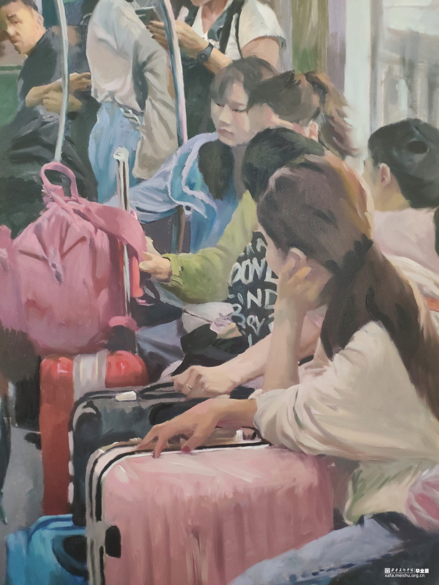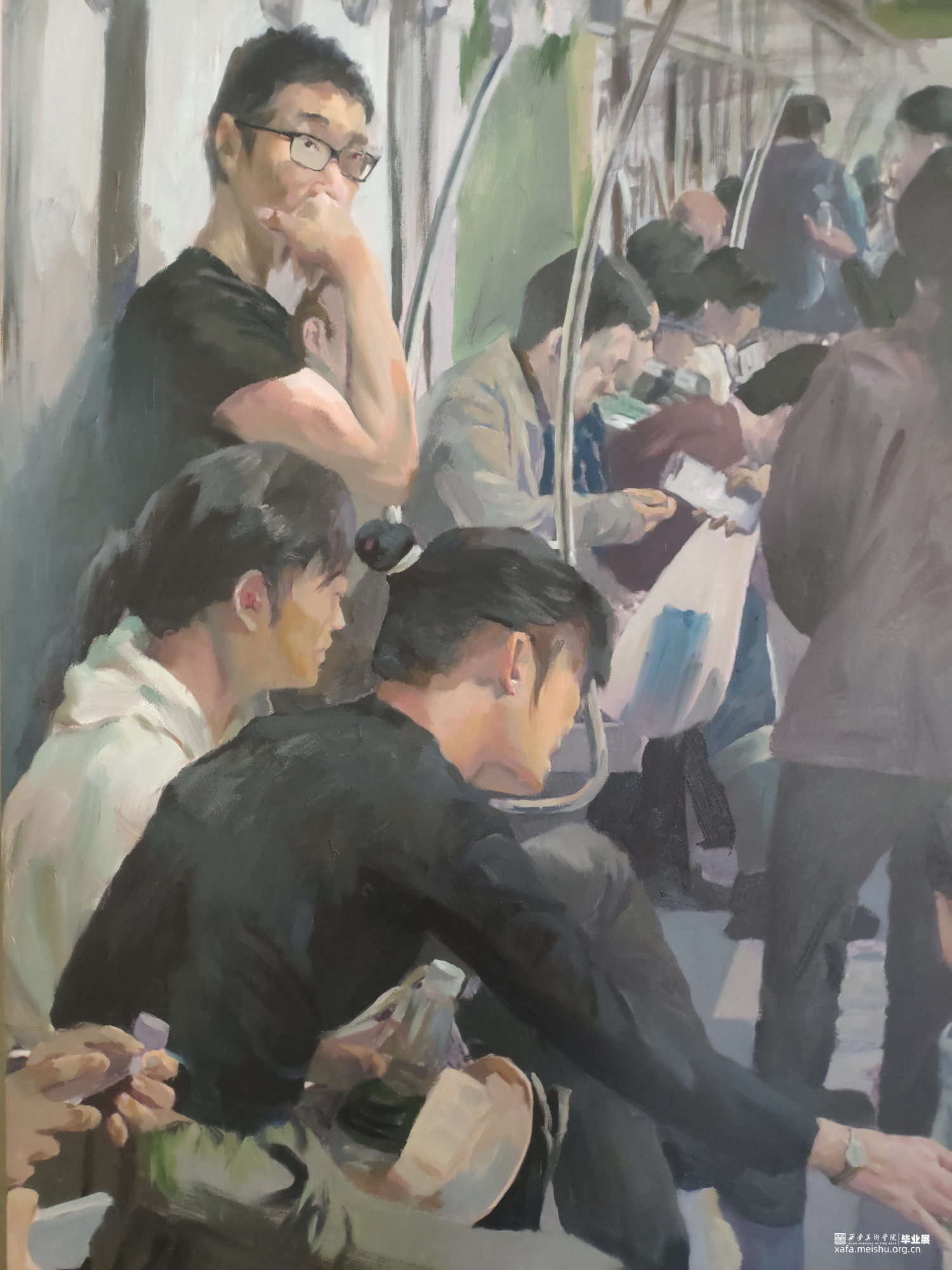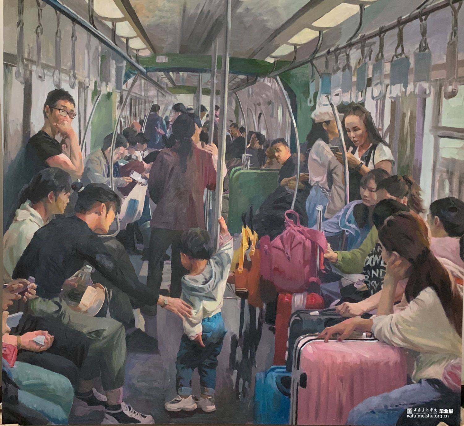 地铁,我相信大多数人都不陌生,平凡的地铁带给了我们太多的方便,这张作品取材与平时的生活场景,充满生活气息,人物背景都是我们再熟悉不过了。这张画从构思到完成历时半年,从去年十月份去重庆考察,对他们的轨道交通印象深刻,回到学校后就着手准备创作一个地铁系列的的作品了,在老师的指导下四处搜集素材,研究构图,基本在学校完成的草稿,构图,色稿,本来想着在学校能画完的,突如其来的疫情打乱了我的计划,通过老师远程指导,还是在家完成了这幅作品。