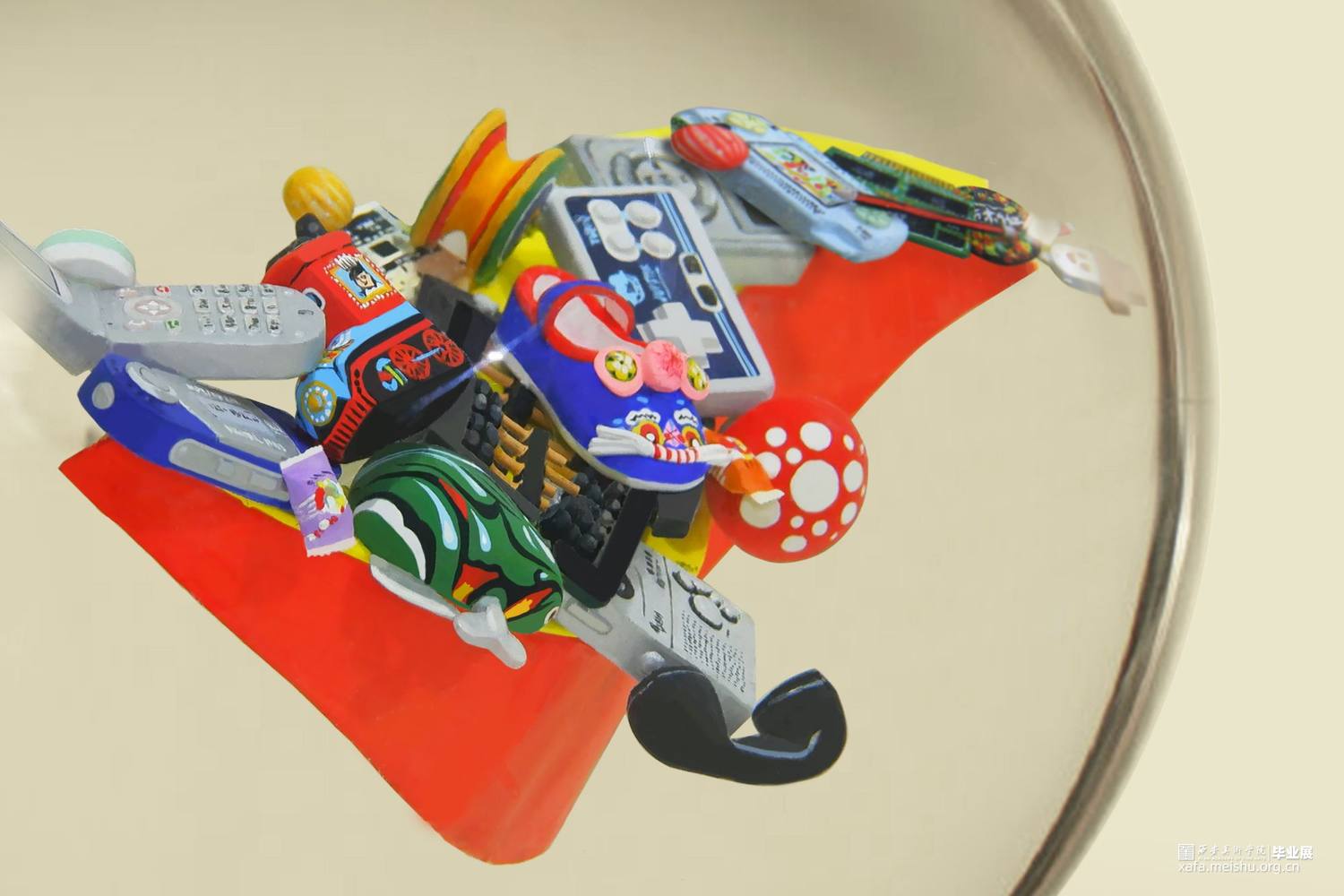 童年在时光荏苒间逐渐模糊,但总有一些记忆因为一件物品、一个人、一种味道而在脑海中愈加清晰。该作品以“童年”为主题,回忆那些忘不掉的玩具、零食所承载的儿时的过往,将它们封存在玻璃弹珠中,将童年的那份美好永远留存在作者的心中。