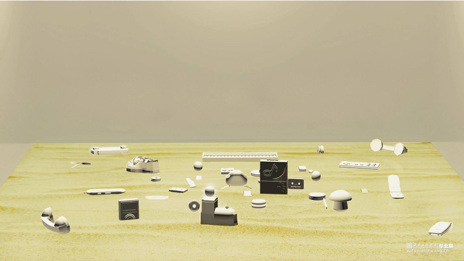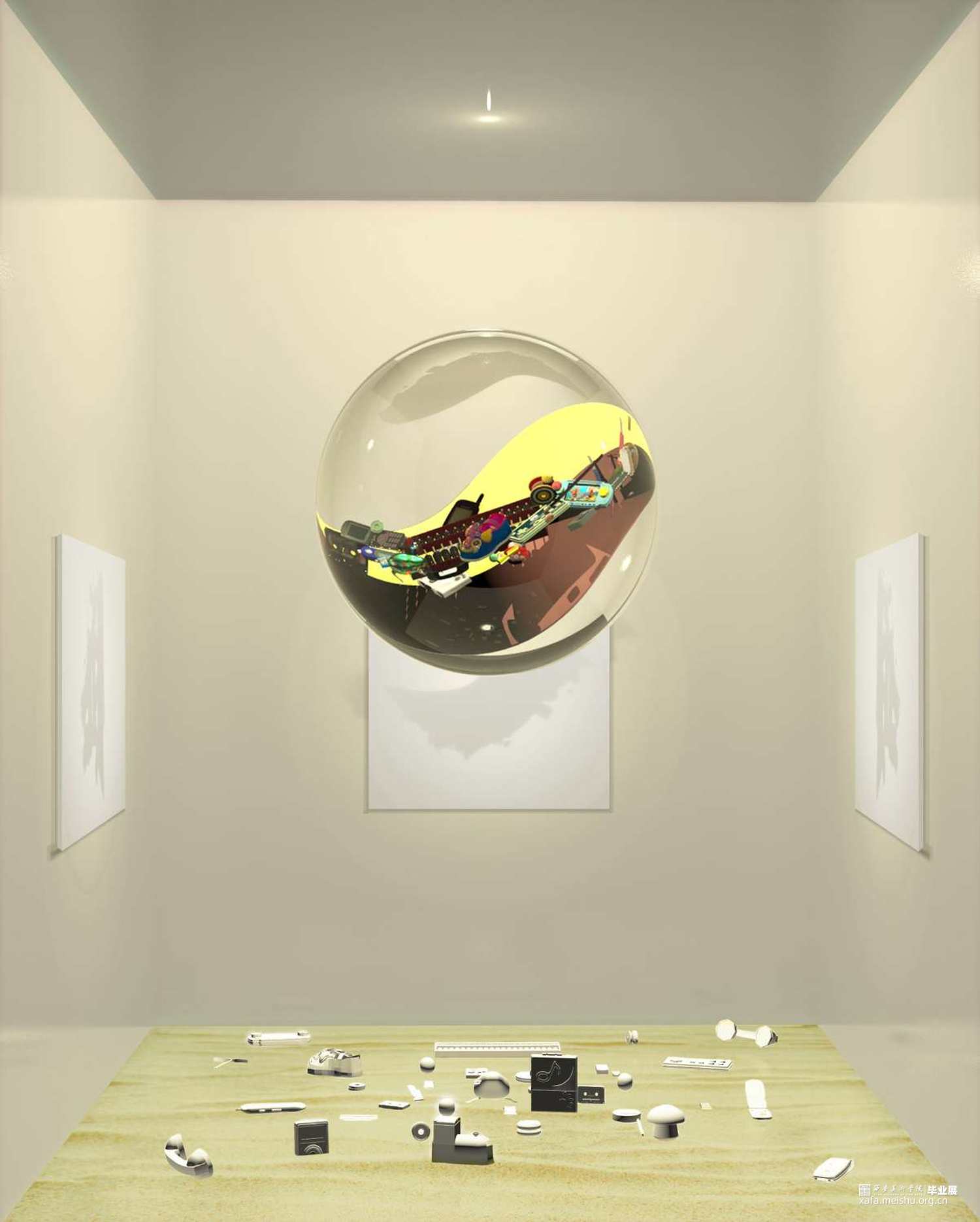 作品运用陶瓷艺术与玻璃艺术这两种介质,巨大的玻璃弹珠从视觉上呈现出一种冲击感,物品寄托着情感,运用玻璃弹珠的形式将儿时的物品嵌入其中,体现过往的情感和是故事的集合。借助玻璃的透光性,将弹珠中的“物品”影子投射在空白画布上,黑灰色的影子体现了时间的流逝与记忆的缺失。地面上褪色的物品埋藏于沙子中,象征着那些已经丢失的记忆。每件物品能被记起都会有它存在的意义,它承载着作者的情绪、过往和成长。整件作品中表达了作者对童年无忧无虑的生活和时光的向往,希望记忆中最美好的部分希望永远停留在那一刻,完好如初。在现如今的生活环境中,简单的快乐成为了一种“奢侈”,愿儿时的纯真与美好能一直埋藏于心底,再回忆时能重回那一刻。