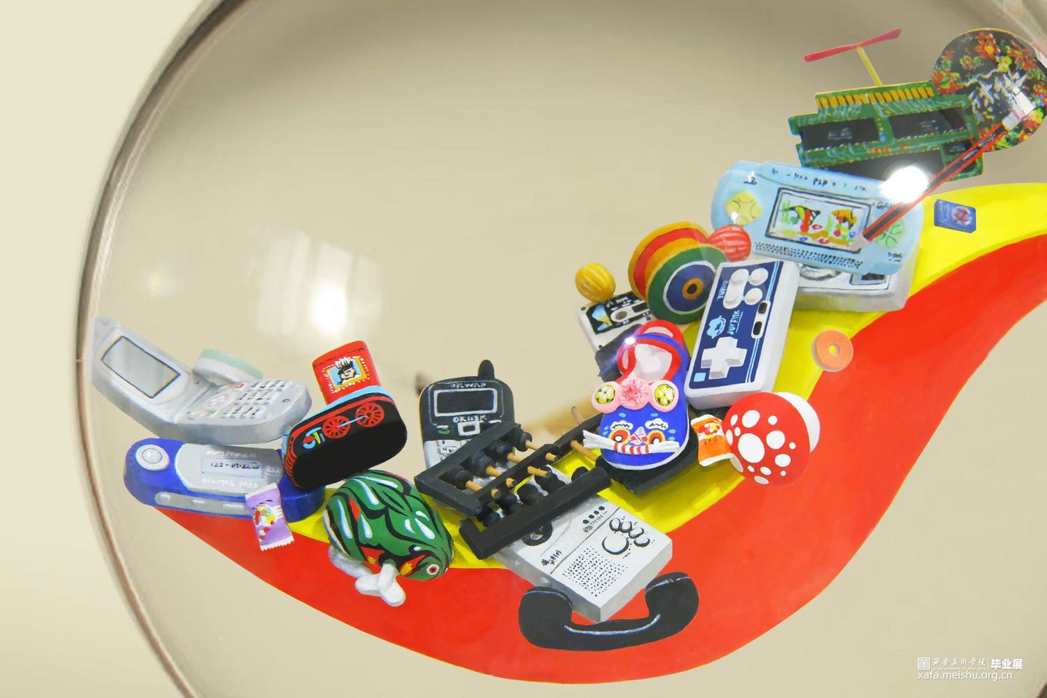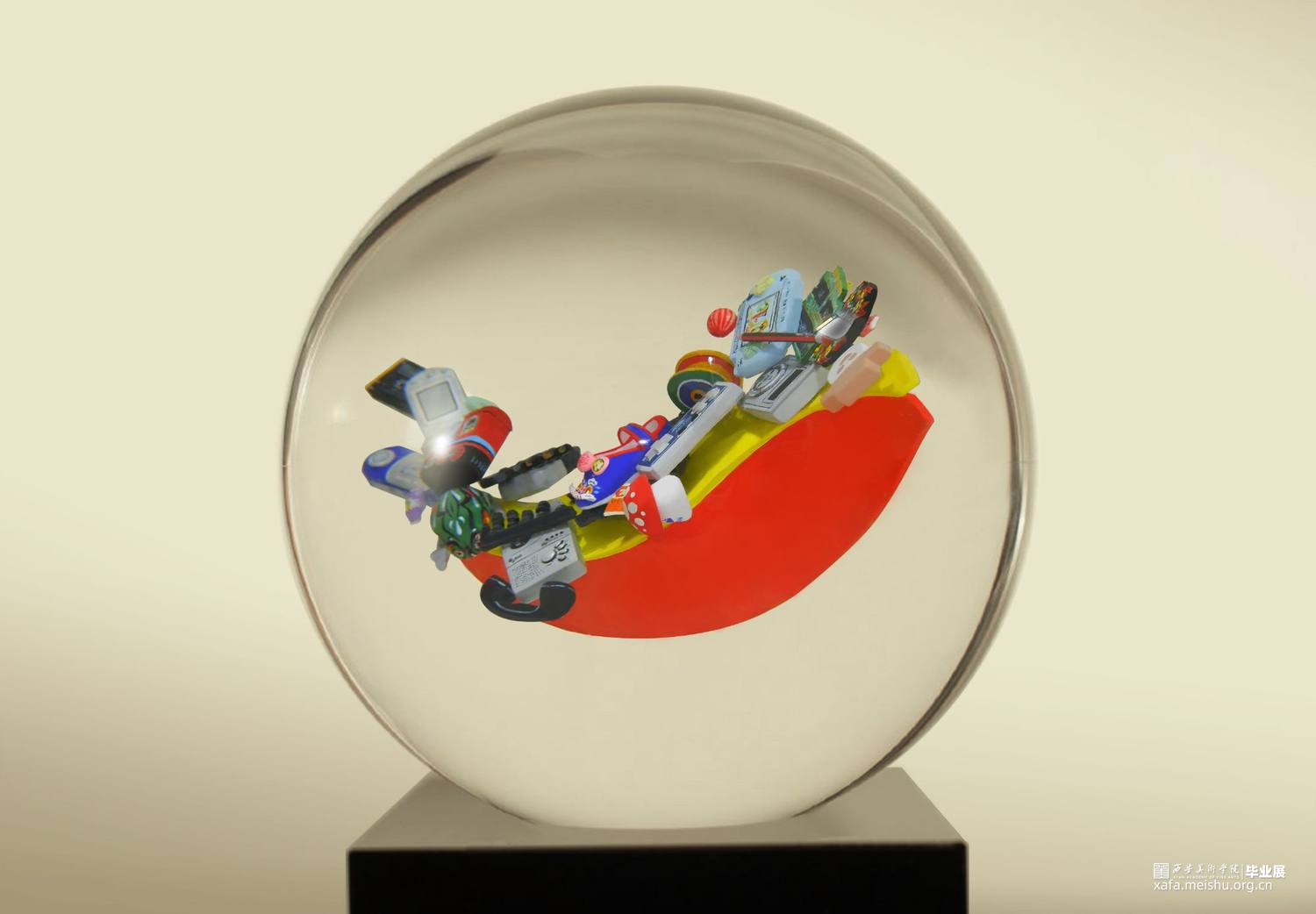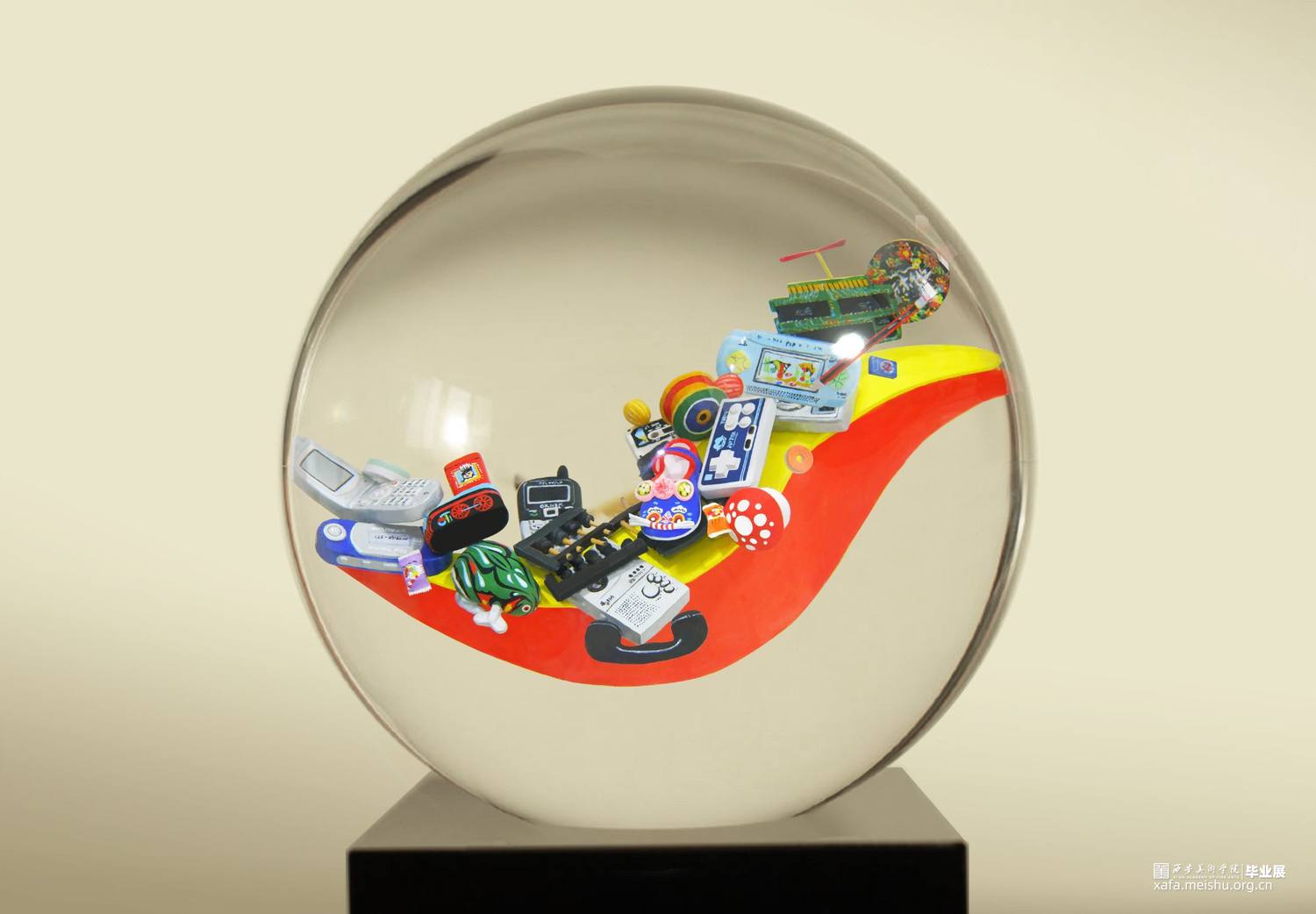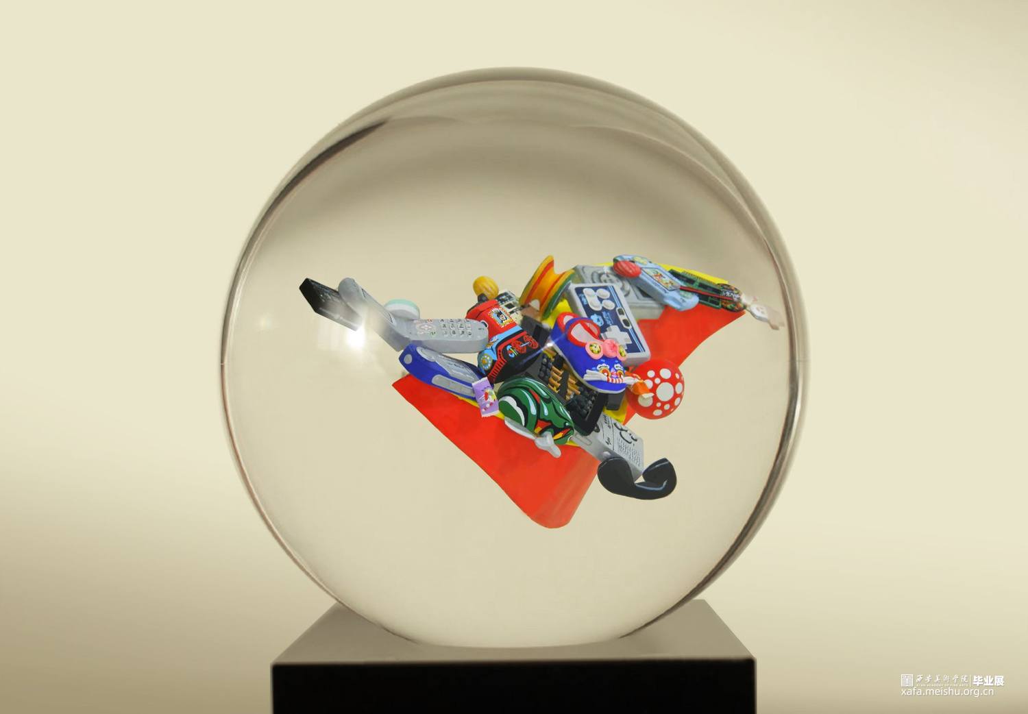 该作品以“童年”为主题,运用陶瓷艺术与玻璃艺术这两种介质,巨大的玻璃弹珠从视觉上呈现出一种冲击感,物品寄托着情感,运用玻璃弹珠的形式将儿时的物品嵌入其中,体现过往的情感和是故事的集合。