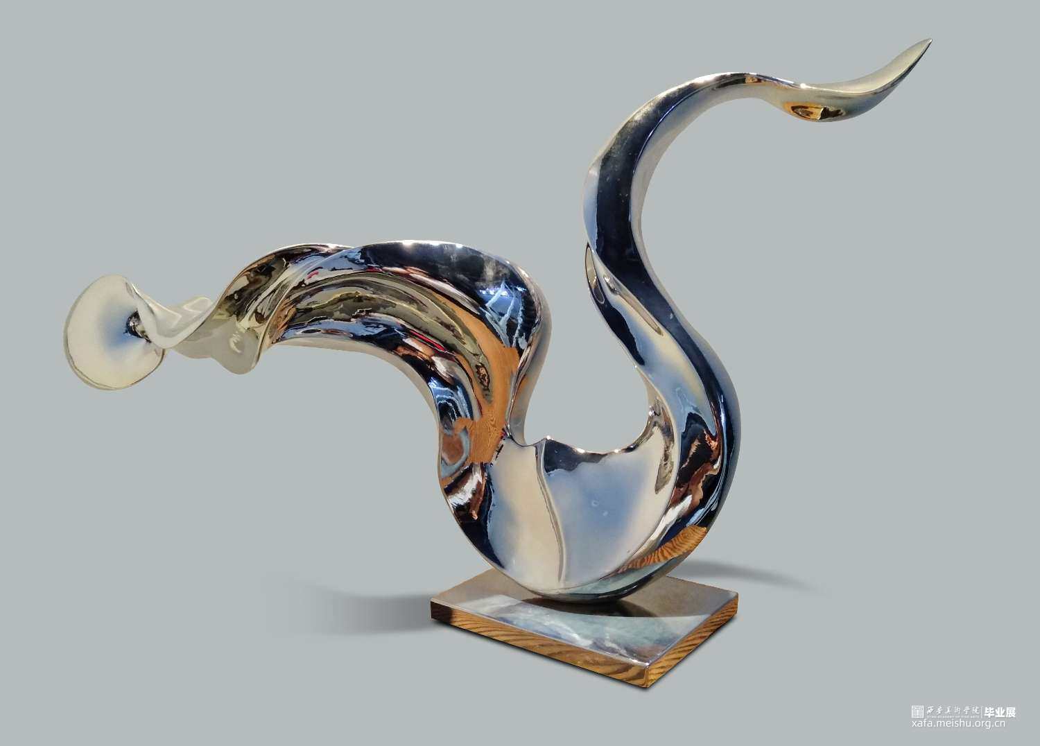 作品灵感来源于起风时飞舞的飘带。在处理作品外形轮廓时没有简单模仿飘带的外形,二是有选择的使用流畅的S型曲线来展现飘带的流畅性,把飘带抽象出来,展现一种灵动的身姿,又如起舞的舞娘一般。