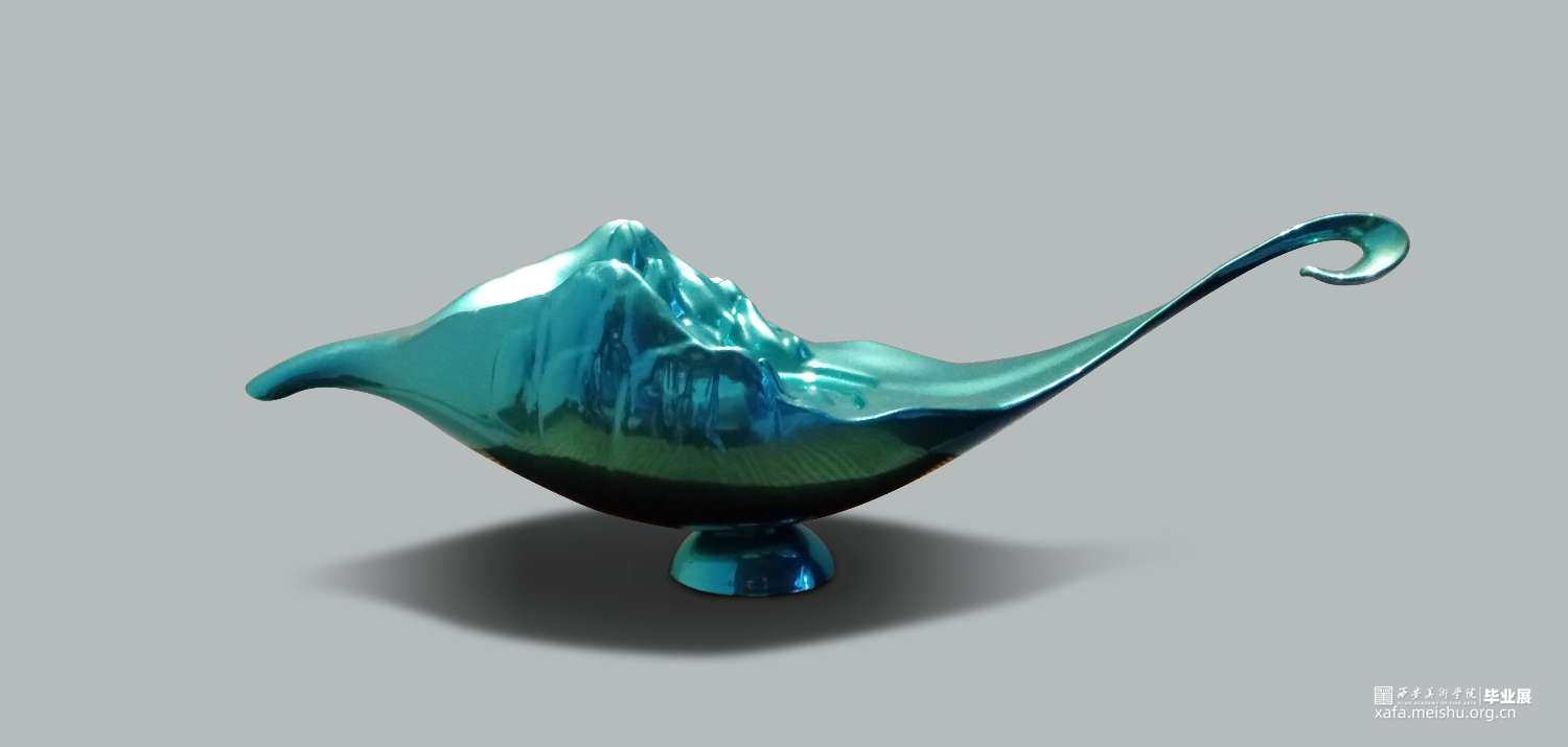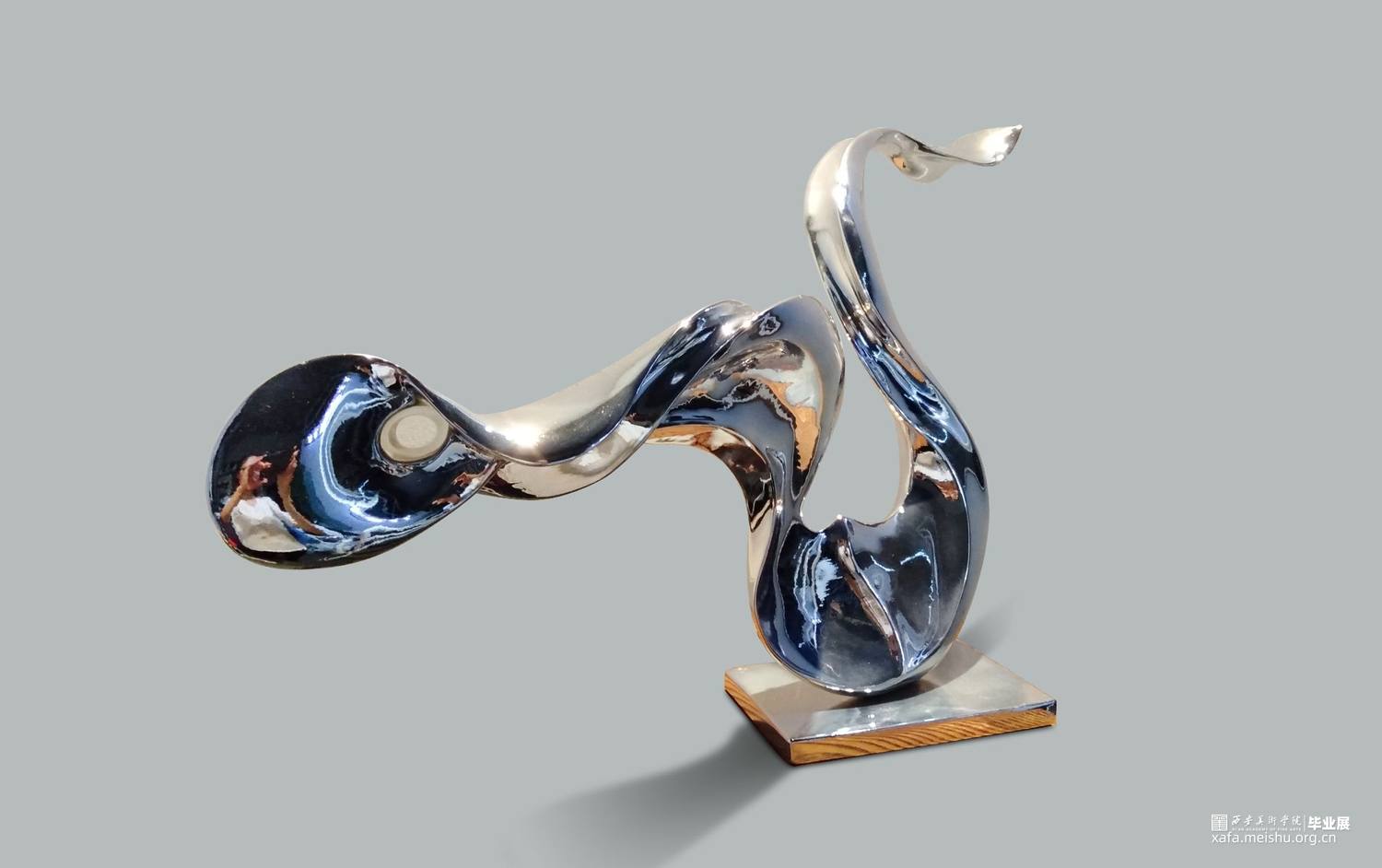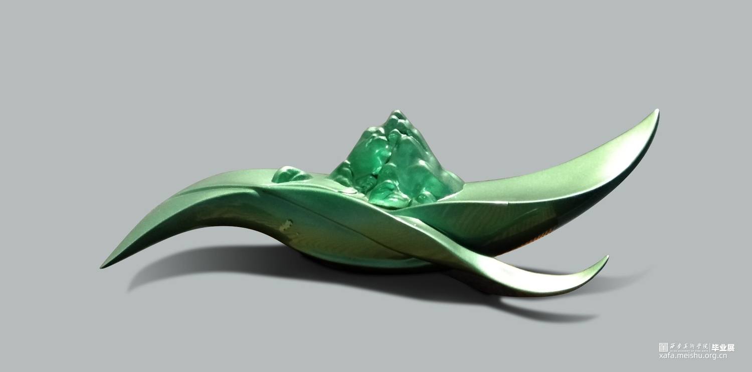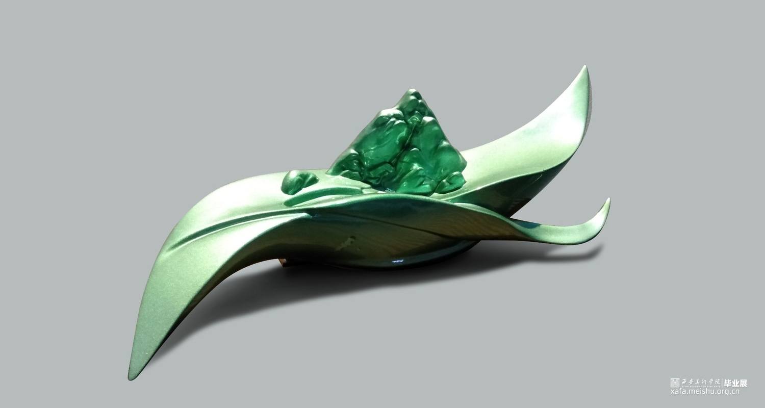 《漆物语》从自然界中的实物寻找灵感,如《漆物语之一》就是通过海螺的变形而来,通过灵动的线条表现山水之间的怡然风情。一汪清泉流淌之上,两面山峰依水而立。从最自然的形态抽象出灵动的线条和形式美感,融入场景之中,两者相得益彰,在饰以漆面的处理效果,弥补了不能使用大漆创作的遗憾。《漆物语之二》表现的也是山水之情。水自山间流出,而后经过山川湖泊,最后飘扬流淌与山势之外,与山间流水遥相呼应。作品整体造型来源于孤舟,山水泛舟而上,小舟灵动飘扬。