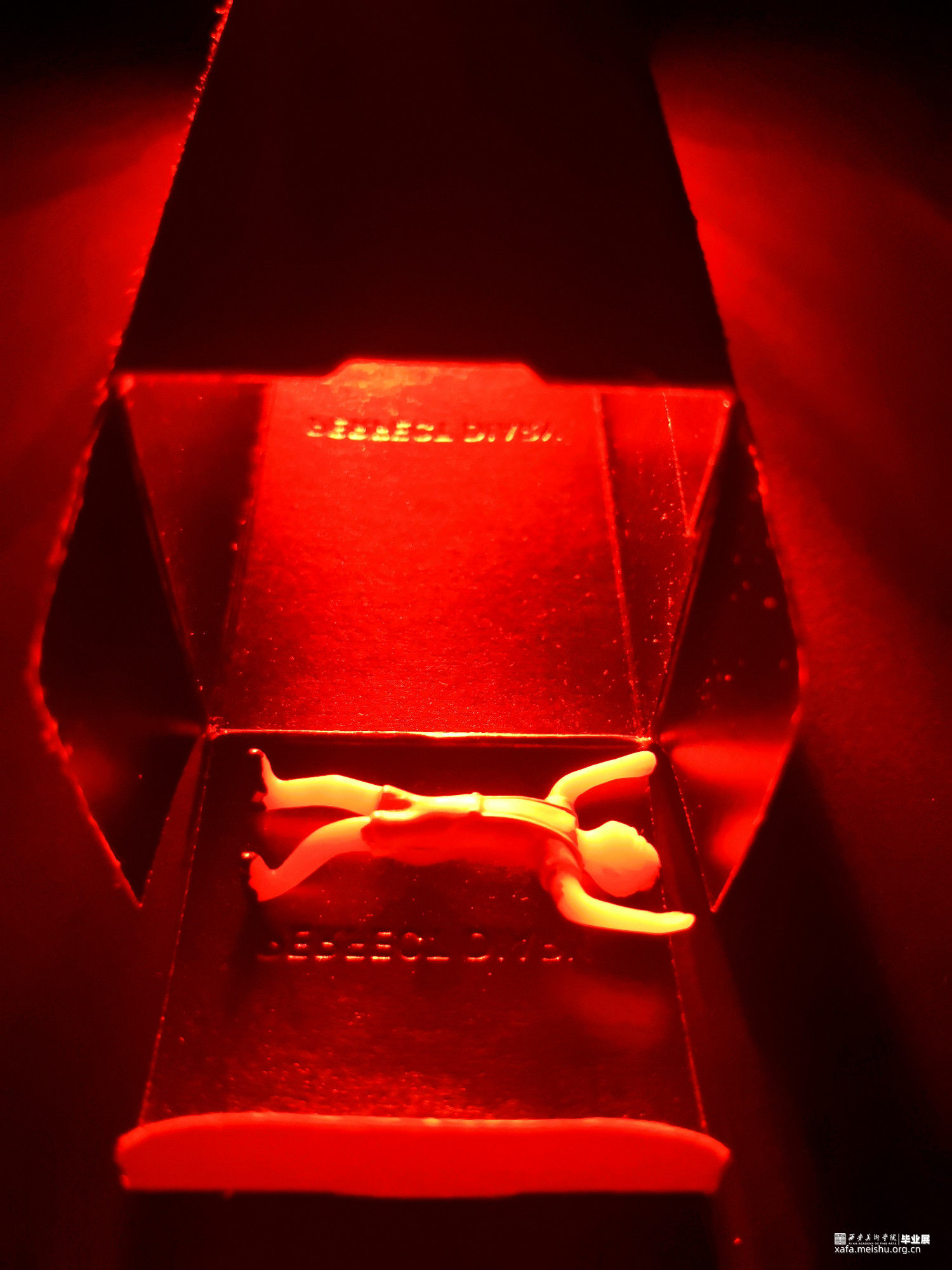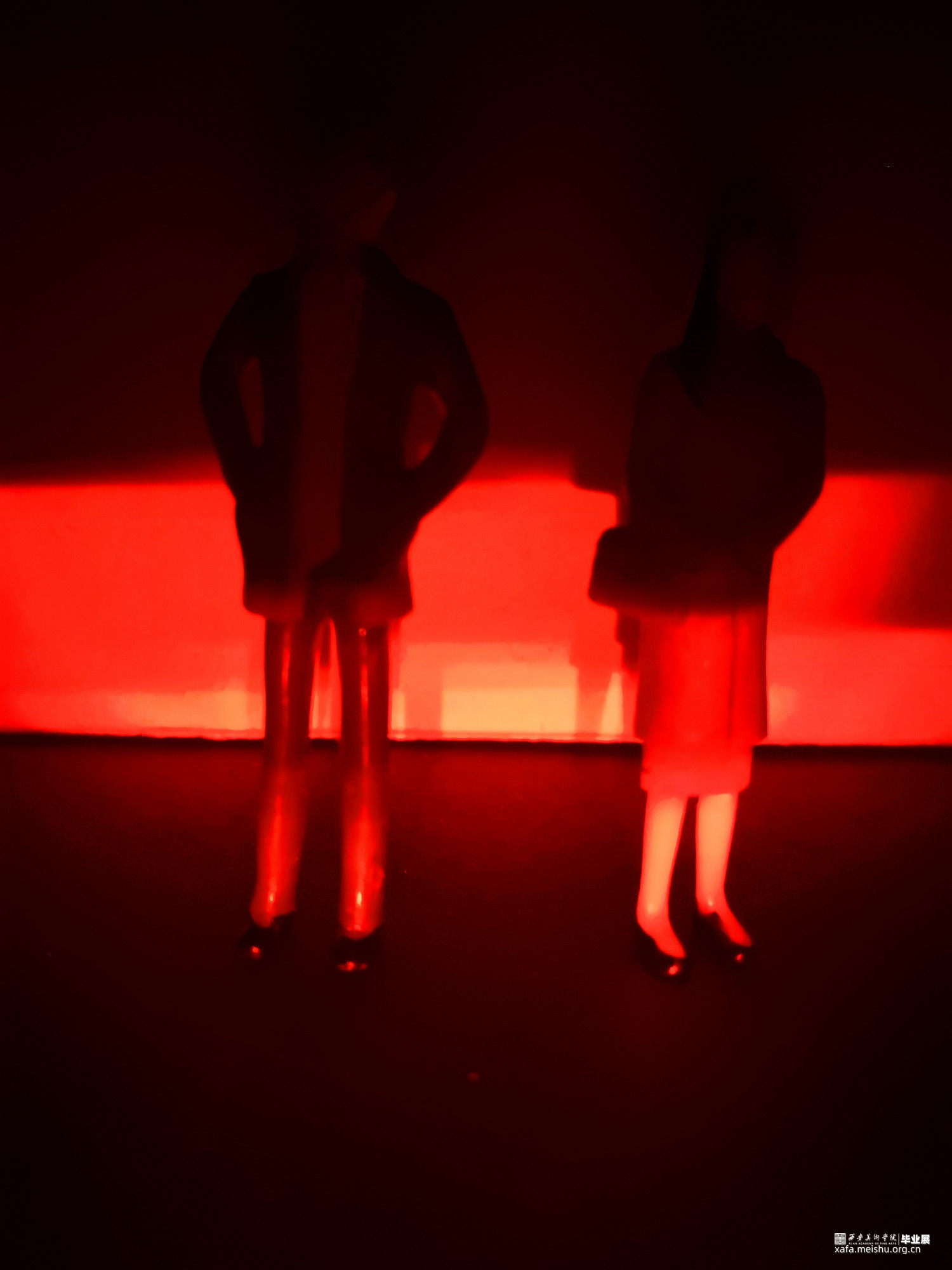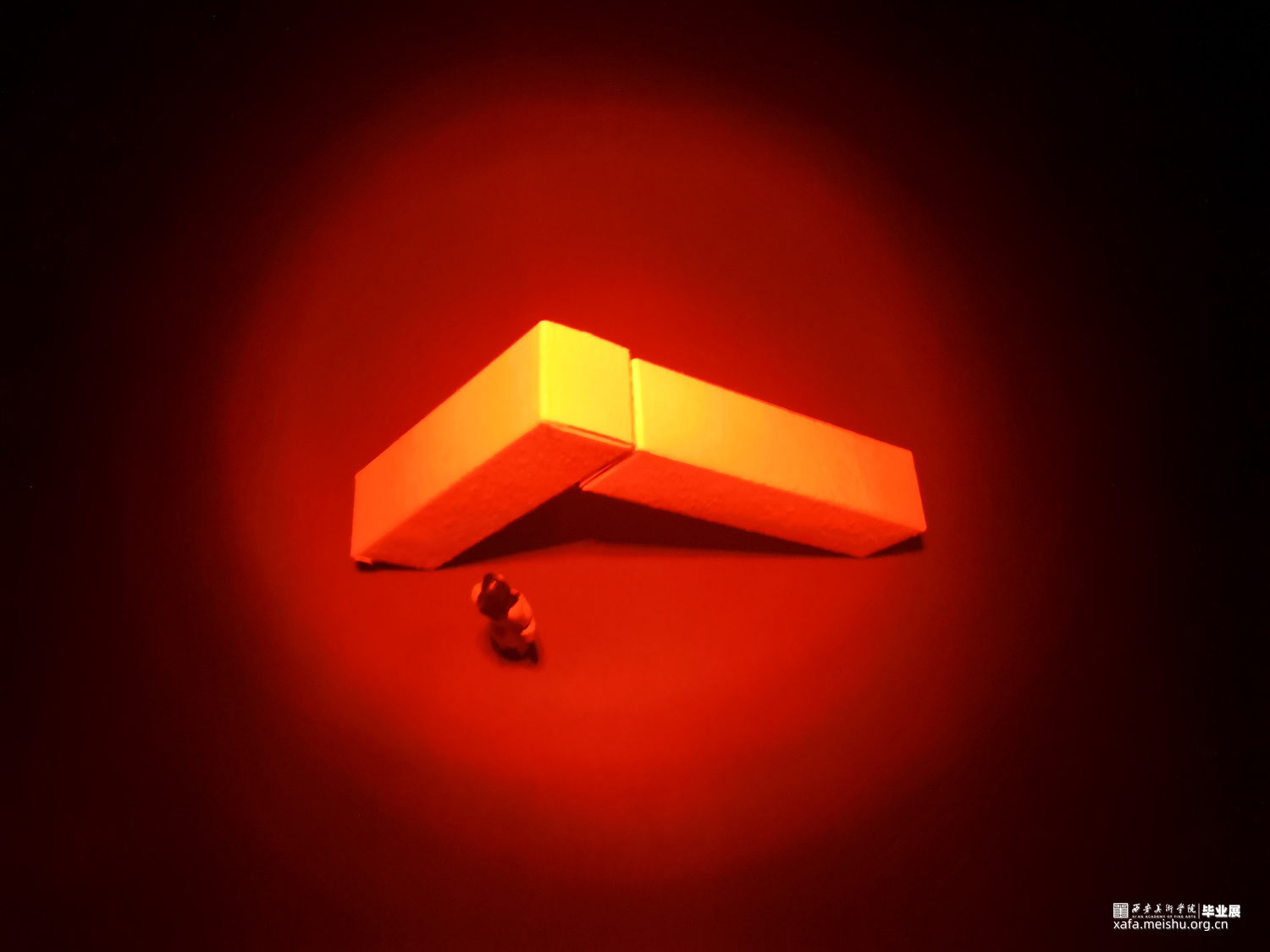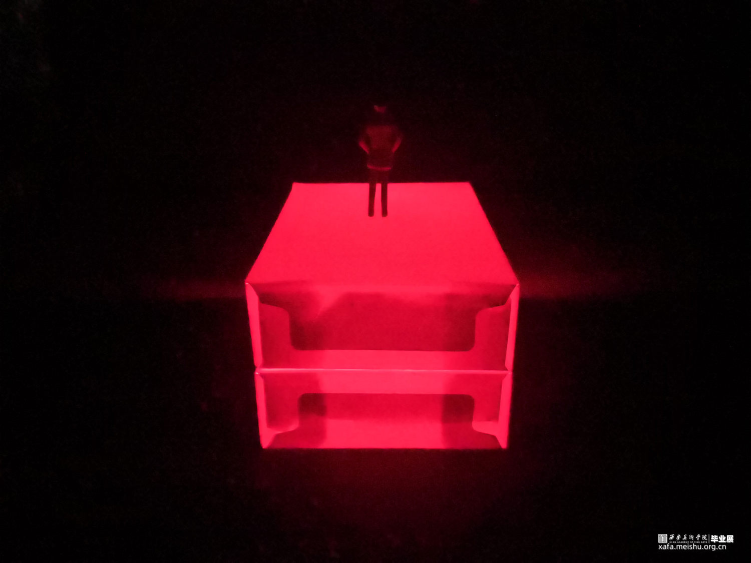 纸盒、小人与光影是折纸与纸盒的延伸实验,红色的灯光是我借用我爸铁路上使用的三色信号手电筒中红色的灯照射而形成的光影,红色在交通信号里代表禁止通行,红色同样具有强烈的视觉效果和使人兴奋的扩张色,在折纸与纸盒中我是用纸张本来的颜色去形成统一的人和人之间的关系,当颜色进入的时候,纸盒本身变得通透起来,人物关系在画面的氛围中显得有人情味道,同时又放大了疏离感。
