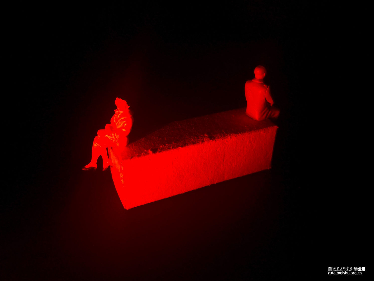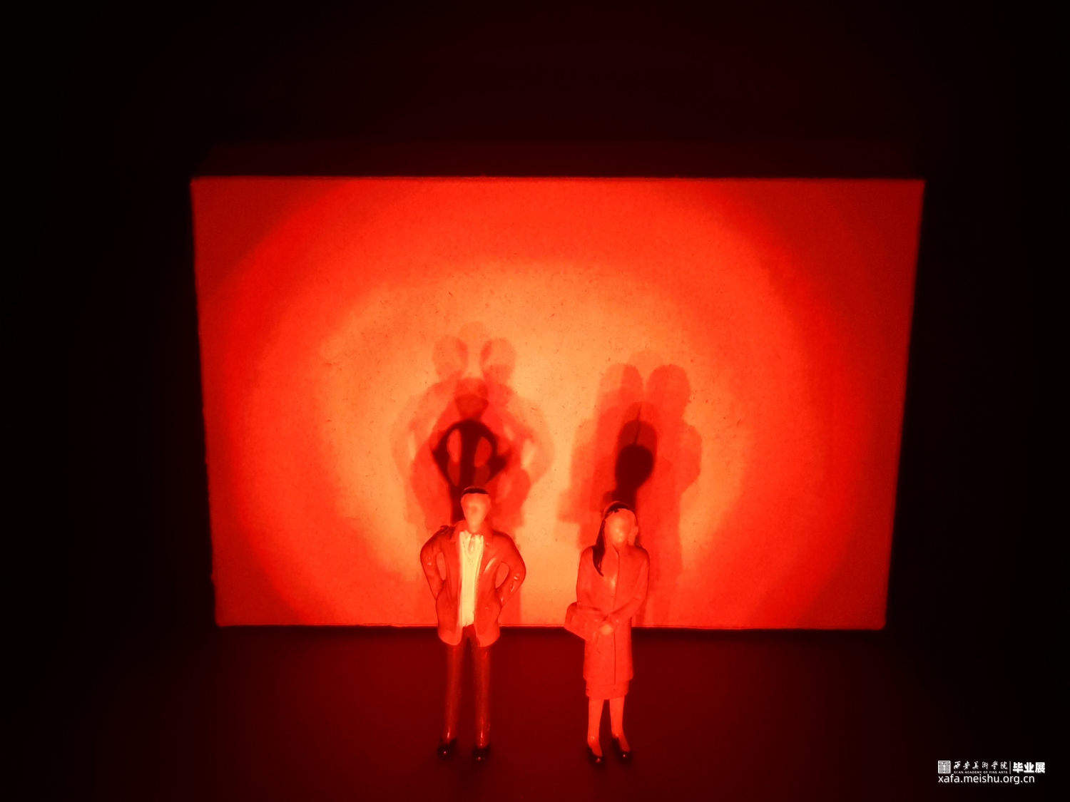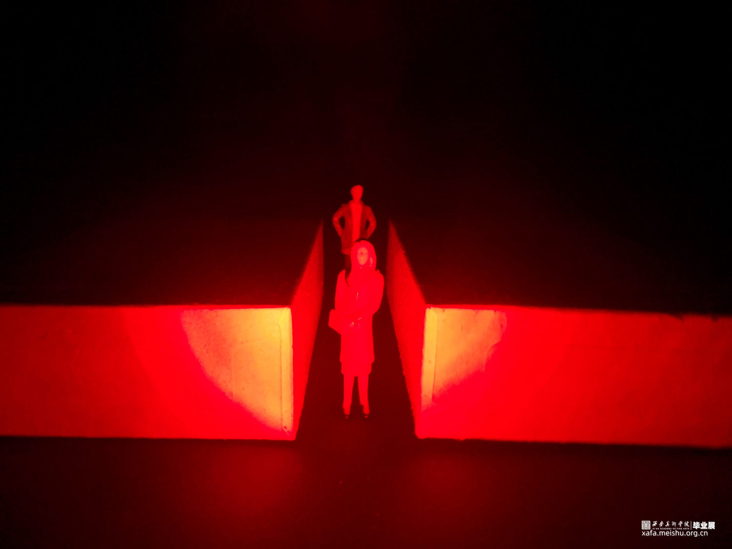纸盒、小人与光影是折纸与纸盒的延伸实验,红色的灯光是我借用我爸铁路上使用的三色信号手电筒中红色的灯照射而形成的光影,红色在交通信号里代表禁止通行,红色同样具有强烈的视觉效果和使人兴奋的扩张色,在折纸与纸盒中我是用纸张本来的颜色去形成统一的人和人之间的关系,当颜色进入的时候,纸盒本身变得通透起来,人物关系在画面的氛围中显得有人情味道,同时又放大了疏离感。